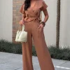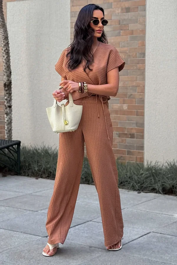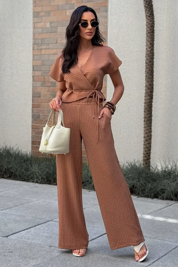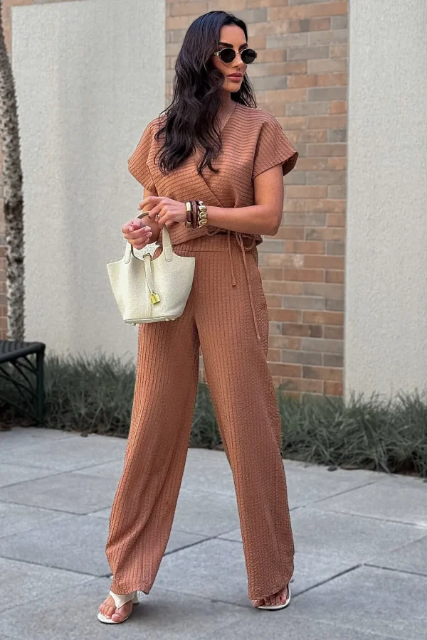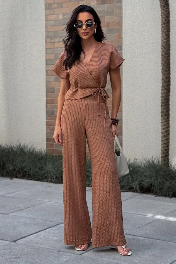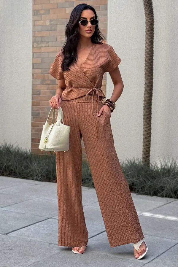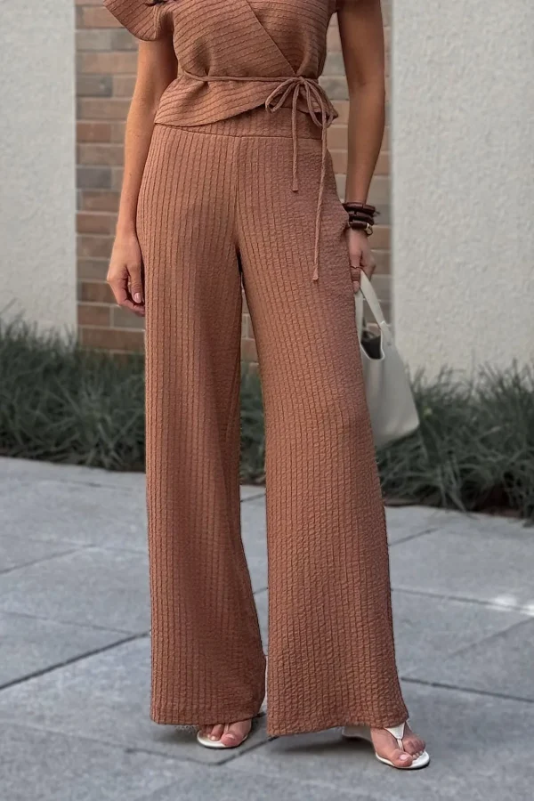 Avely – Tecido de malha Texturizada – Calça de modelagem reta com cós largo com elástico, proporcionando ajuste confortável e elegante. Possui bolsos laterais que reforçam a praticidade do look. Confeccionada em malha texturizada com caimento leve