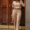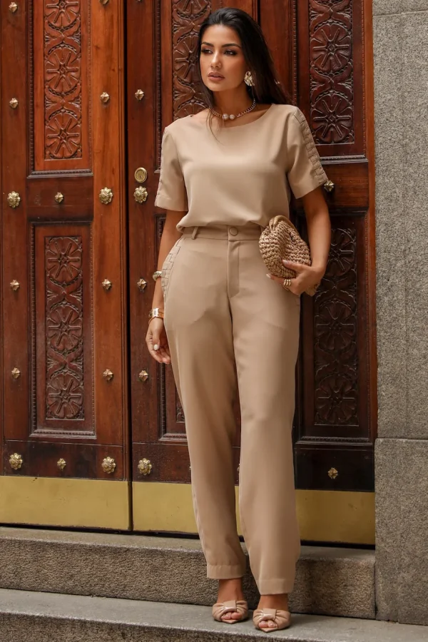 Calça confeccionada em tecido plano de ótimo caimento, que não amassa com facilidade, ideal para quem busca elegância prática no dia a dia. A modelagem reta alonga a silhueta e garante um visual alinhado e atemporal.