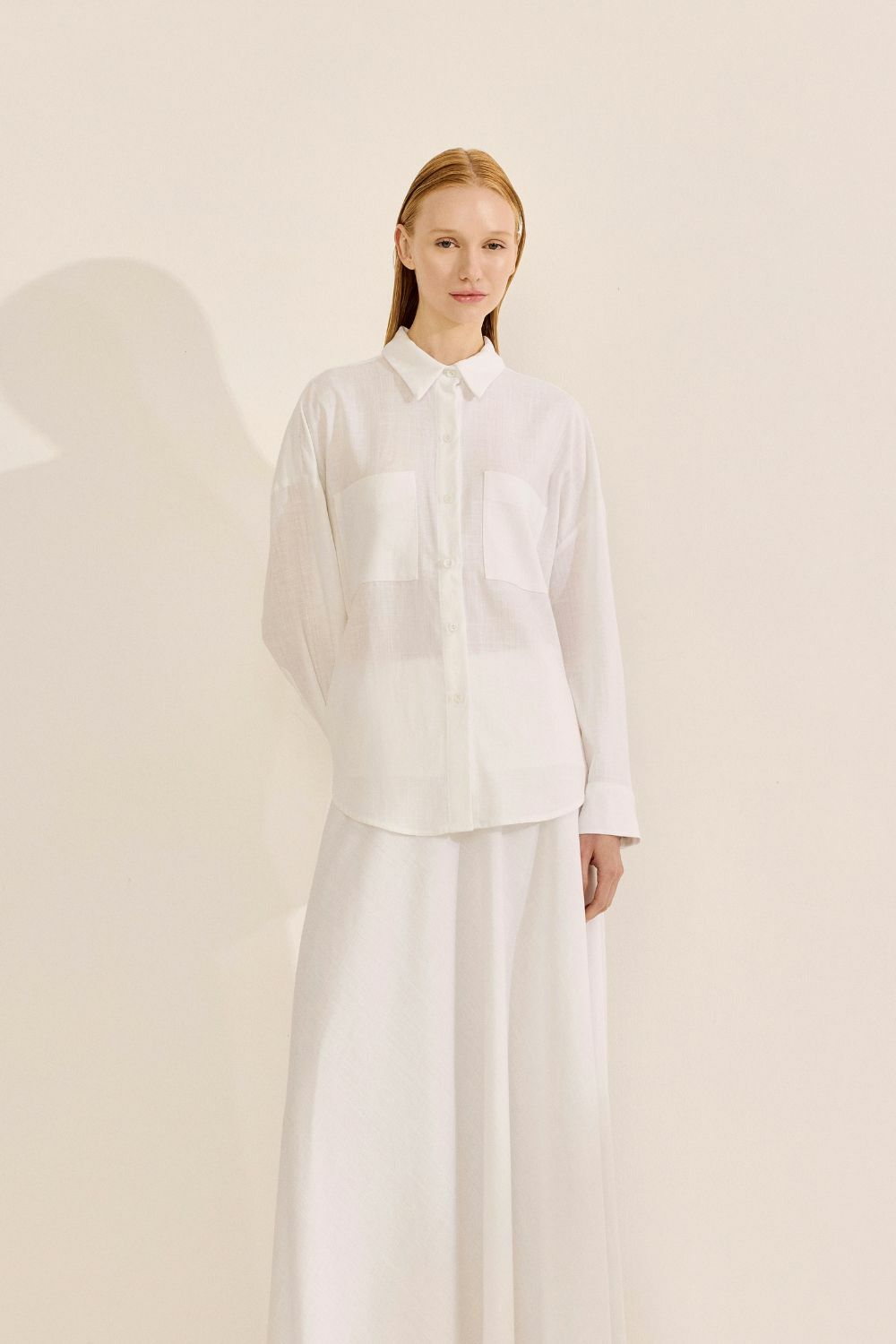 Ficha técnica: camisa confeccionada em linho misto, com composição de 85% viscose e 15% linho, modelagem clássica com cava deslocada, bolsos aplicados frontais, fechamento frontal por botões e prega nas costas para melhor caimento, sem forro, cor neutra sofisticada, peça de origem nacional, com cuidados de lavagem à mão ou em ciclo delicado, secagem à sombra e passagem em temperatura baixa para preservar a textura natural do tecido.