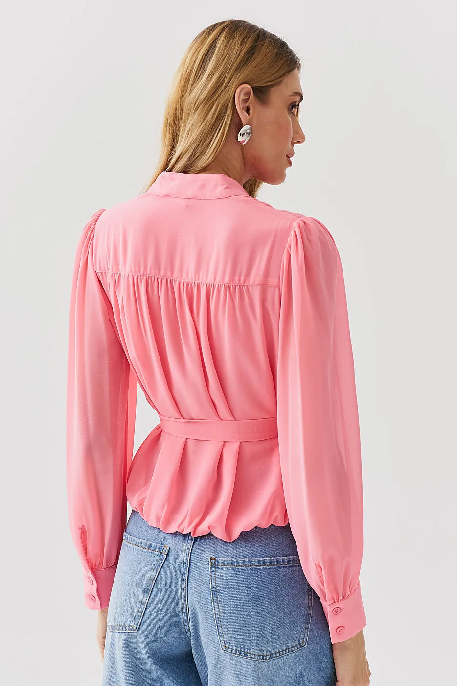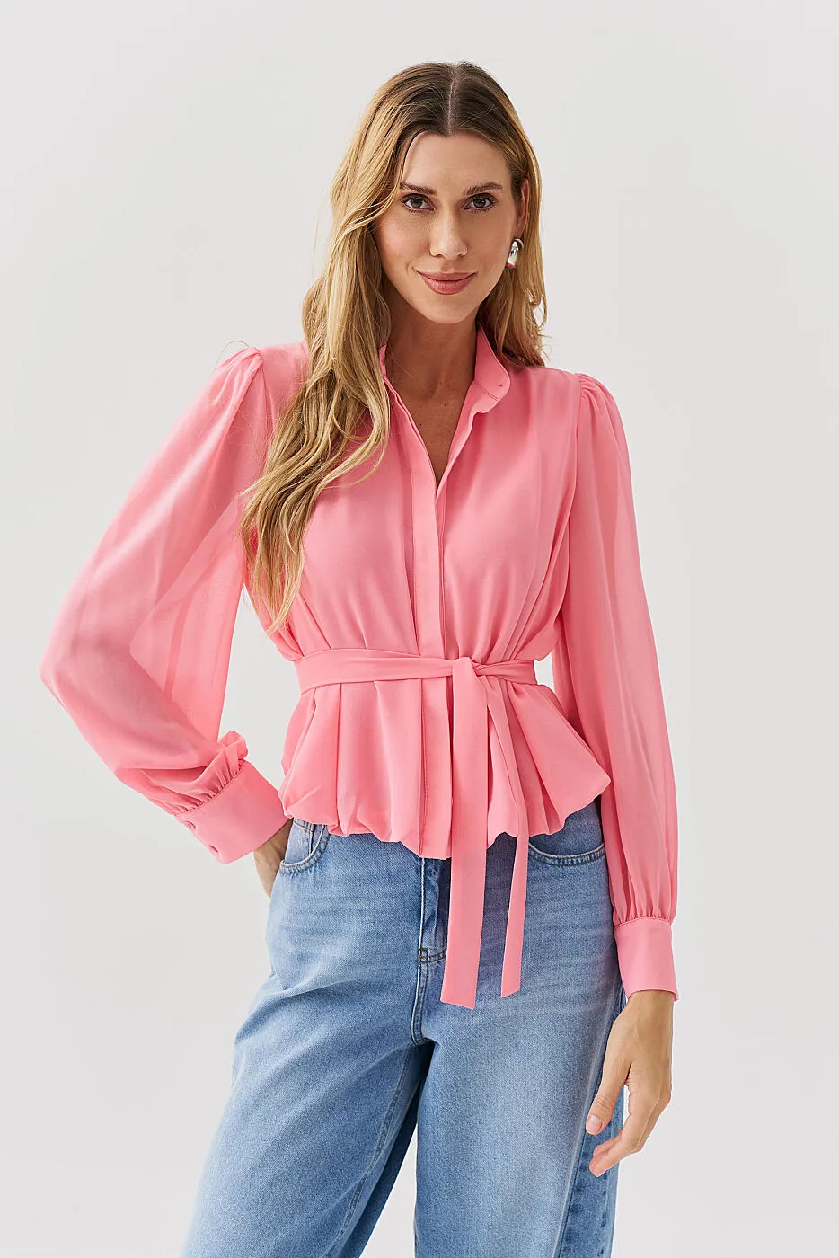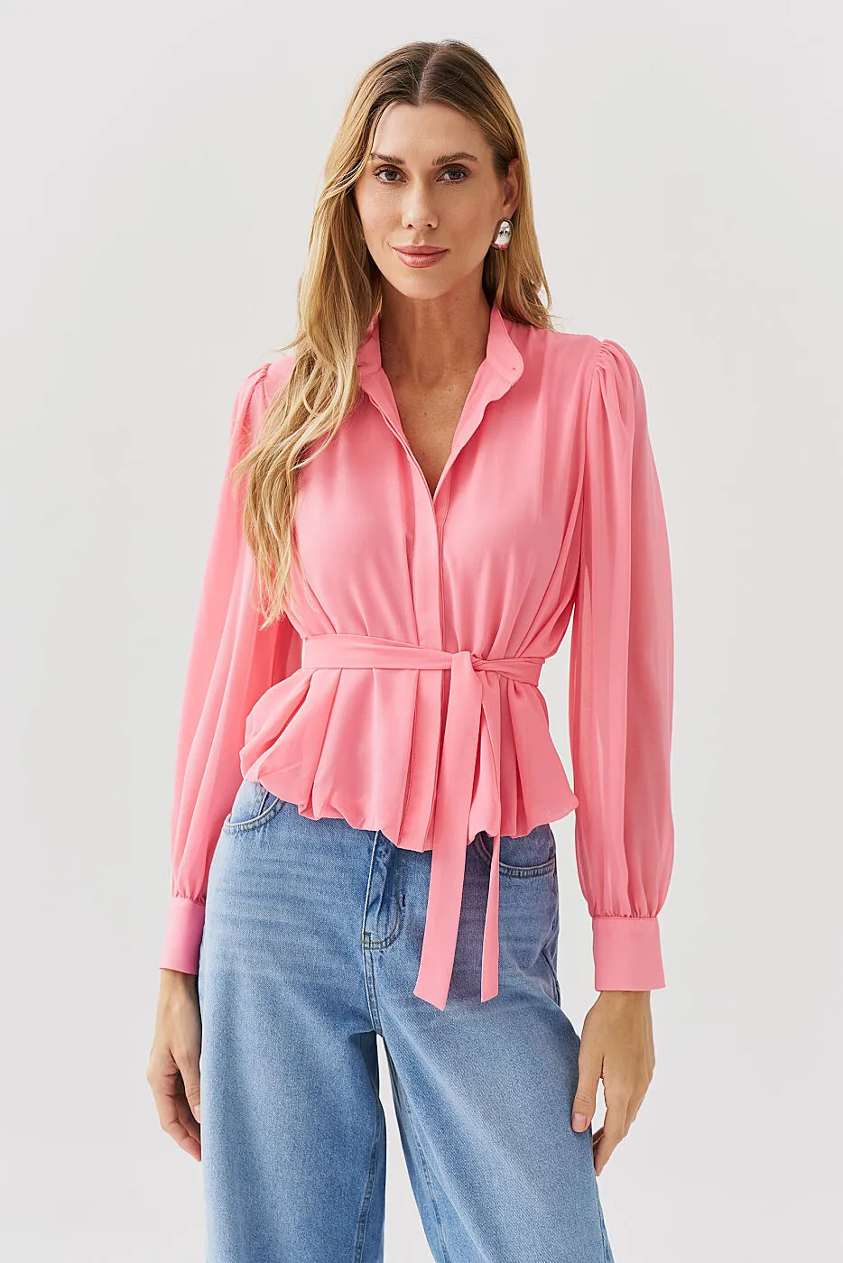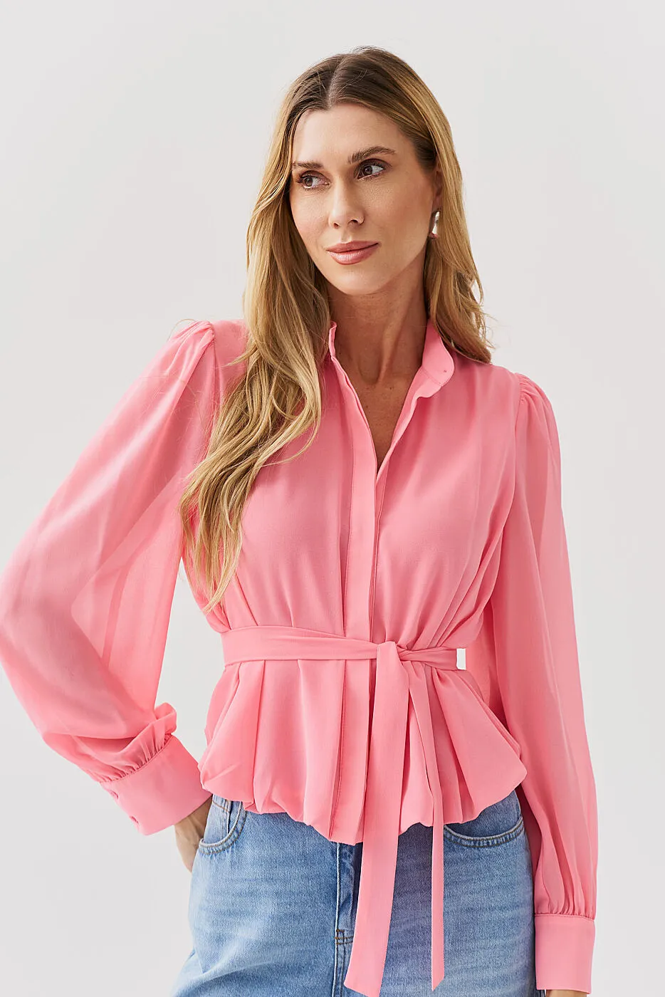 A Camisa Chiffon Balonê com Faixa Lenço é a definição de elegância com leveza 🌼. Confeccionada em chiffon fluido e delicado, a peça traz um caimento impecável e toque suave, perfeito para compor looks femininos e sofisticados. O recorte balonê adiciona volume sutil e movimento, enquanto a faixa tipo lenço para amarração na cintura realça a silhueta com um toque romântico. A vista dupla com botões frontais garante acabamento refinado e atemporal.