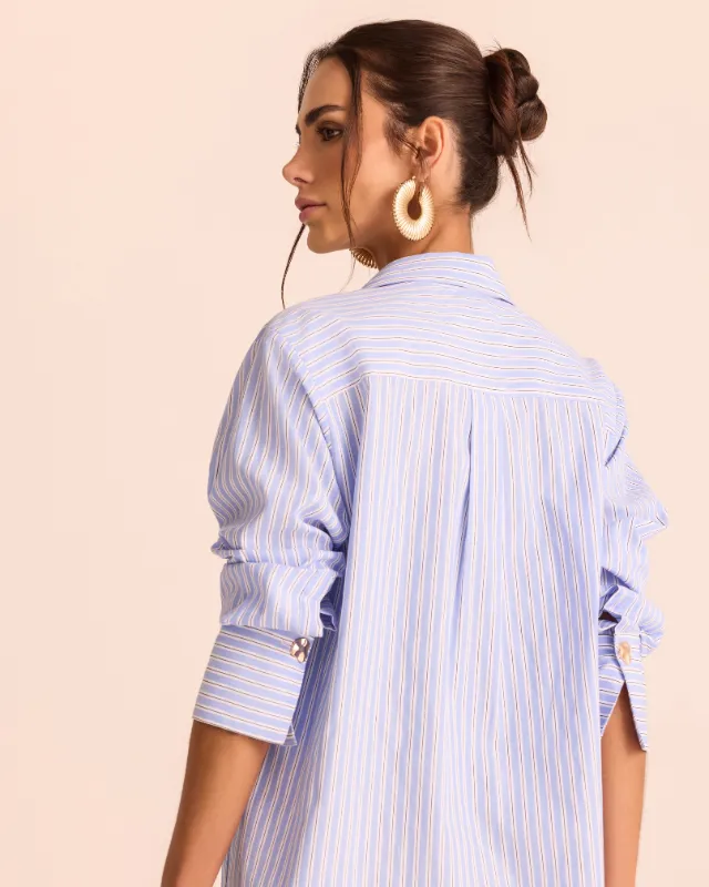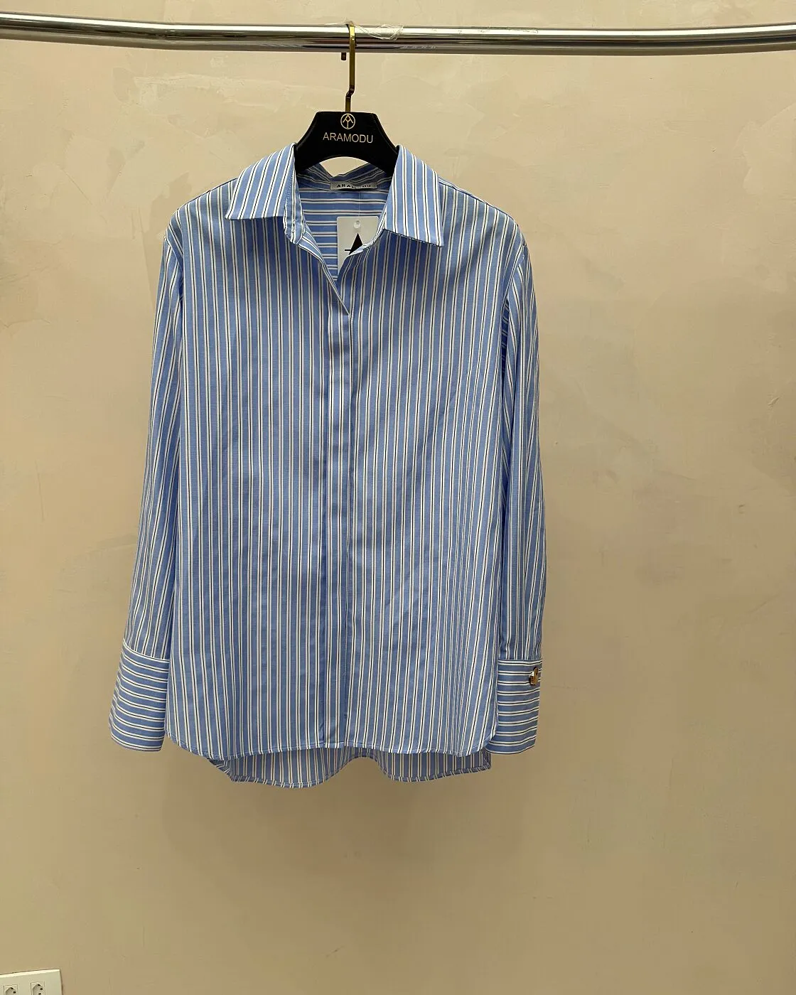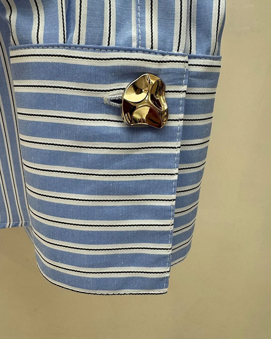 Clássica, elegante e com aquele toque contemporâneo que transforma o básico em sofisticado ✨🤍, essa camisa de tricoline listrada é uma peça essencial no guarda-roupa da mulher moderna. Confeccionada em tricoline de algodão com mistura de 55% algodão e 45% poliéster, ela oferece frescor, leveza e praticidade, com um caimento estruturado que mantém a aparência sempre alinhada ao longo do dia. A modelagem de manga longa, com punho comprido aviamentado, traz refinamento imediato ao visual, enquanto o destaque fica por conta do botão grande orgânico dourado, um detalhe de design elegante que adiciona personalidade e sofisticação à peça ✨. As listras clássicas alongam a silhueta e reforçam o ar atemporal da camisa, perfeita para acompanhar a rotina de trabalho, reuniões importantes ou produções mais casuais com aparência impecável 👩💼💙.