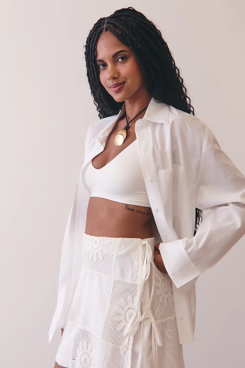 Dica de estilo: use aberta sobre um top branco e uma saia de renda ou crochê para um look moderno e feminino. Para uma proposta mais urbana, combine com calça de cintura alta, sandálias de tiras e acessórios dourados — o branco total ganha força e elegância em qualquer ocasião.