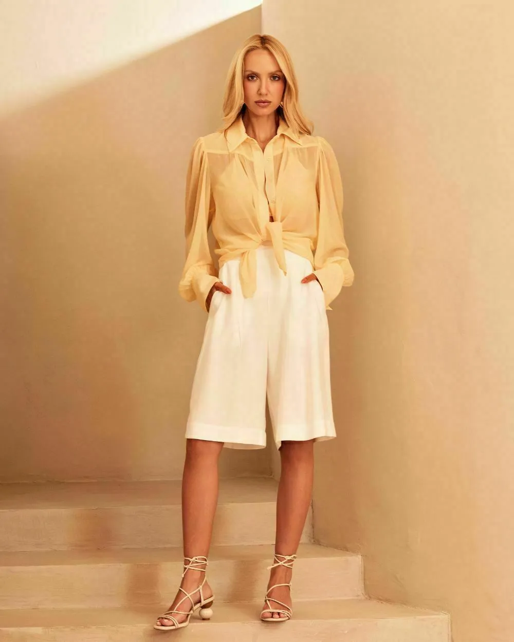 Ficha técnica: confeccionada em chiffon leve com padronagem poá, conjunto composto por camisa de mangas longas e top interno do mesmo tecido, não possui forro adicional além do top, modelagem solta com caimento fluido e acabamento delicado, cor amarelo suave com poás discretos, peça de origem nacional, recomenda-se lavar à mão com sabão neutro, não torcer, não usar alvejante e secar à sombra para preservar a leveza do conjunto feminino sofisticado.