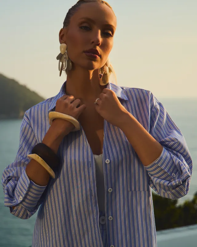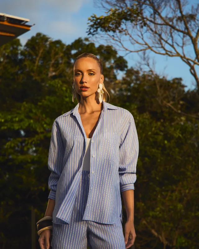 Dica de estilo 💡: use essa camisa listrada feminina com calça de alfaiataria no mesmo padrão para um look coordenado e sofisticado, ou combine com jeans de cintura alta e acessórios naturais para um visual moderno e descomplicado.