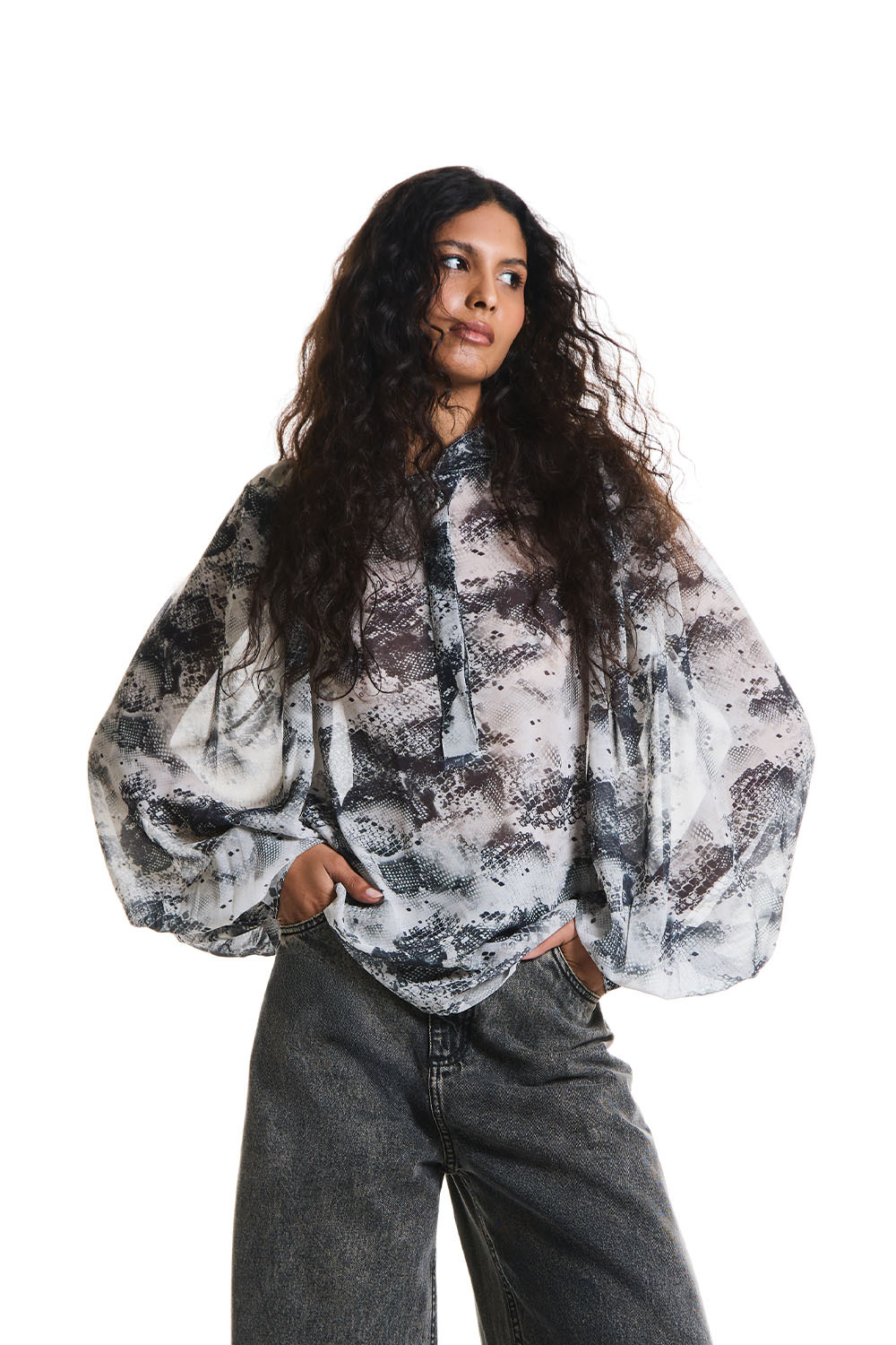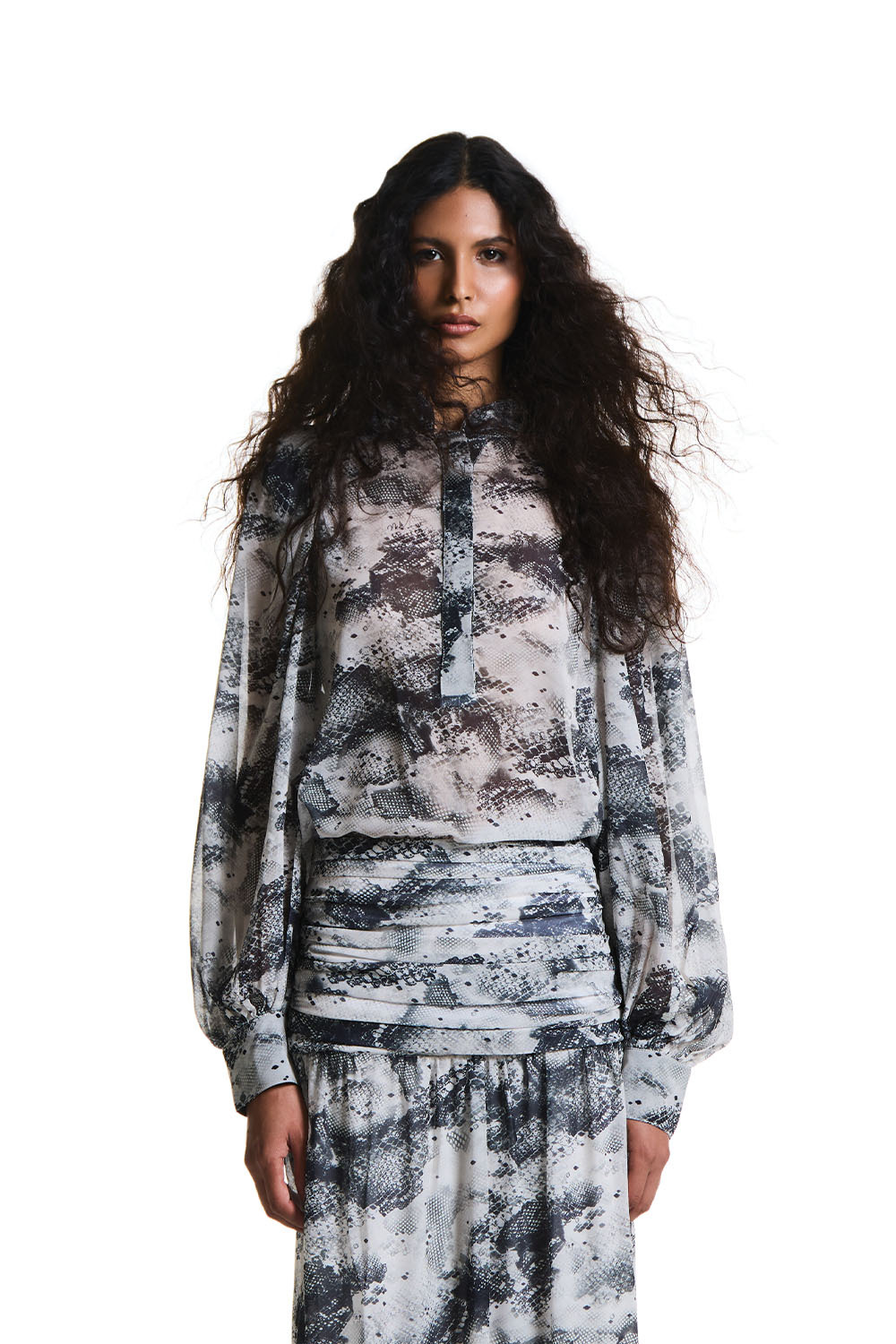 Ficha técnica: Camisa estampada em tecido leve e fluido, com modelagem solta, mangas amplas com volume, punhos estruturados e gola com abertura frontal. Cor em tons de cinza, preto e off-white. Composição do tecido, forro (se houver), origem e instruções de lavagem conforme etiqueta interna da peça. Recomenda-se lavagem delicada e seca à sombra para preservar a estampa