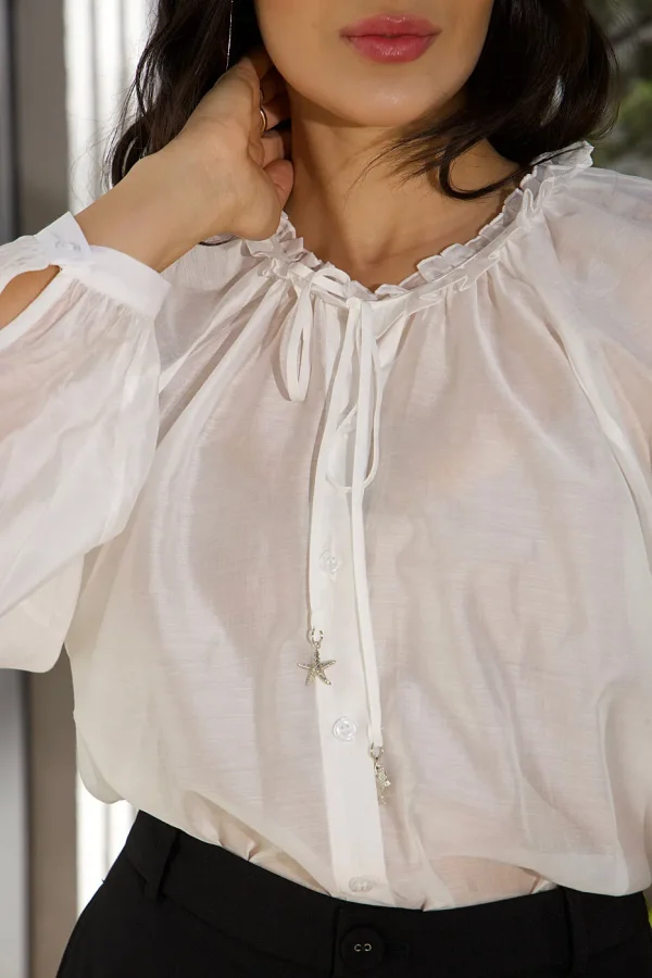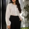 Lyocell Silk – Tecido com aspecto acetinado e com leve transparência – Camisa oversized com fechamento por botões, confeccionada em tecido leve que garante caimento fluido. Possui gola com babado decorativo e faixa para amarração com ponteiras metálicas