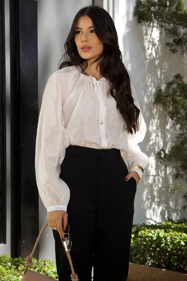Com modelagem ampla e caimento fluido, traz aquela elegância descomplicada que vai do casual chic ao look de trabalho. O detalhe no decote com amarração delicada e as mangas volumosas conferem charme extra, tornando-a uma peça única no closet.