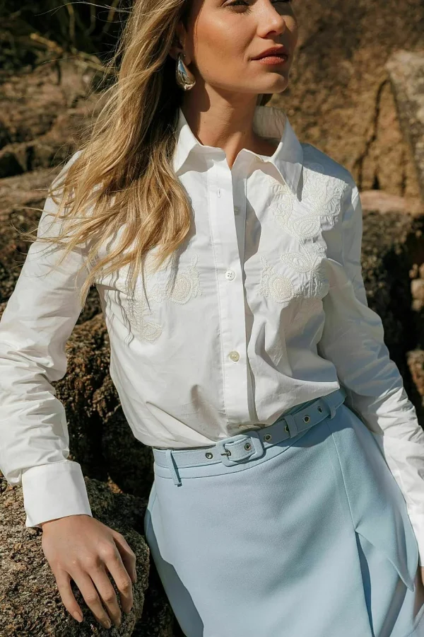 Clássica e cheia de personalidade, a camisa em tricoline 100% algodão ganha um toque especial com o bordado contrastante na parte da frente. O tecido natural confere frescor e conforto, enquanto a modelagem com mangas longas, punhos estruturados e fechamento por botões traz elegância atemporal. Uma peça que equilibra a sofisticação do estilo alfaiataria com a delicadeza do detalhe bordado.
