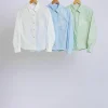 Camisa em tricoline manga longa. Detalhe de bordado contrastante na frente. Punhos com abotoamento e fechamento frontal por botões.
