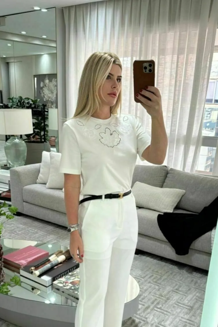 Delicada, atemporal e extremamente versátil 🤍✨, essa camiseta de malha em algodão é daquelas peças curingas que elevam qualquer produção com facilidade. O bordado floral localizado traz um toque feminino e sofisticado, desenhado com sutileza para iluminar o visual sem excessos 🌸. Confeccionada em 100% algodão, a malha tem toque macio, respirável e confortável, perfeita para acompanhar a rotina de mulheres práticas e elegantes, que precisam se sentir bem o dia todo. A modelagem reta, com caimento leve ao corpo, mangas curtas e comprimento ideal, permite usar tanto por dentro quanto por fora da peça de baixo, garantindo um visual sempre alinhado. A cor off-white adiciona frescor e sofisticação, funcionando como base perfeita para looks de trabalho, encontros ou momentos mais descontraídos, sempre com aparência refinada e atual ✨👩💼.