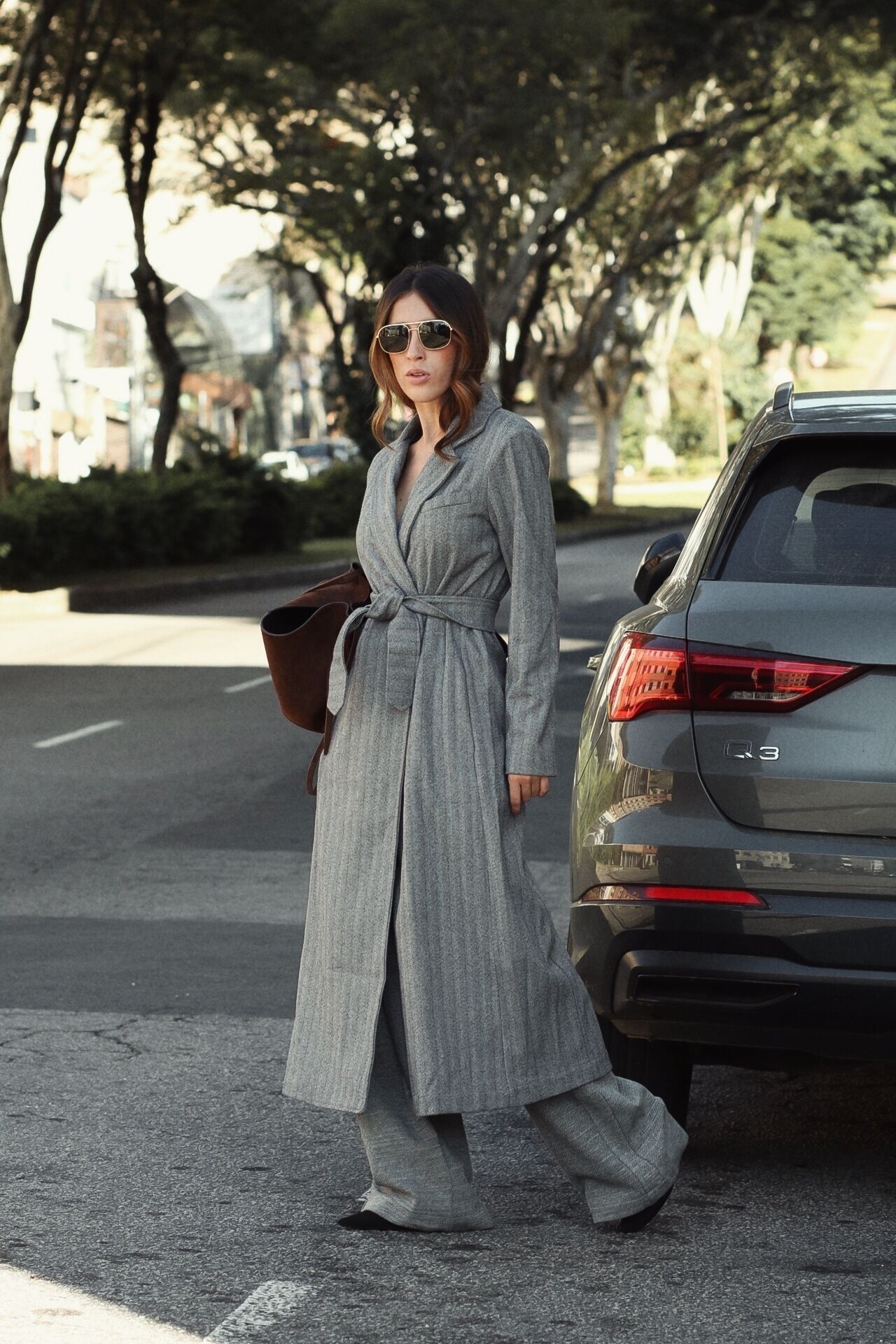Casaco longo confeccionado em tecido estruturado com padronagem clássica espinha de peixe. Conta com faixa para amarração na cintura, proporcionando ajuste e elegância, além de fechamento frontal com botões forrados que reforçam o acabamento refinado da peça. 100% poliéster, forro 100% poliéster.