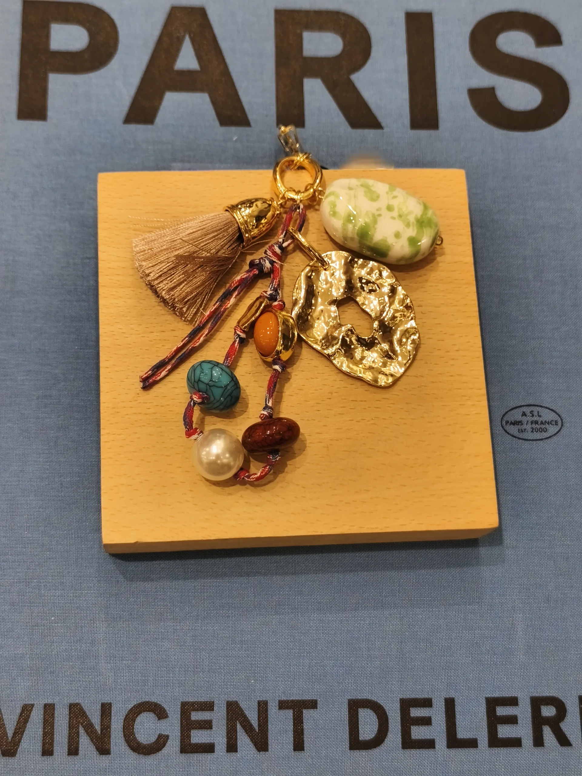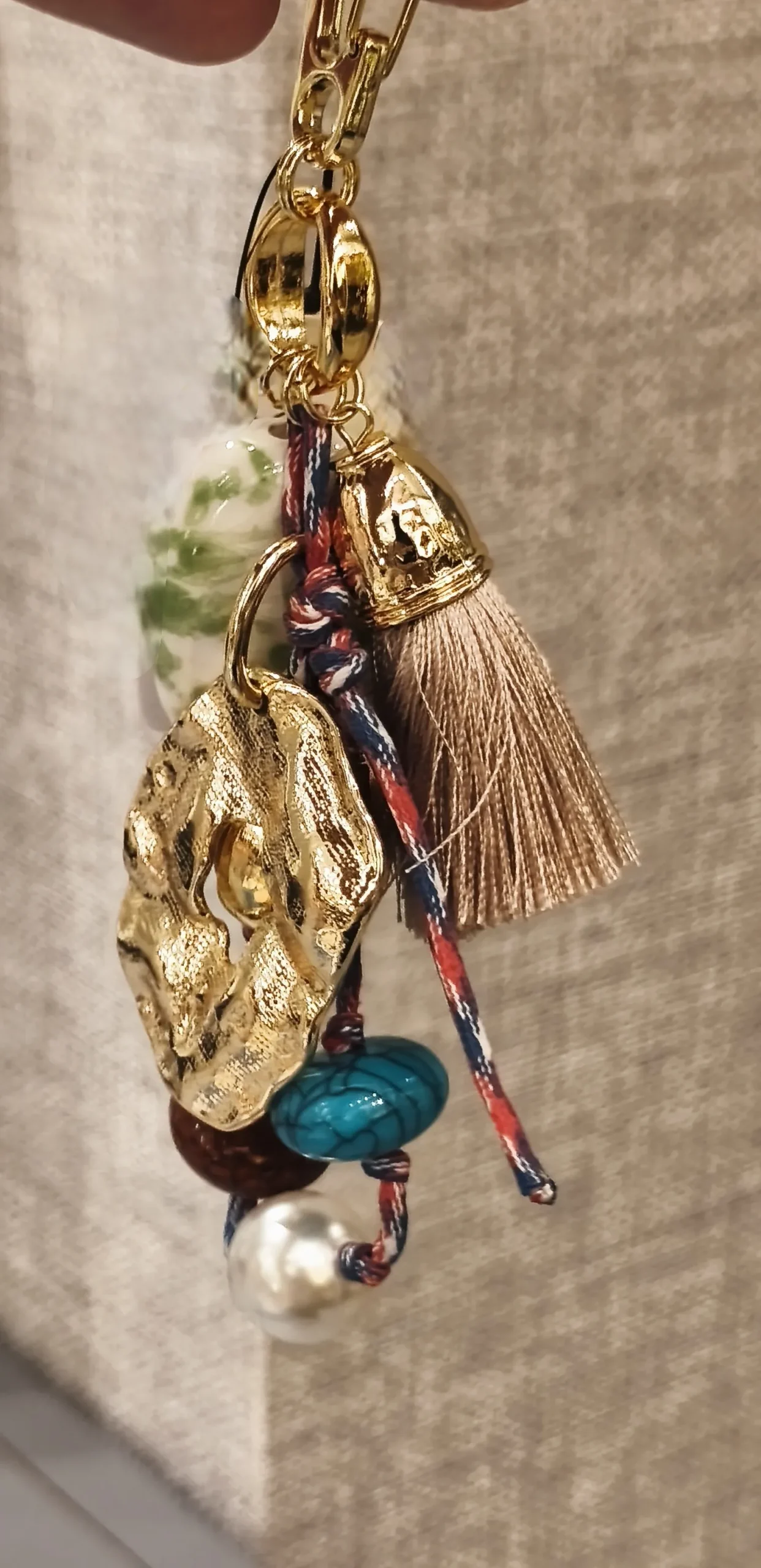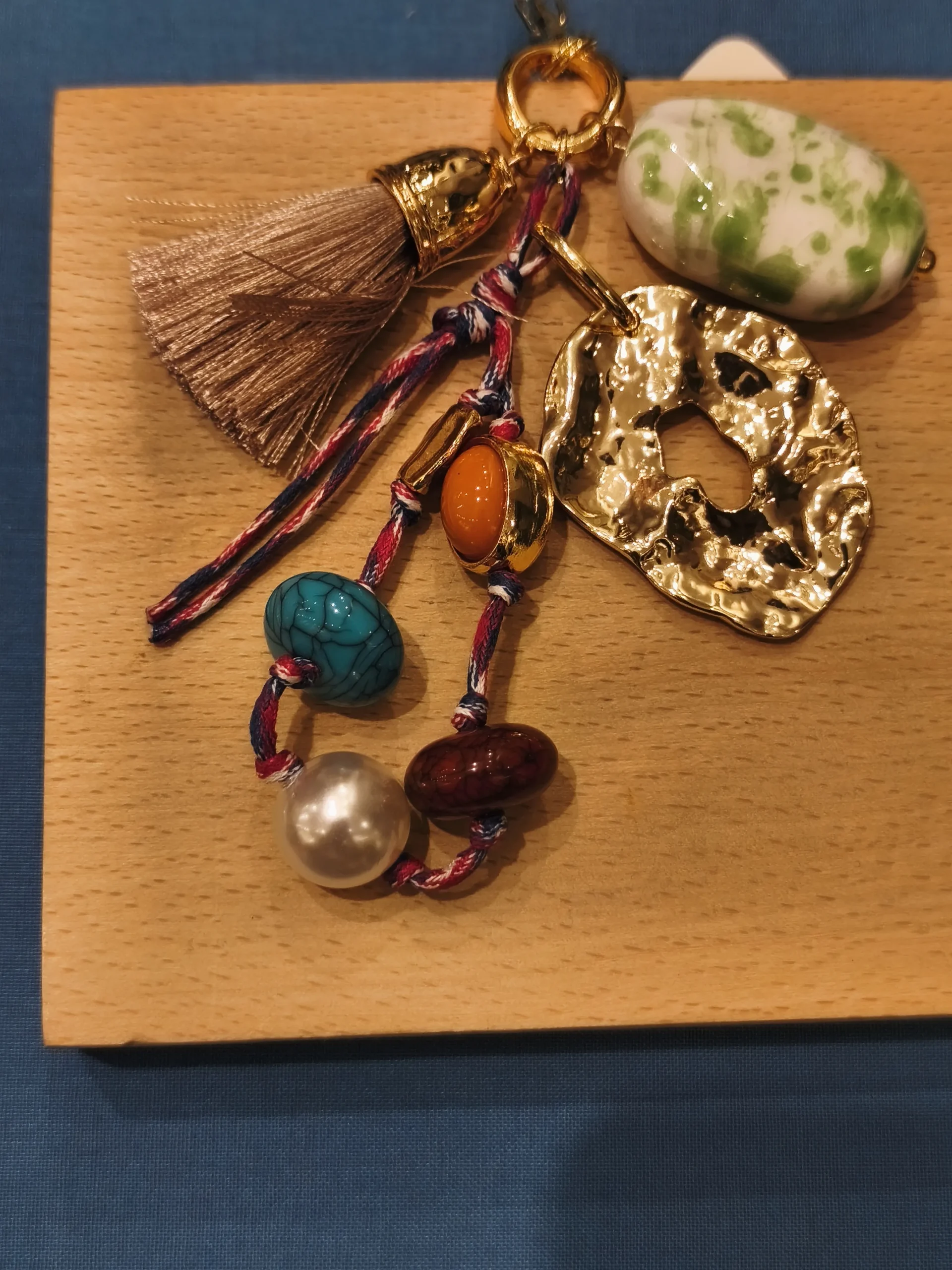 Dica de estilo: pendure-o em bolsas de couro caramelo, marrom ou nude 👜✨ — esses tons neutros realçam as cores das pedras e o brilho do dourado, criando um contraste elegante.