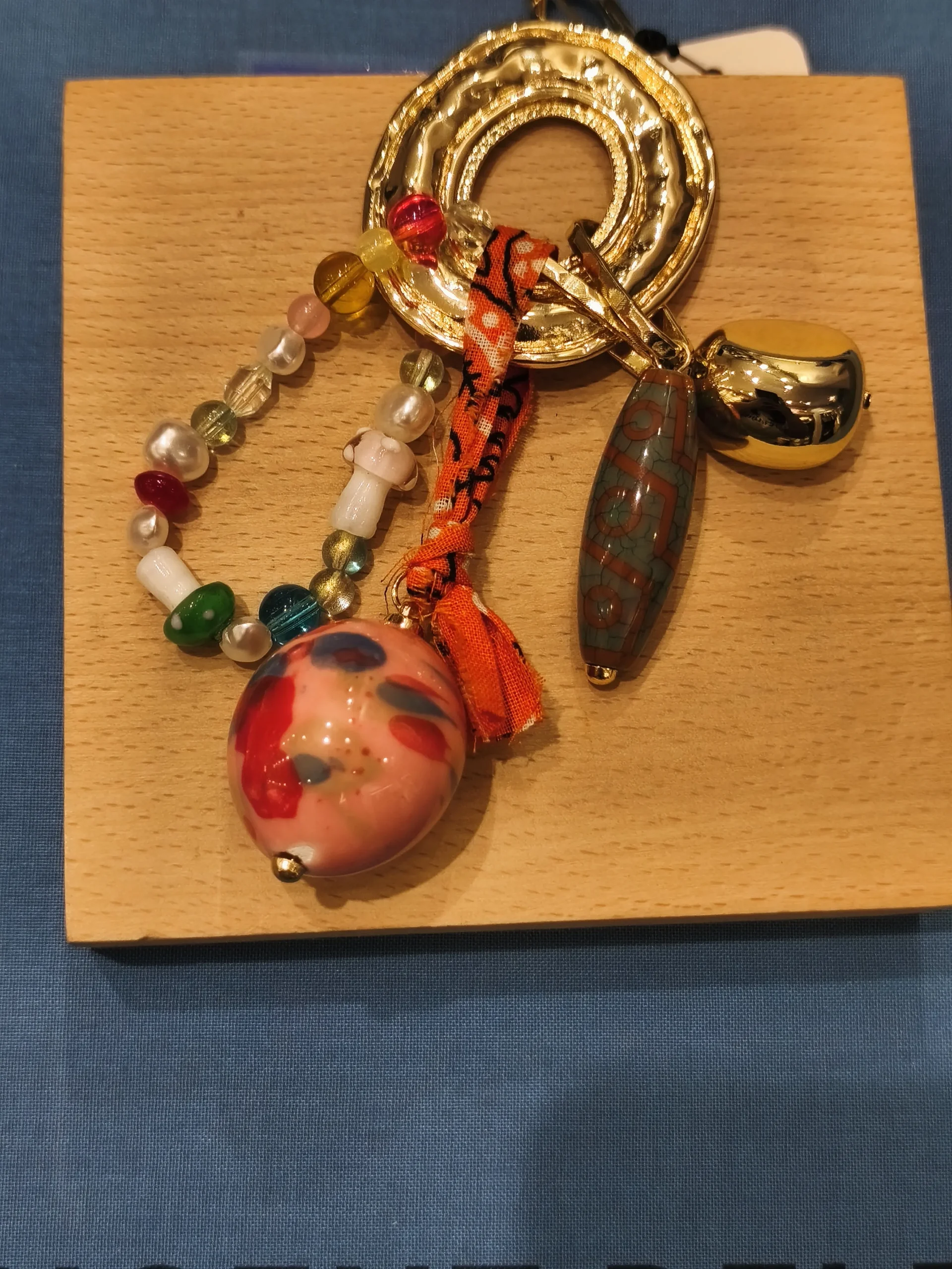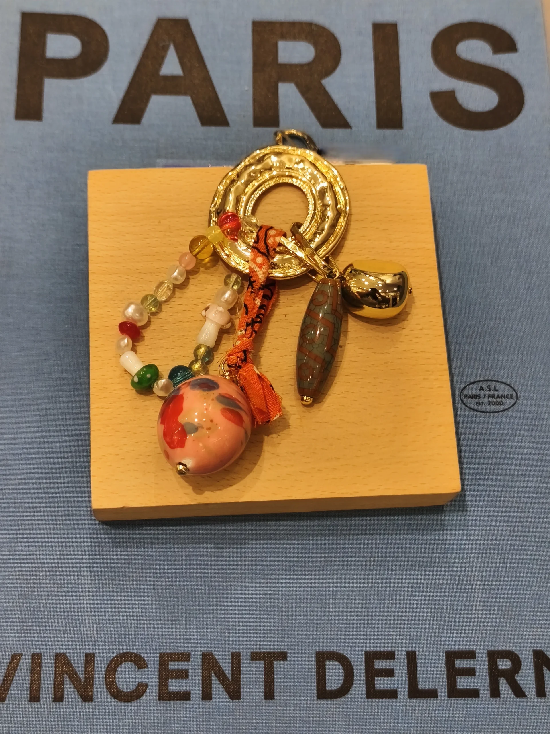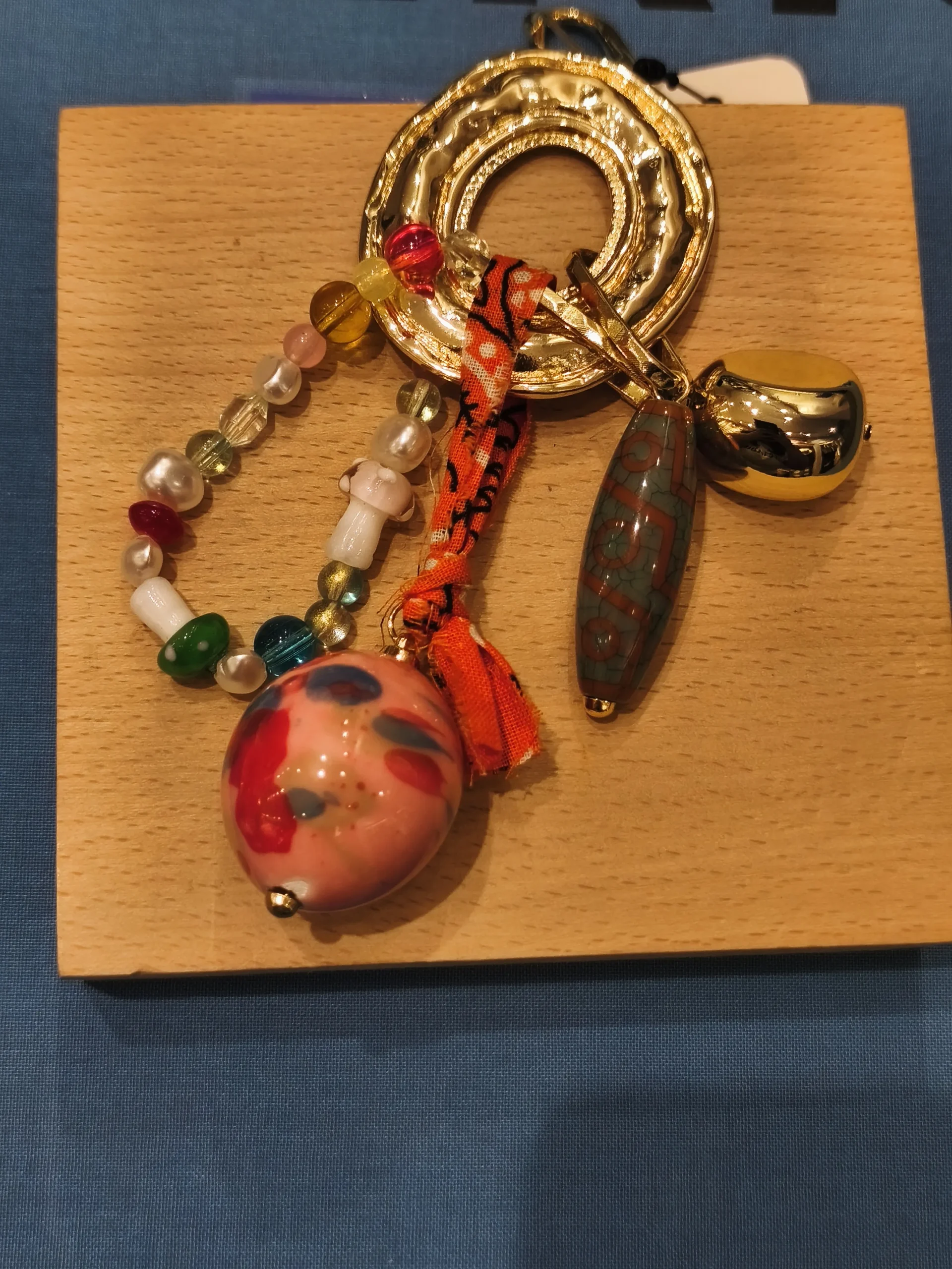 Este chaveiro dourado em metal é aquele acessório cheio de personalidade que transforma até os detalhes mais simples do dia a dia ✨. A base circular dourada traz presença e brilho na medida certa, enquanto os pendentes coloridos criam um contraste vibrante e divertido: contas multicoloridas em tons de vermelho, verde, branco e âmbar; uma peça maior em rosa mesclado que adiciona um toque artístico; e um pingente alongado em metal escuro que equilibra a composição com um ar sofisticado. O mix de texturas e formas deixa a peça moderna, descontraída e com uma estética quase artesanal — perfeita para mulheres que apreciam acessórios únicos e cheios de estilo.