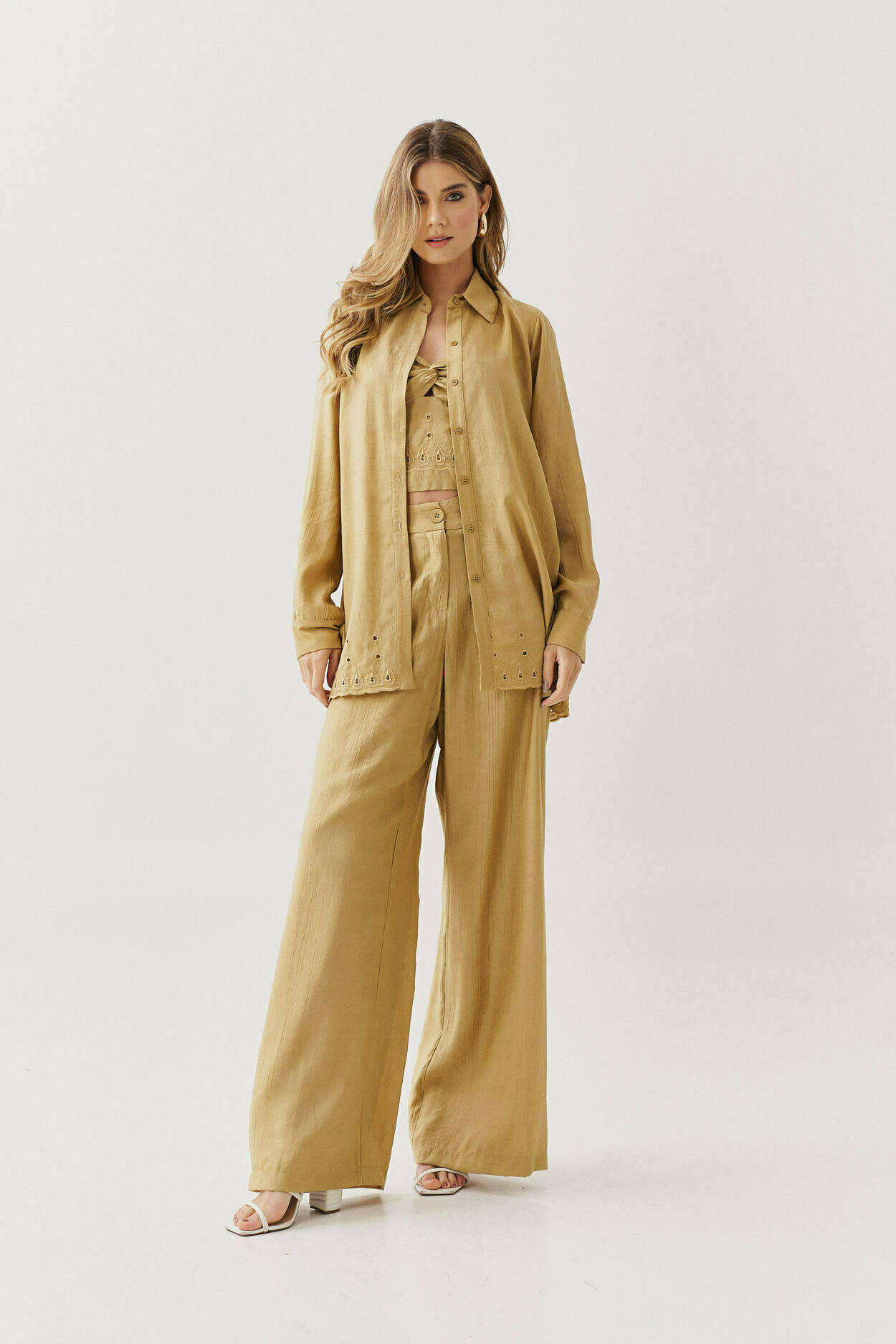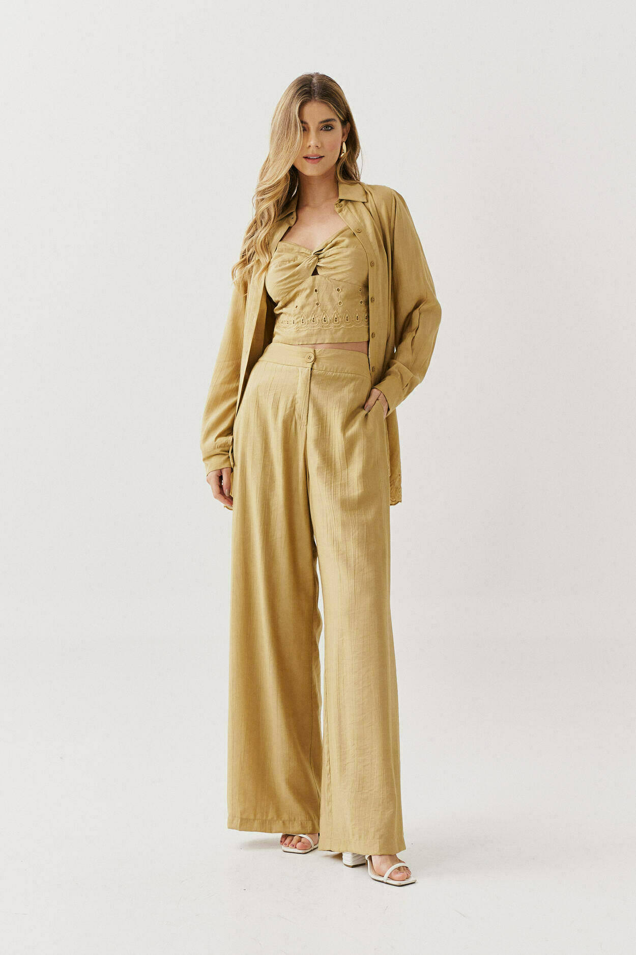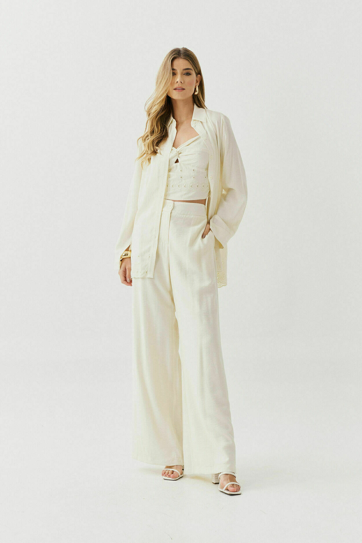 Conjunto de três peças com camisa de barrado bordado, top com torção no decote, detalhe bordado no barrado, alças reguláveis, elástico nas costas e calça pantalona com bolsos nas laterais.