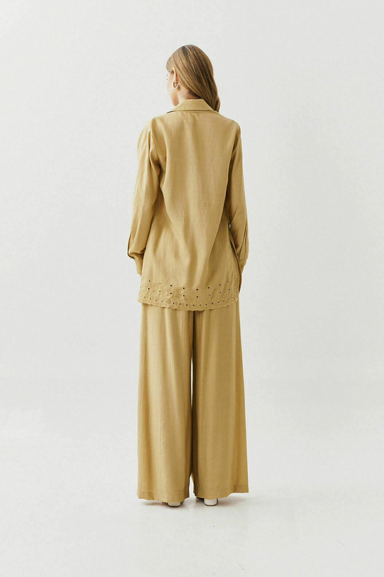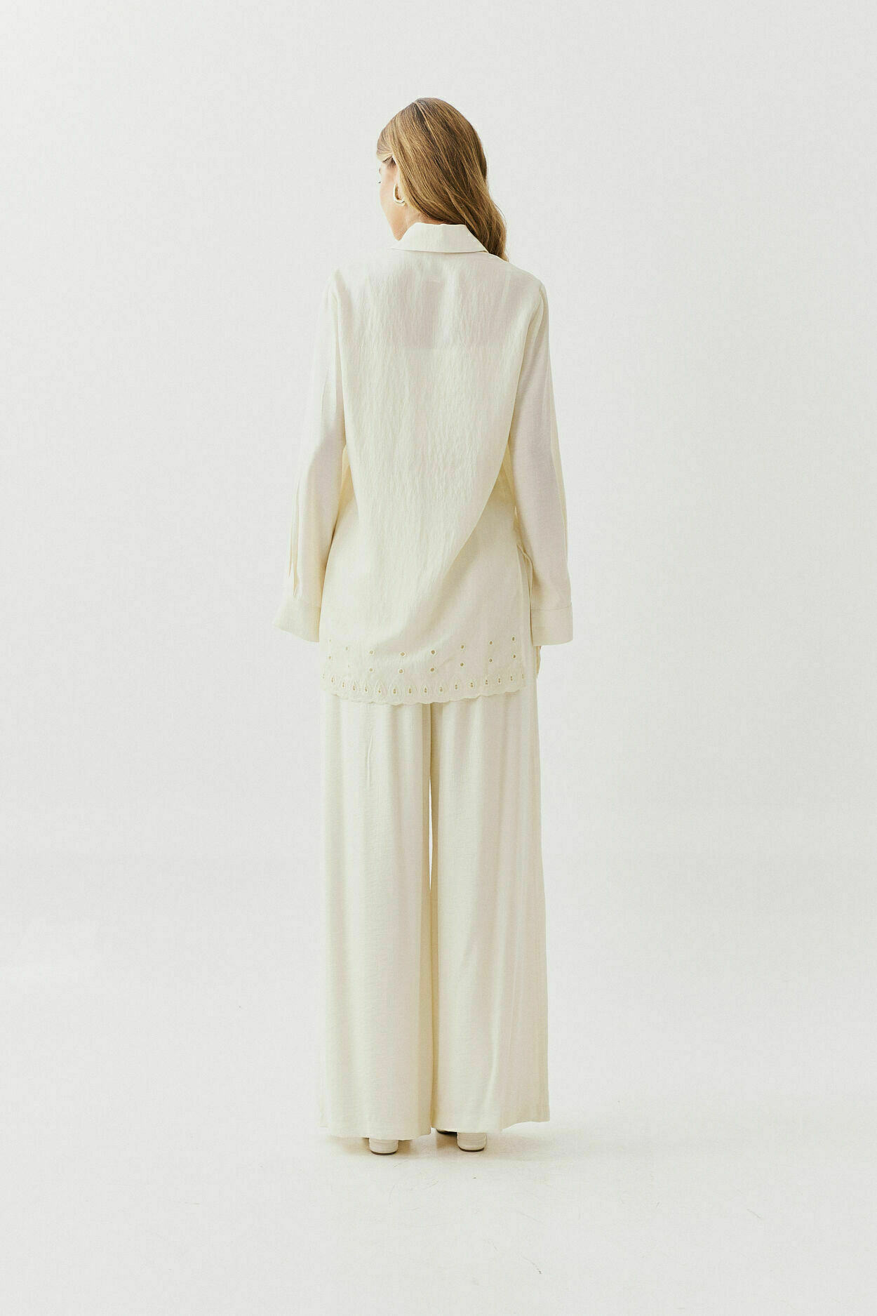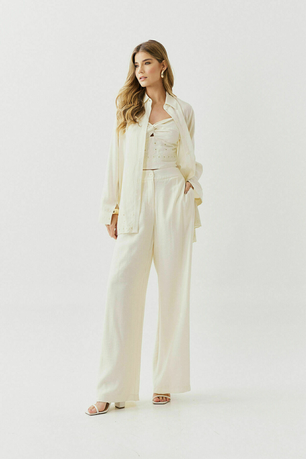 Conjunto de três peças com camisa de barrado bordado, top com torção no decote, detalhe bordado no barrado, alças reguláveis, elástico nas costas e calça pantalona com bolsos nas laterais.
