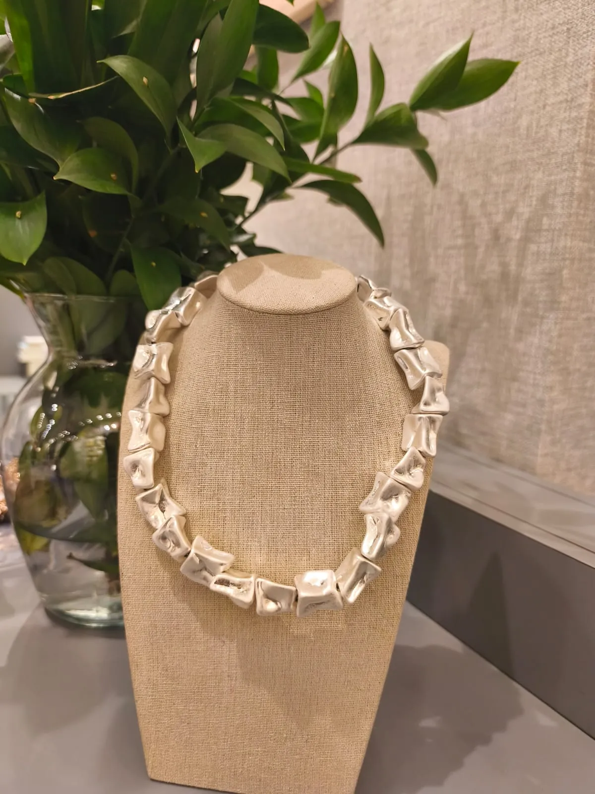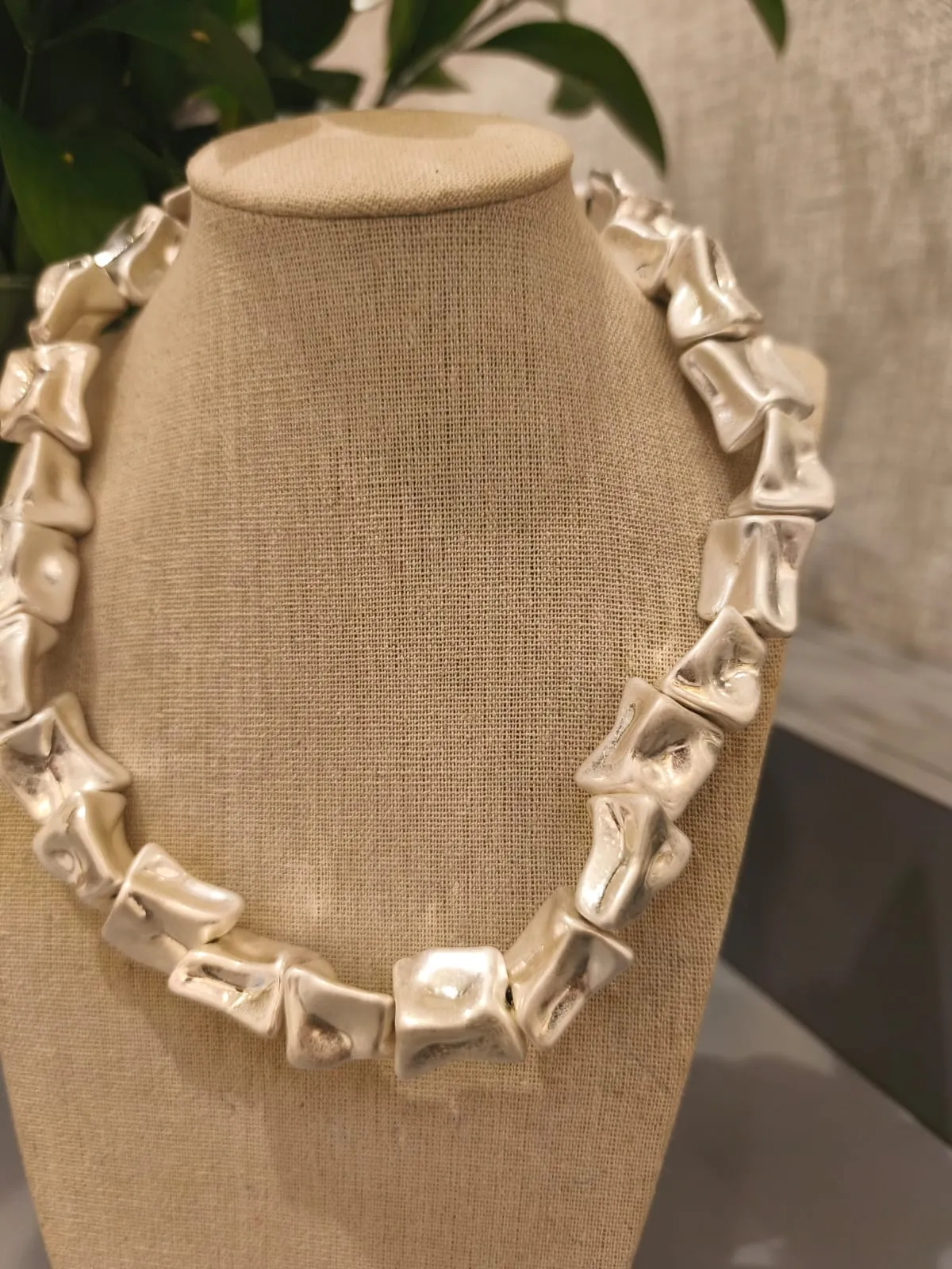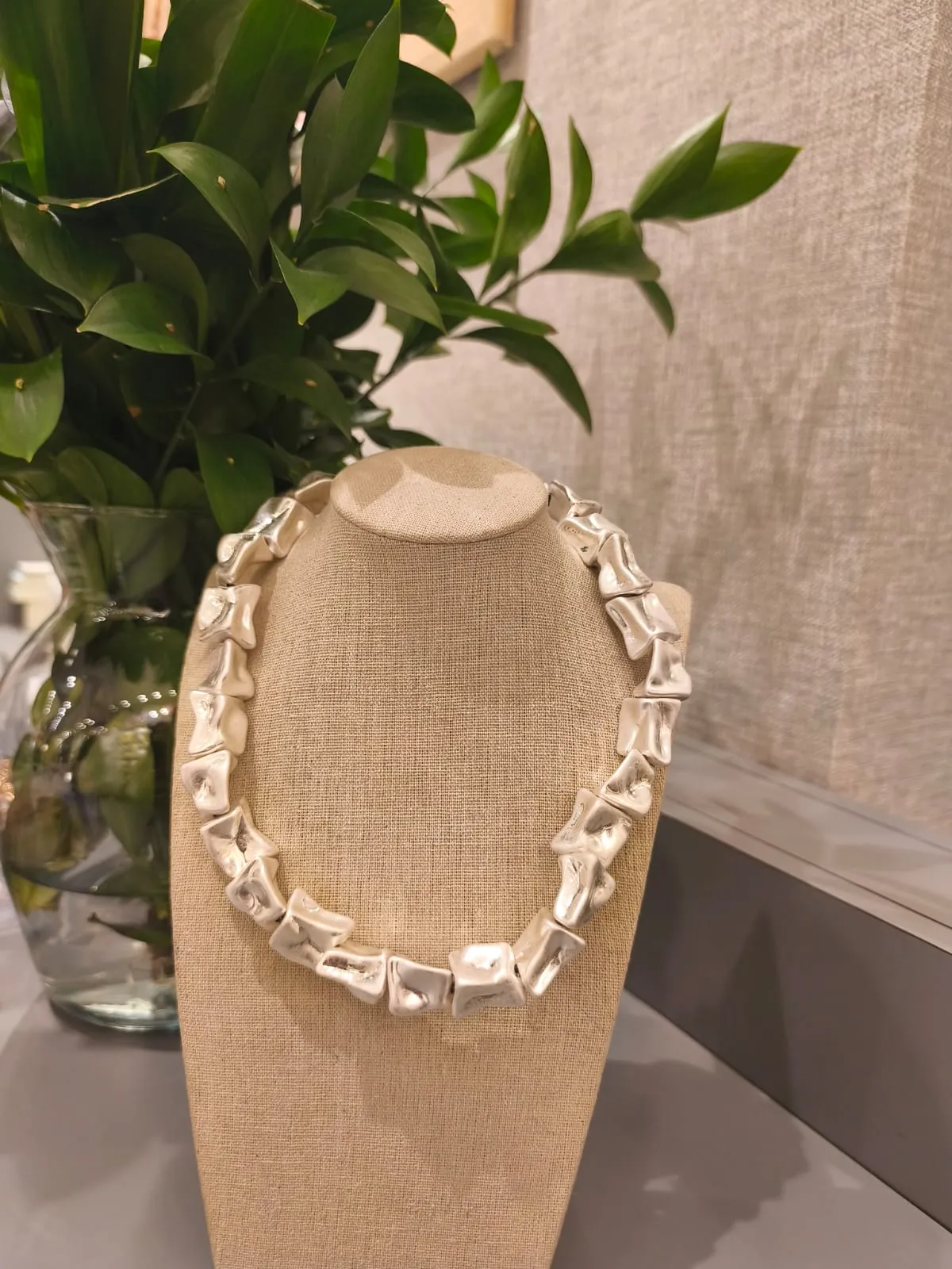 Ficha técnica: colar confeccionado em ABS com banho prata de alta resistência, peças em formato orgânico e volumoso, acabamento polido, fecho metálico ajustável, fabricação nacional, limpeza com pano macio e armazenamento individual.