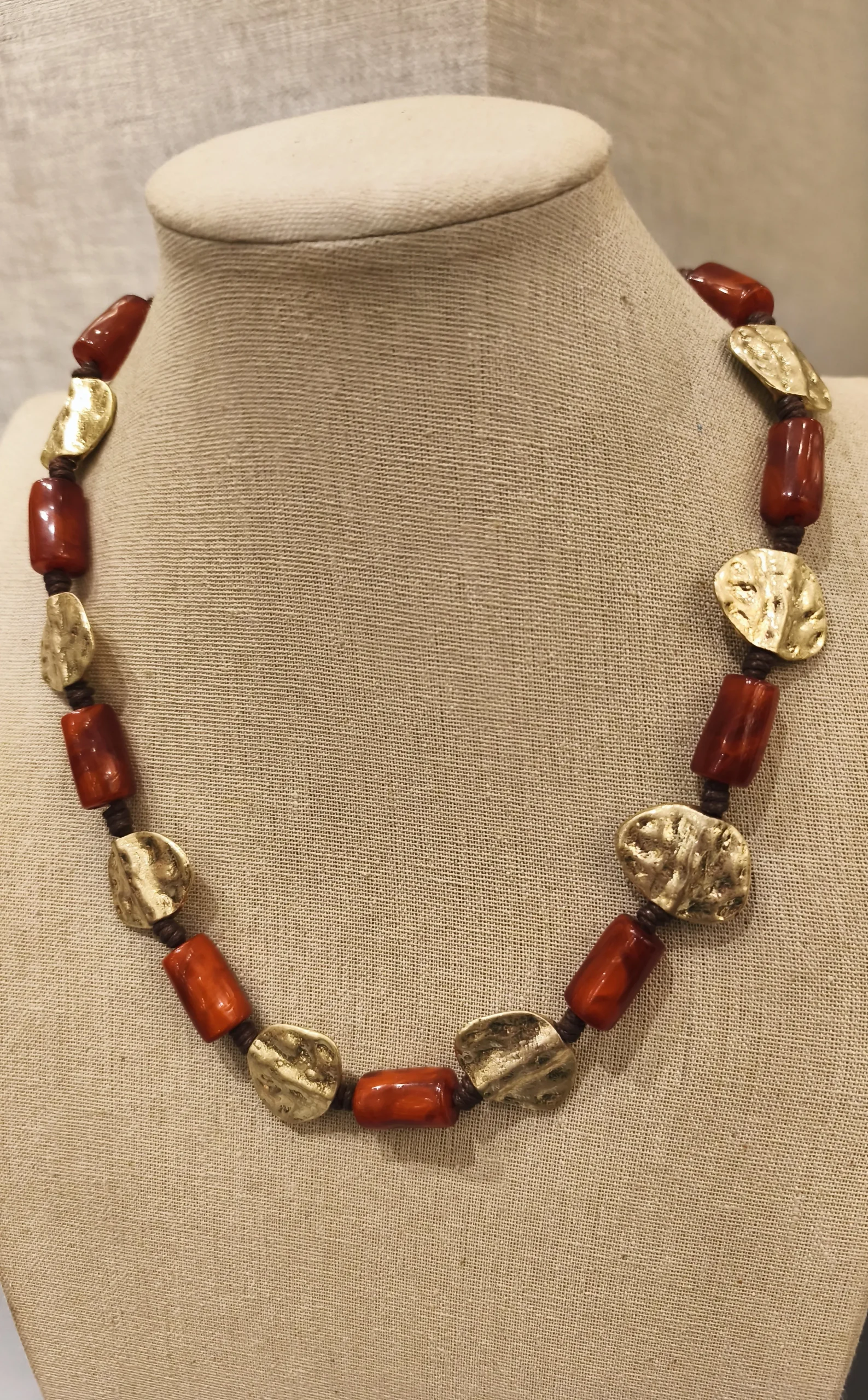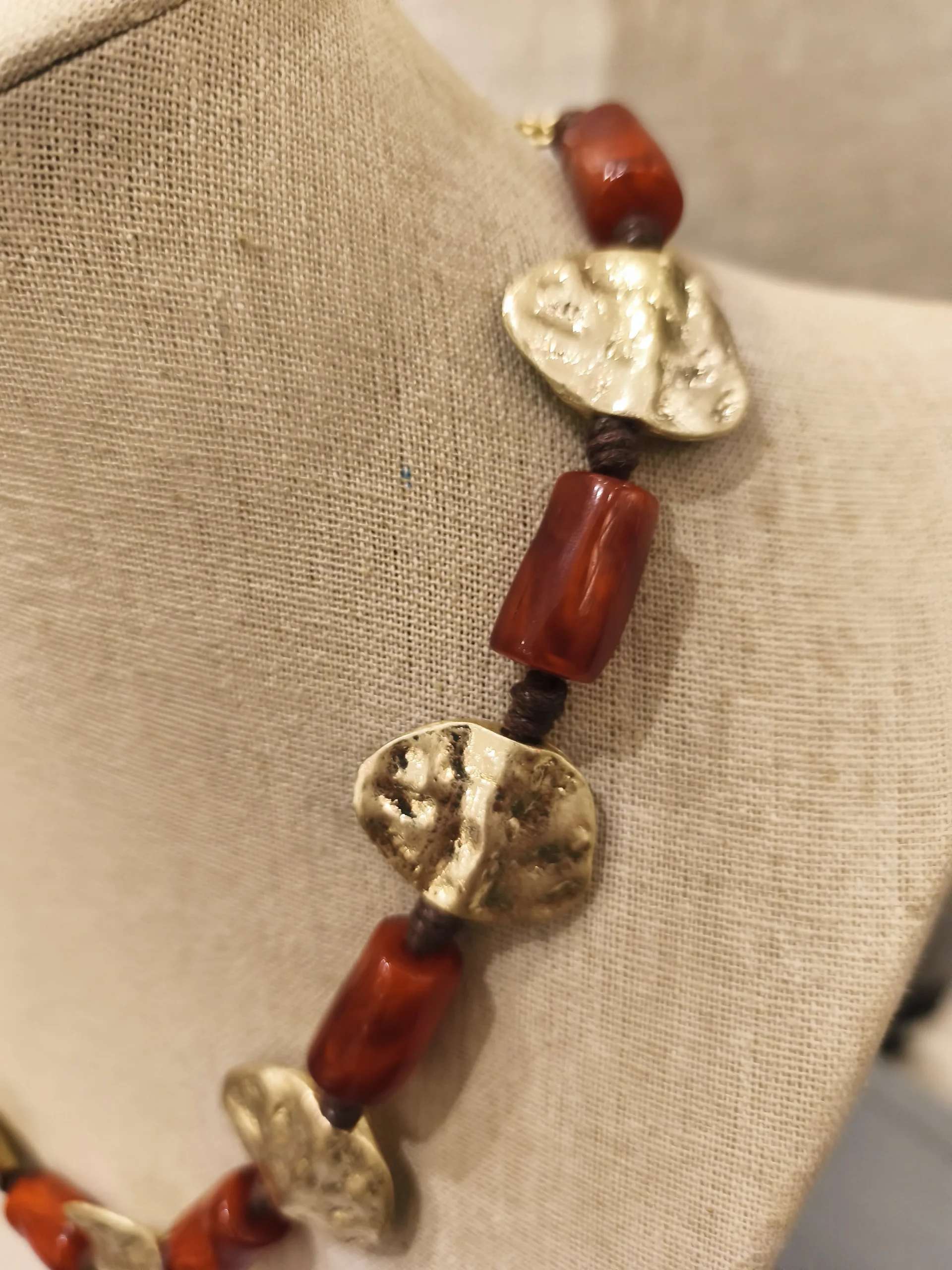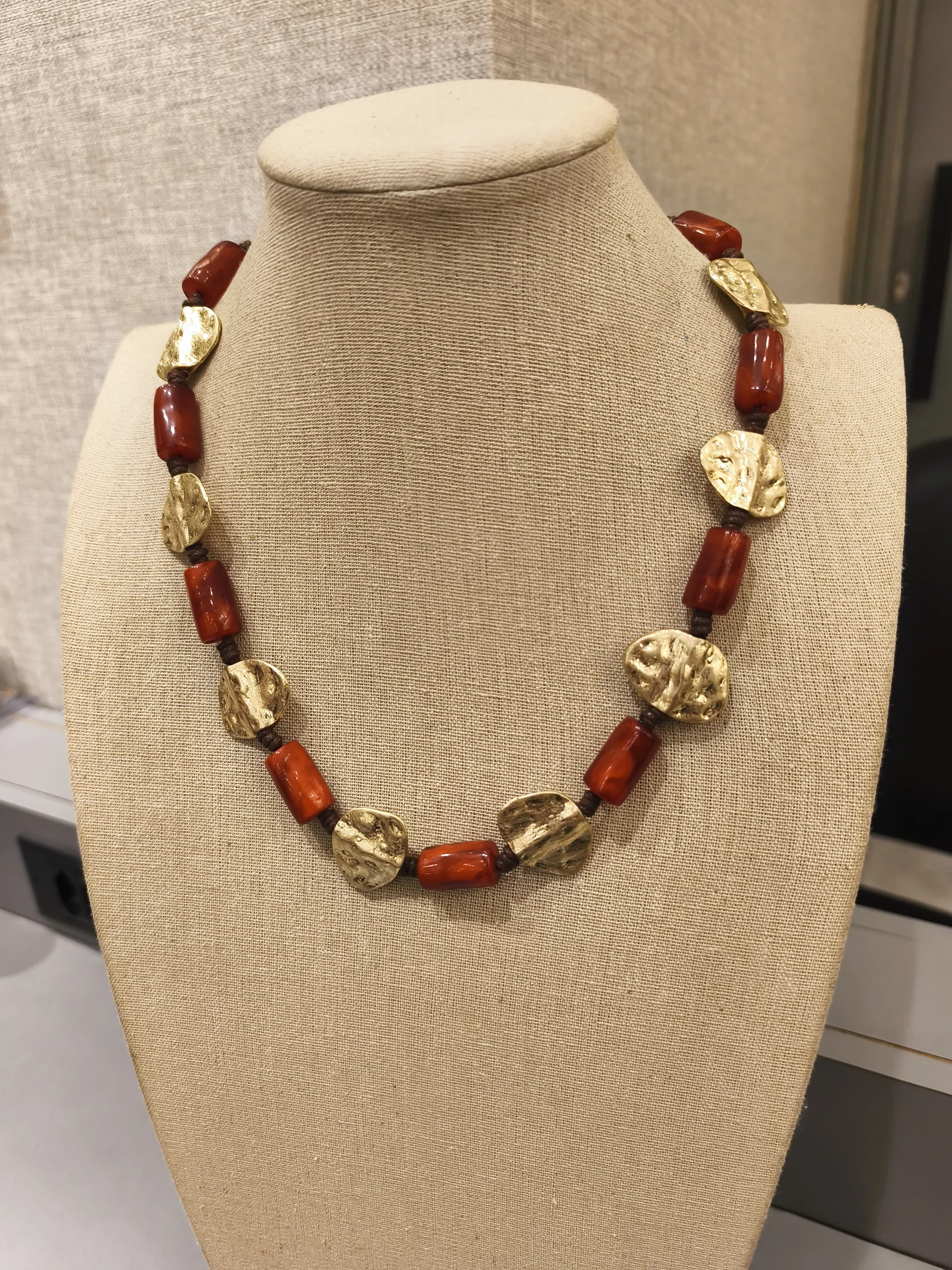 Este colar dourado com detalhes em coral 🔥✨ é a união perfeita entre o artesanal e o sofisticado. Cada peça em tom vermelho terroso, lembrando o coral natural 🍂, se alterna com plaquinhas douradas irregulares que refletem a luz com delicadeza e personalidade. O contraste entre o brilho do metal e a textura orgânica do coral cria um visual elegante e marcante, ideal para mulheres que apreciam acessórios com presença, mas sem exageros. O colar tem caimento leve e estruturado, valorizando o colo com naturalidade e elegância. É aquele tipo de peça que transforma até o look mais básico em uma produção cheia de estilo e confiança ✨.