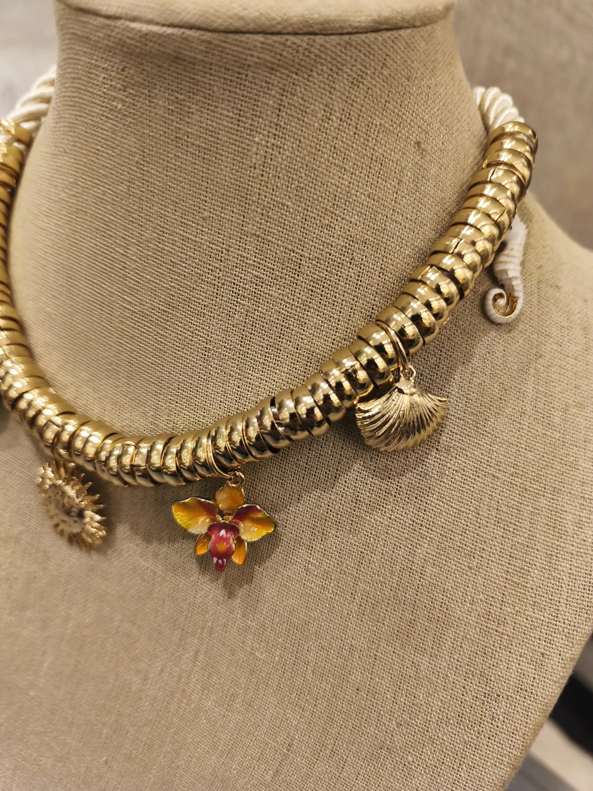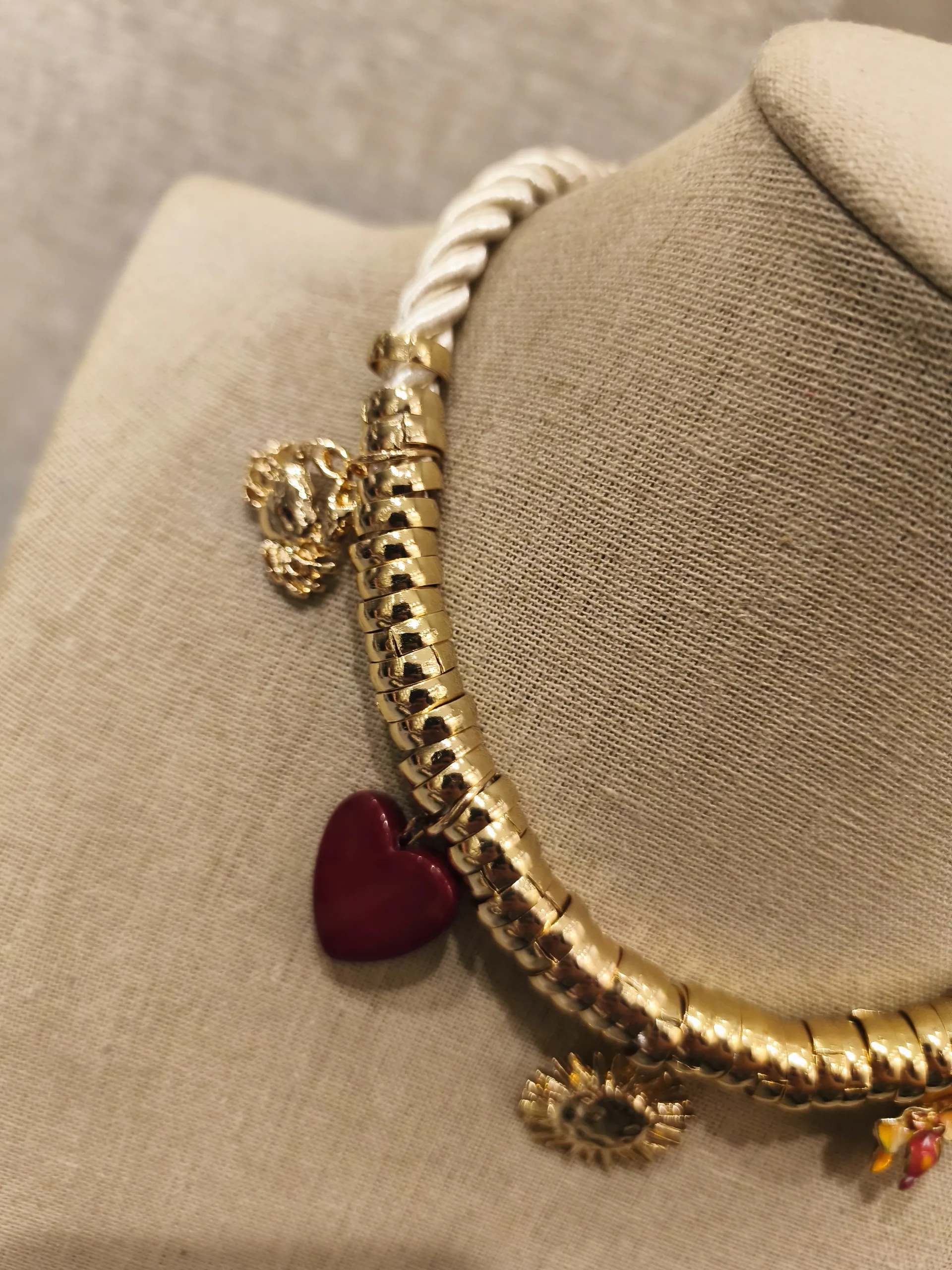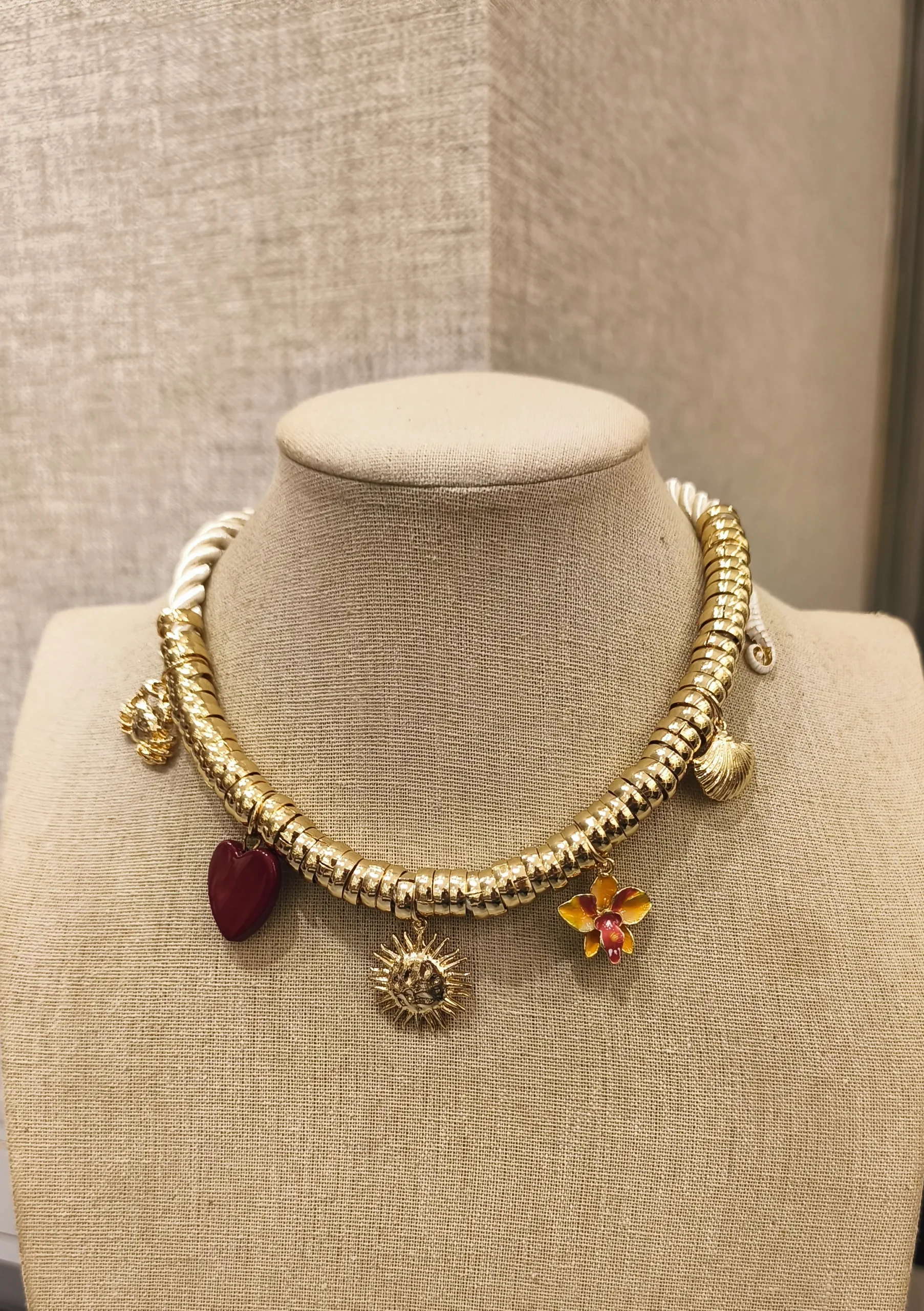 Este colar dourado com pingentes 🌸✨ é puro encanto e personalidade. Feito com argolinhas metálicas que criam uma textura rica e sofisticada, ele abraça o pescoço com elegância e um toque de ousadia. Os pingentes são um show à parte — o coração vermelho ❤️ que simboliza paixão e força feminina, a flor colorida 🌼 que traz alegria e frescor, e o pequeno medalhão dourado ✨ que acrescenta um toque de luz e sofisticação. O resultado é uma peça vibrante e moderna, perfeita para quem gosta de acessórios que contam histórias e traduzem estados de espírito. O brilho dourado reflete o sol e destaca a pele, elevando qualquer look com sutileza e estilo.