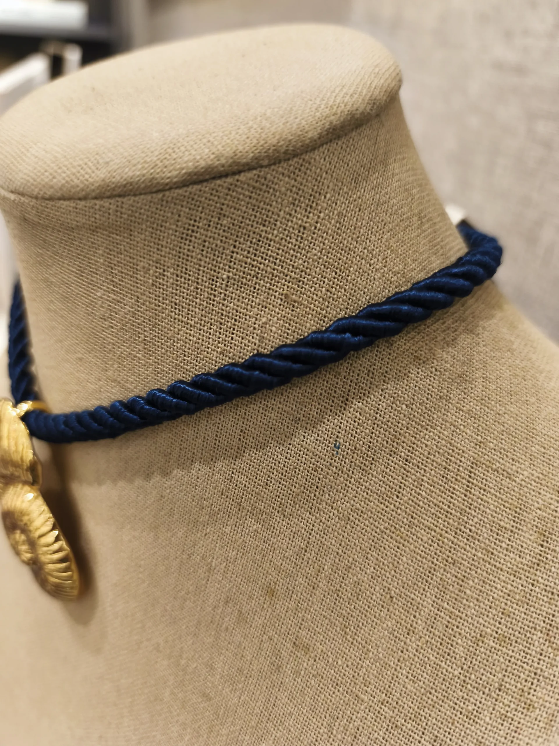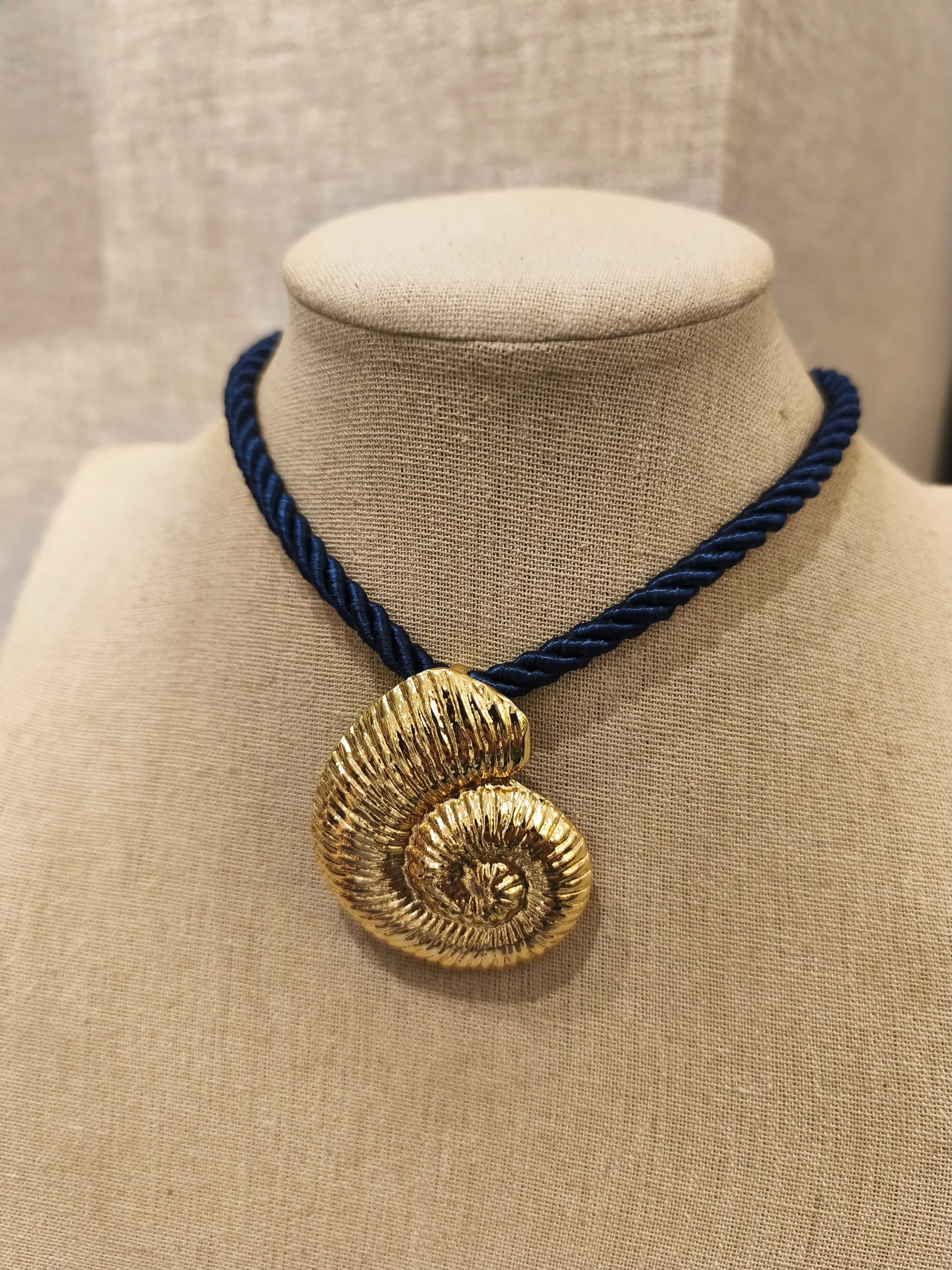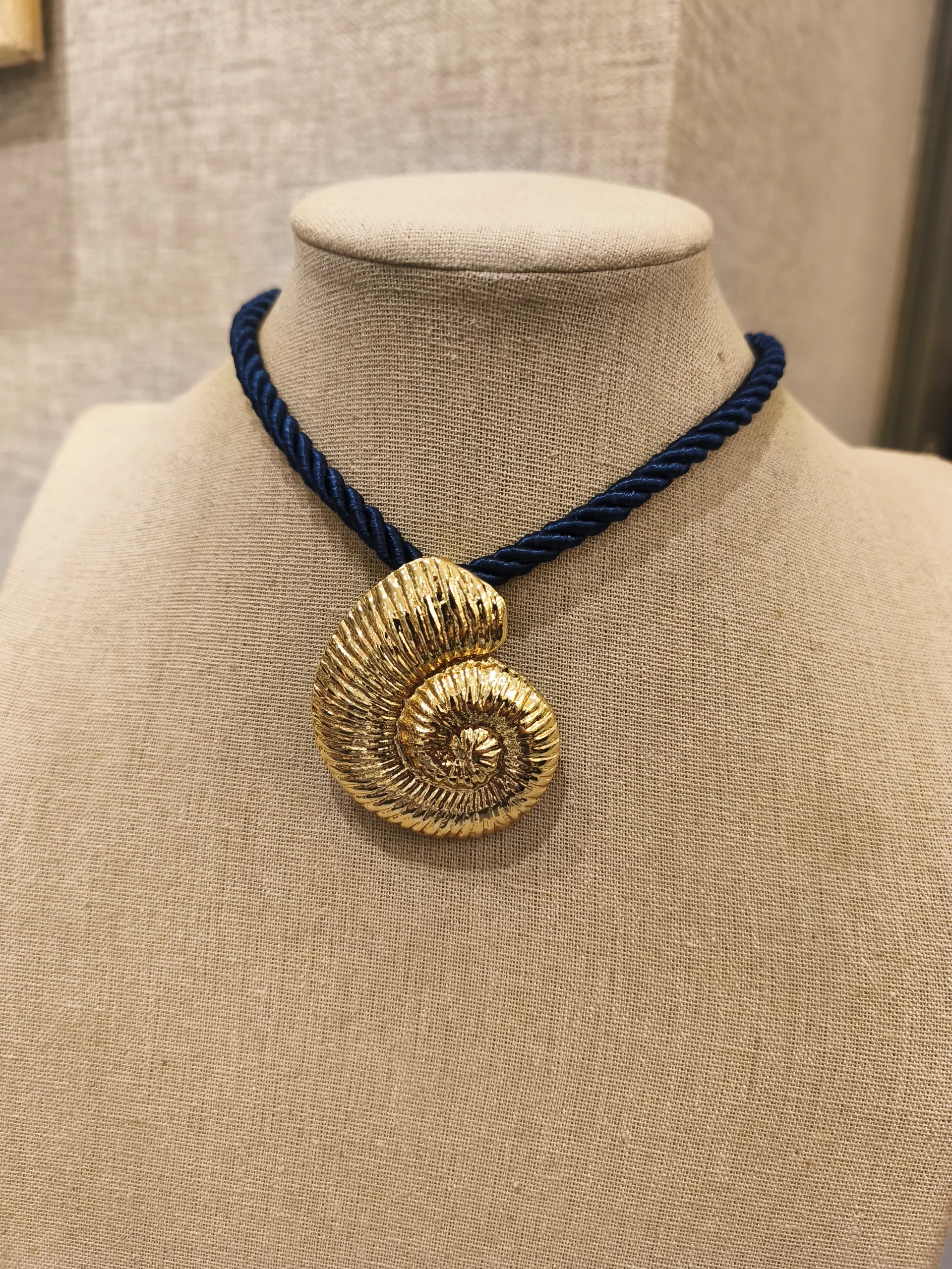 Este colar com cordão azul marinho e pingente metálico 🌀✨ é uma peça que une elegância contemporânea e inspiração natural. O cordão trançado em tom profundo de azul 🌊 traz sofisticação e presença, enquanto o pingente dourado em formato de concha espiral 🐚 reflete a beleza orgânica do mar com um toque de luxo artesanal. O contraste entre o azul intenso e o dourado reluzente cria um visual poderoso e equilibrado, ideal para mulheres que gostam de acessórios que expressem força e refinamento.