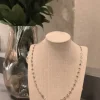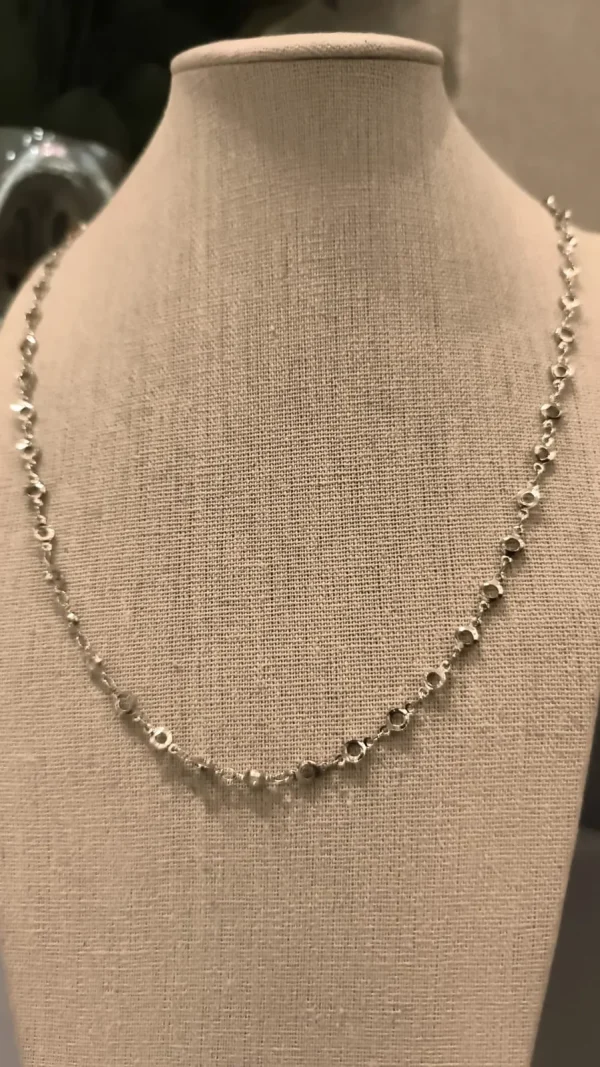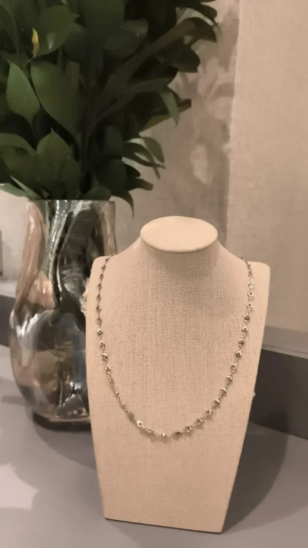 Colar delicado com acabamento prateado e detalhes de pequenas bolinhas ao longo da corrente, que adicionam um brilho sutil e sofisticado ao visual. 💎⚪💫