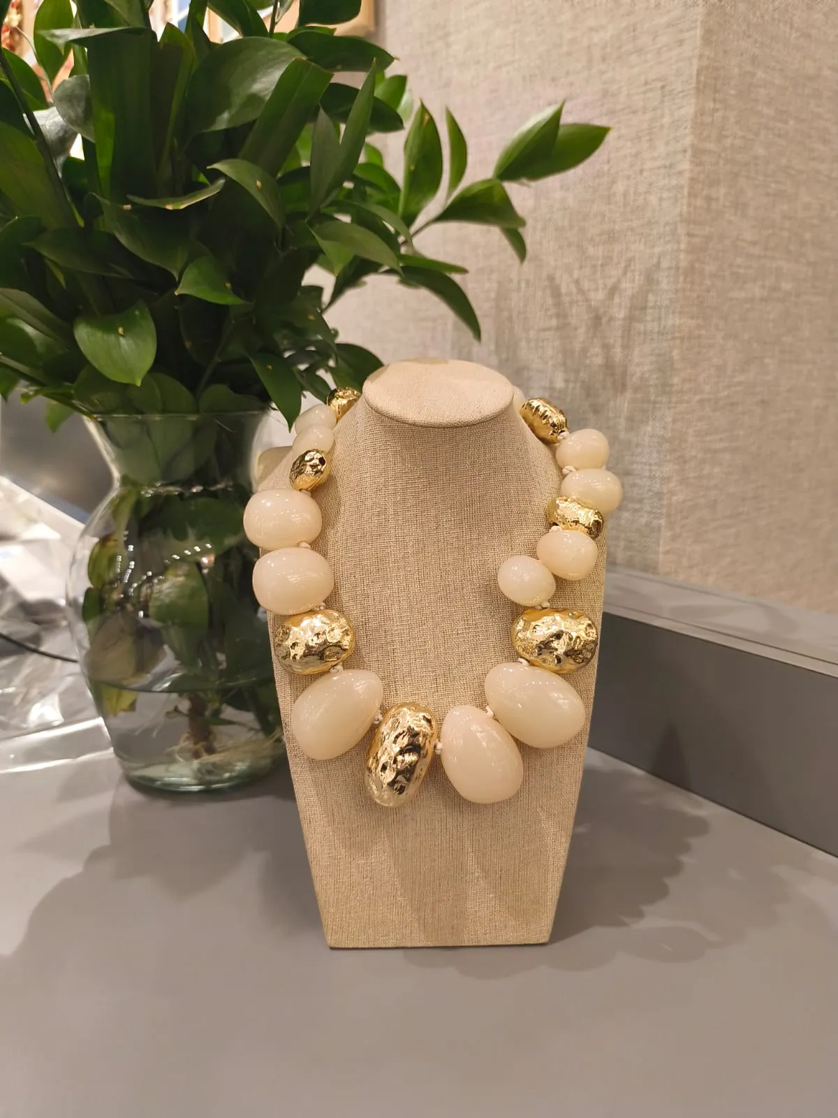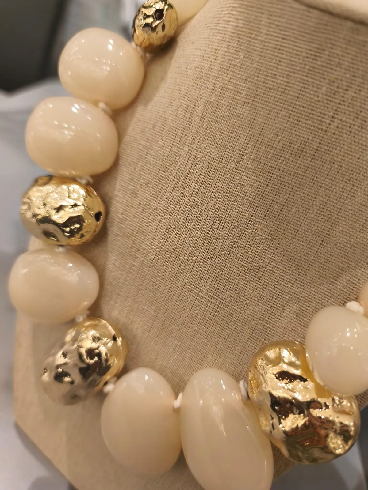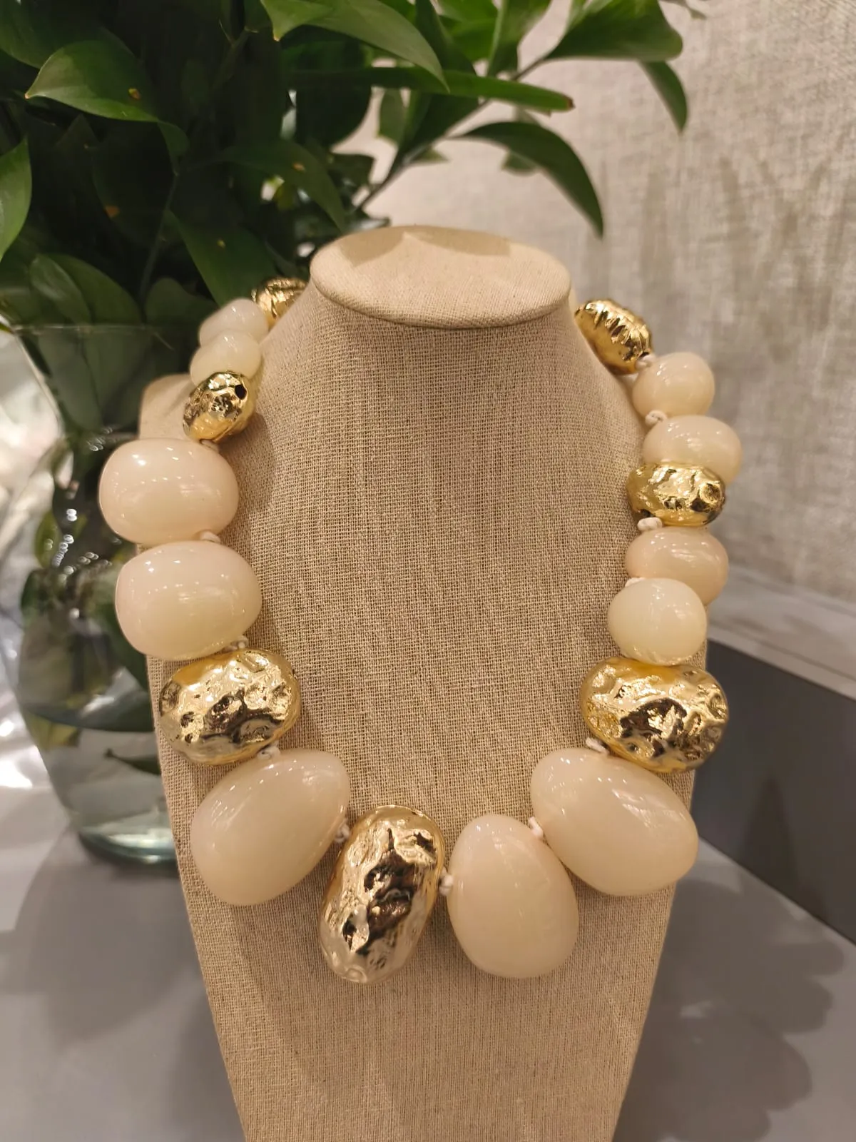 O colar dourado ABS text é uma peça imponente e cheia de sofisticação, ideal para quem ama acessórios de presença. Seu design combina contas grandes em tom off white com elementos metalizados dourados de textura orgânica, criando um contraste elegante entre o fosco e o brilho. O resultado é um colar escultural e moderno, perfeito para destacar o colo e transformar qualquer produção em um look refinado e contemporâneo.