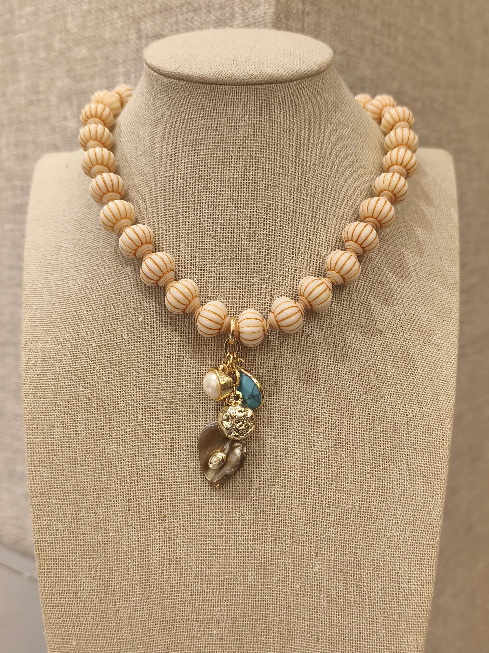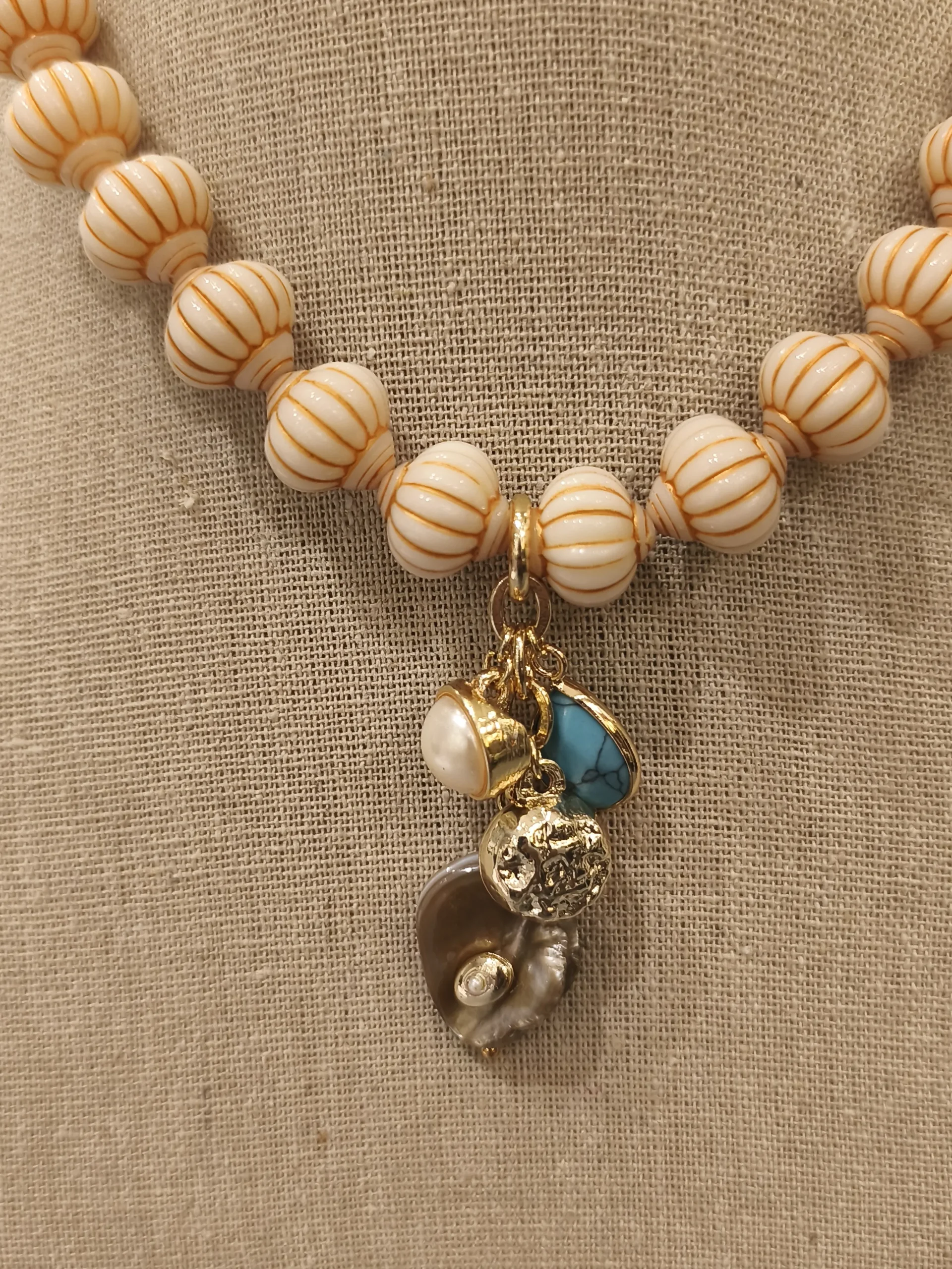 Este colar dourado com resina bege é a definição de charme natural com um toque sofisticado ✨. As contas em resina, levemente frisadas, criam textura e profundidade, trazendo um visual elegante e aconchegante — aquele tipo de peça que ilumina o look sem esforço. O tom bege neutro torna o colar extremamente versátil, funcionando tanto em produções claras quanto em paletas terrosas. No centro, o conjunto de pingentes em dourado, marrom e um toque de azul turquesa adiciona personalidade e movimento, criando um ponto focal moderno e cheio de estilo 🌿. O contraste entre o metal quente e as cores orgânicas faz deste colar uma ótima escolha para mulheres que gostam de acessórios práticos, mas com presença. Ele complementa lindamente camisas de linho, tricôs leves, vestidos fluidos e até looks de alfaiataria descontraída.