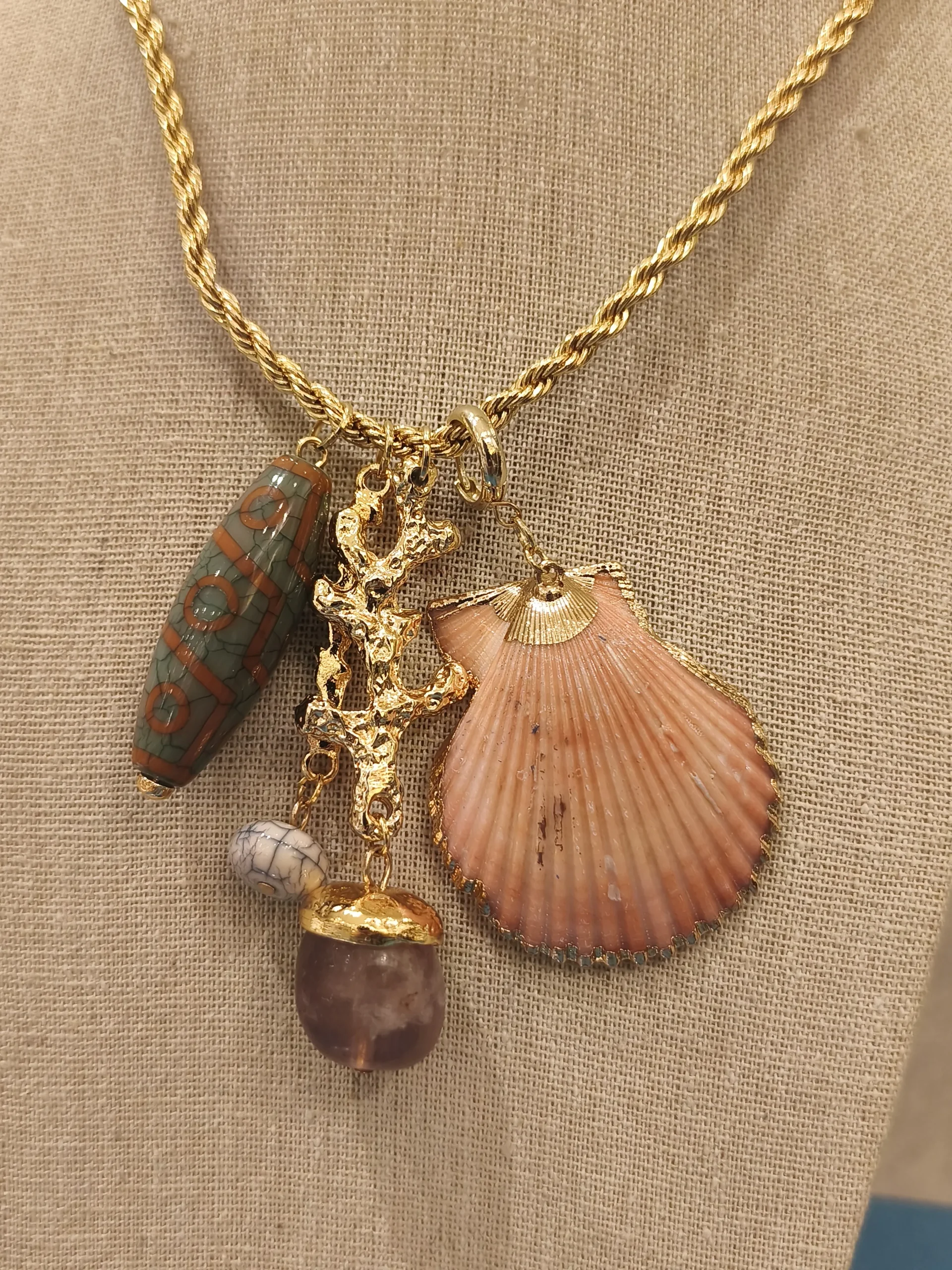 Este colar dourado com penca de pingentes é uma peça cheia de charme, movimento e delicadeza — perfeito para mulheres que amam acessórios com personalidade e um toque artesanal ✨. A corrente dourada fina cria uma base elegante e luminosa, enquanto o conjunto de pingentes transforma o colar em um amuleto moderno e cheio de história. A concha rosada, com acabamento suave e tom levemente nacarado, traz feminilidade e naturalidade; o pingente metálico oval com textura artística adiciona profundidade e sofisticação; a pequena gota lilás em resina transparente ilumina o conjunto com leveza; e o detalhe dourado final arremata tudo com brilho delicado. O resultado é um colar leve, versátil e especial — daqueles que dão graça até ao look mais simples.