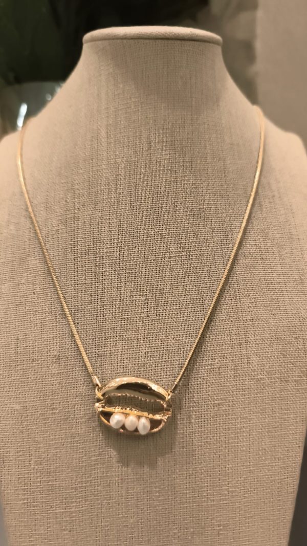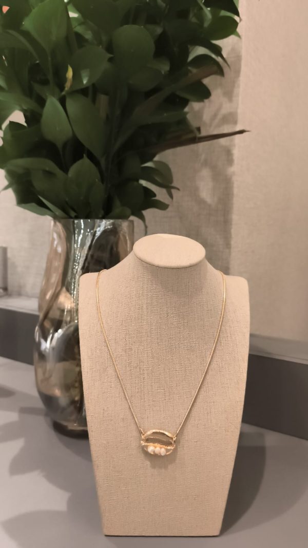 Colar com corrente fina dourada e pingente em formato de concha com mini pérolas internas, trazendo um toque orgânico e sofisticado. 🌊💫