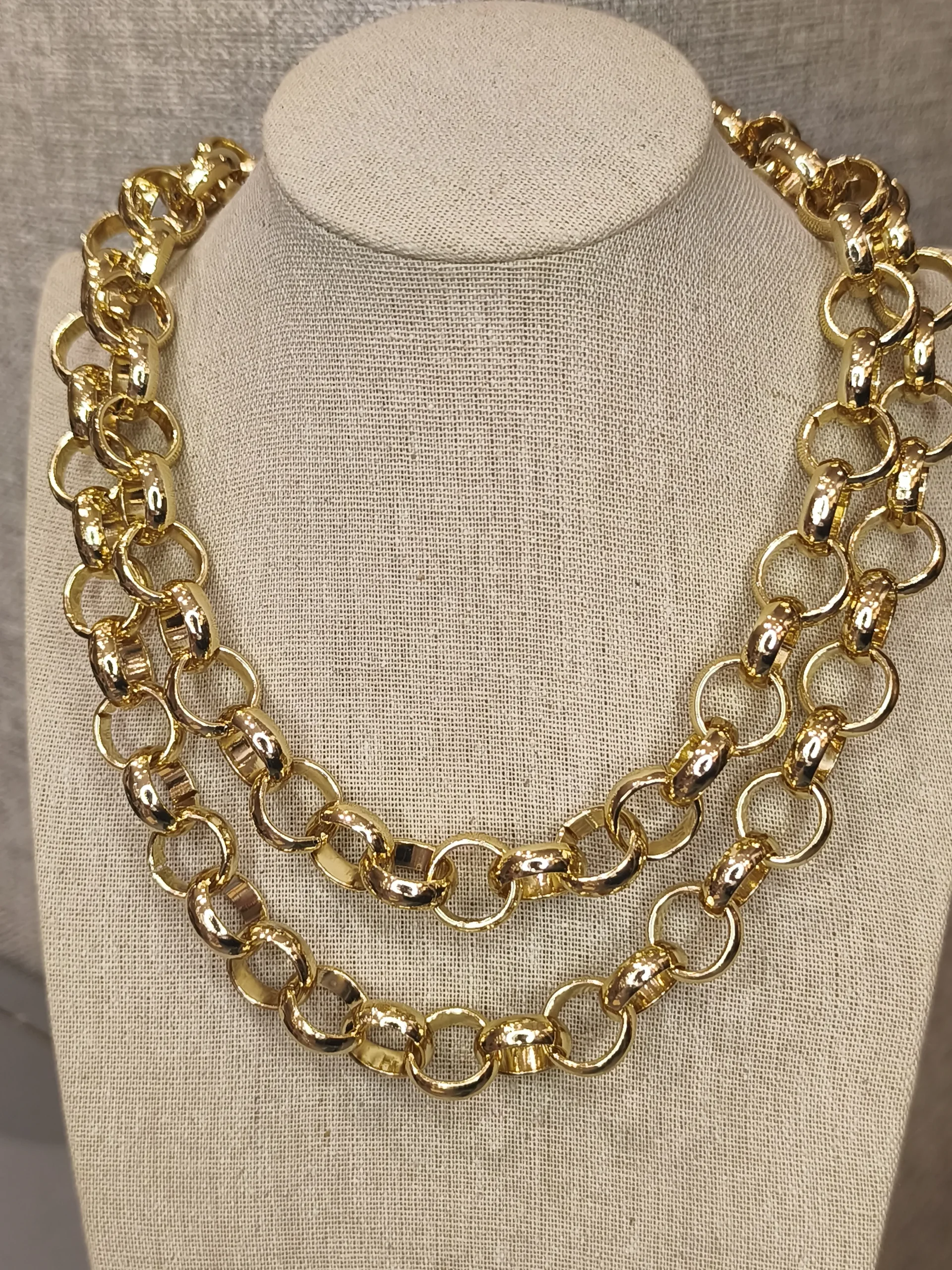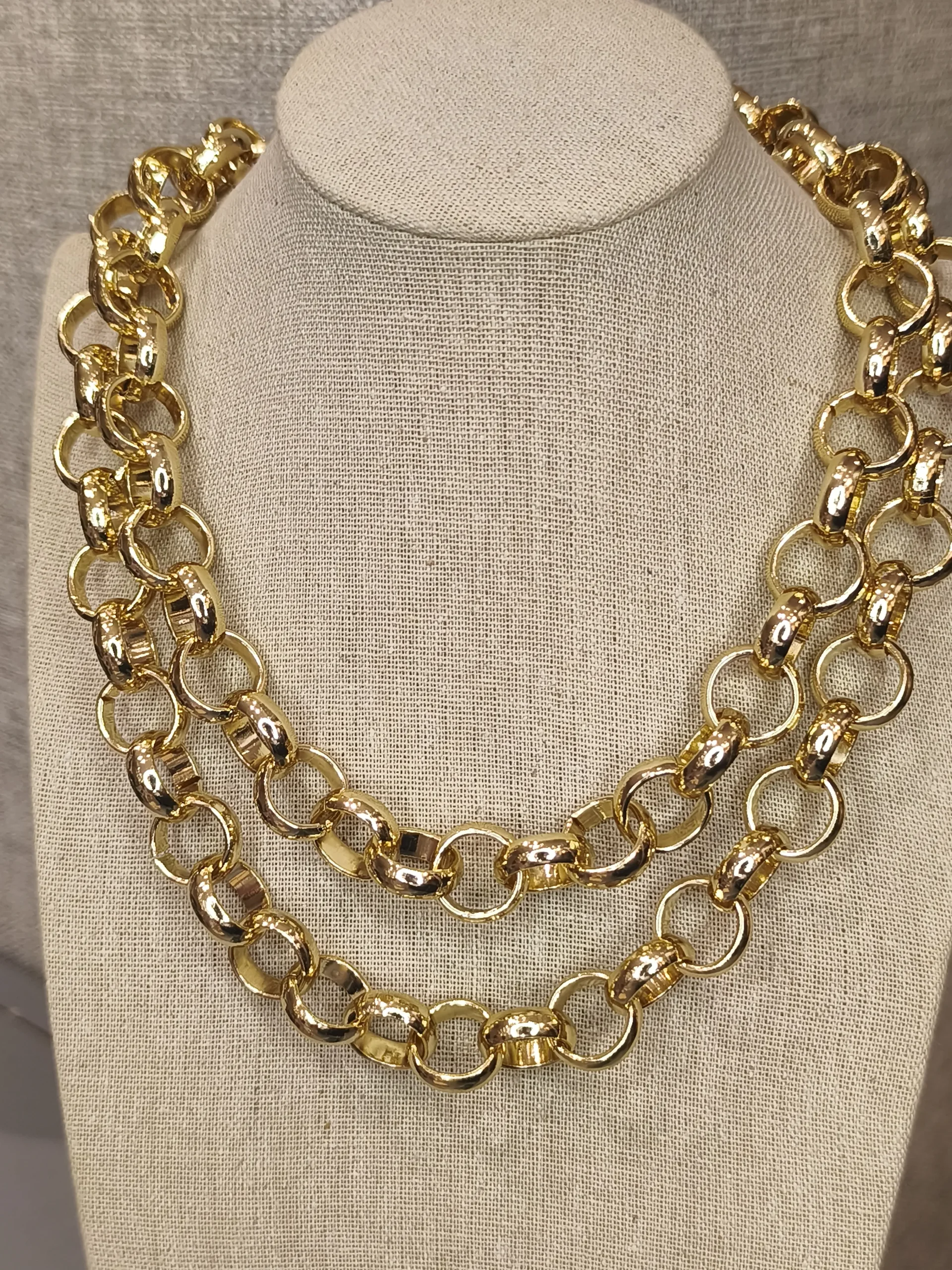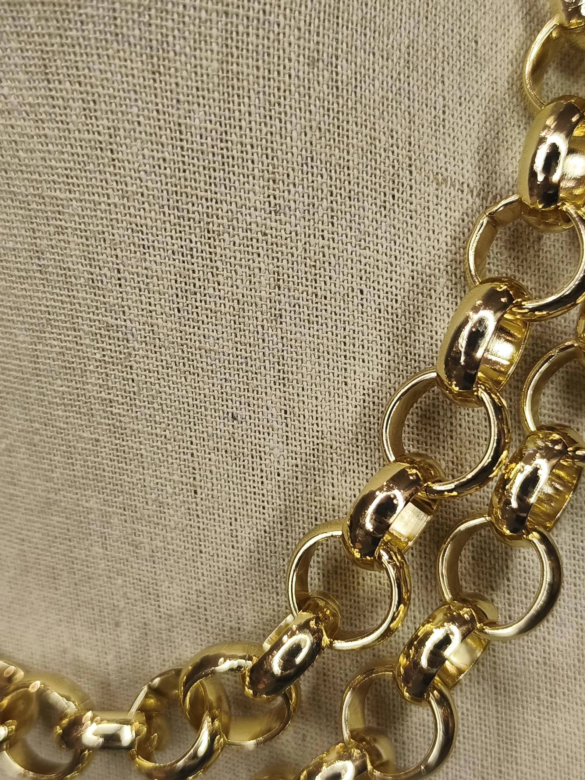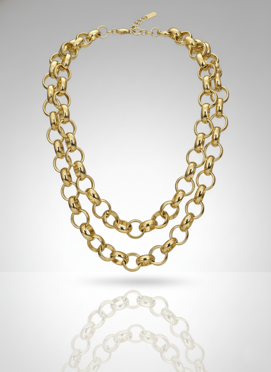 Este colar dourado de corrente é a expressão máxima de poder e sofisticação — uma peça que transforma qualquer look com personalidade imediata ✨. Suas três camadas de elos arredondados criam um visual encorpado, moderno e ao mesmo tempo atemporal, daqueles que elevam até as produções mais simples. O dourado polido ilumina o colo com intensidade, trazendo presença sem perder a elegância. É um acessório perfeito para mulheres que gostam de transmitir confiança, estilo e refinamento através de detalhes marcantes. Ele funciona maravilhosamente com camisas abertas, blazers de alfaiataria, vestidos minimalistas e até tricôs de gola alta, criando um contraste sofisticado e irresistível 💛.