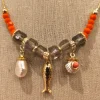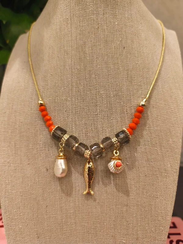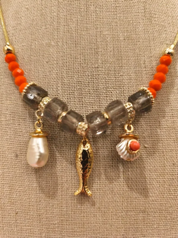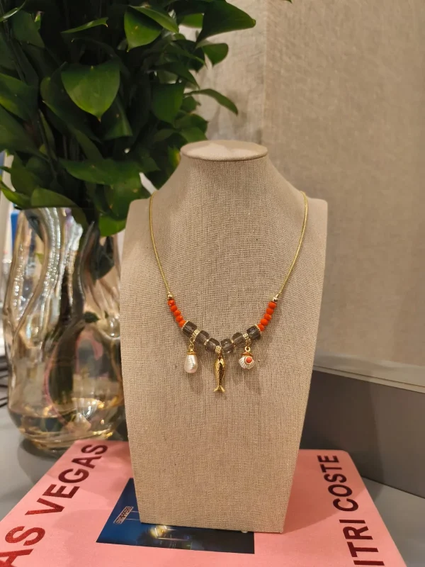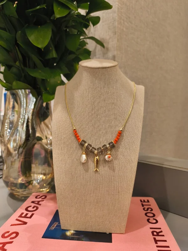 O colar dourado cristal é uma verdadeira obra de arte em forma de acessório. Ele mistura com maestria a sofisticação dos cristais lapidados em tom fumê com a vivacidade dos cristais coral, criando um contraste moderno e cheio de estilo. No centro, os pingentes dão vida e personalidade à peça: a pérola barroca traz elegância clássica, o peixinho dourado evoca movimento e simbolismo, e a concha esmaltada com detalhe coral reforça o charme litorâneo sofisticado. É um colar que fala de viagens, memórias e de um estilo de vida leve, mas sem abrir mão da sofisticação. Uma peça versátil, que pode ser usada tanto no dia a dia para elevar looks simples quanto em produções mais elaboradas, em que será o ponto de destaque.