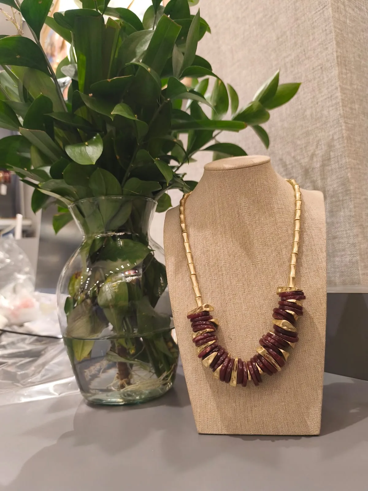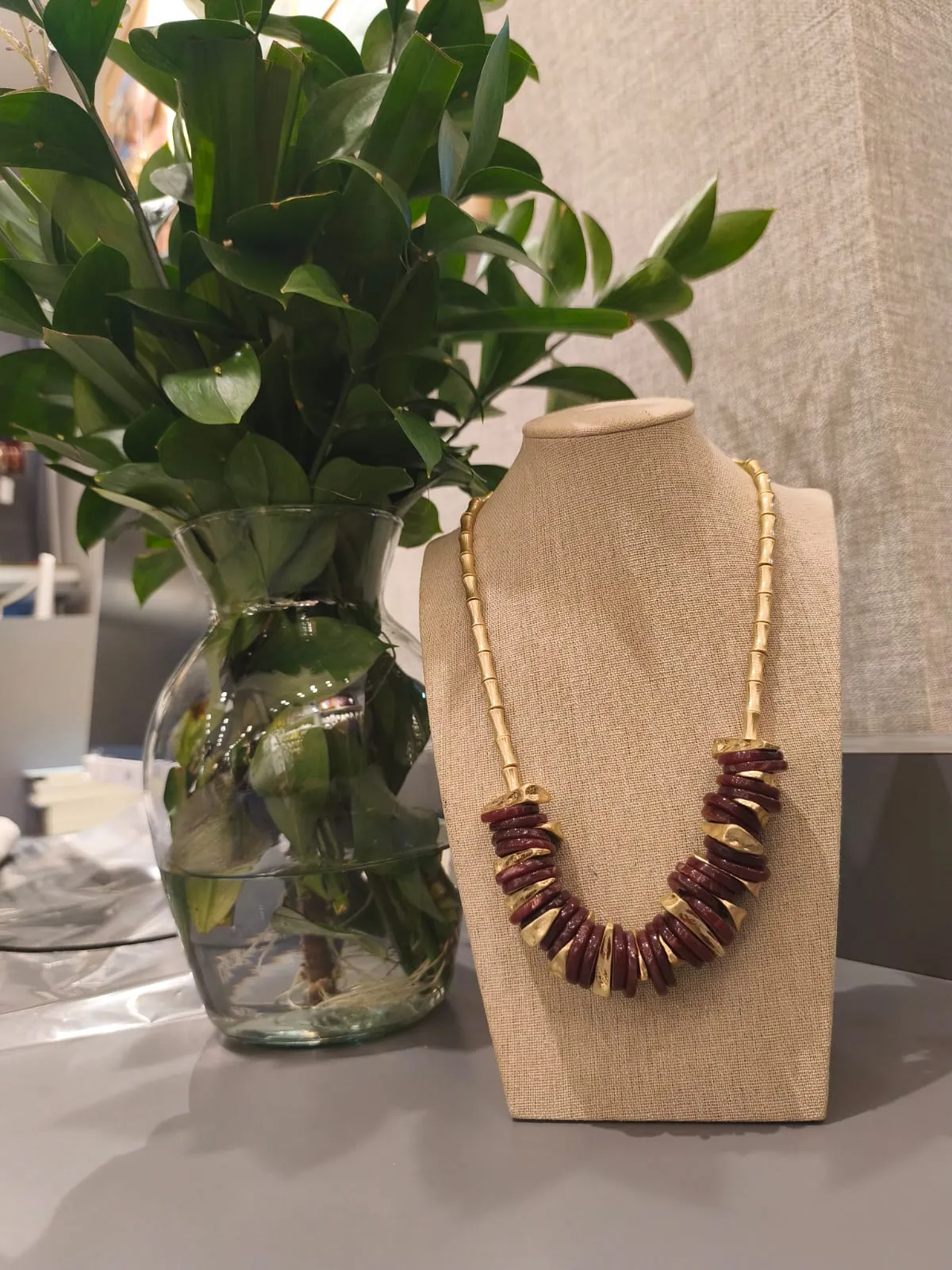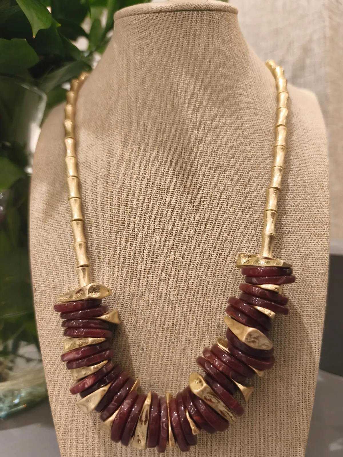 Dica de estilo: combine o colar dourado discos resina com blusas de decote redondo ou vestidos lisos para valorizar o colo. Ele é o acessório ideal para dar destaque a looks neutros, especialmente em tons de bege, preto, branco ou terracota. Use tanto em ocasiões diurnas quanto noturnas para um visual marcante.