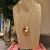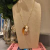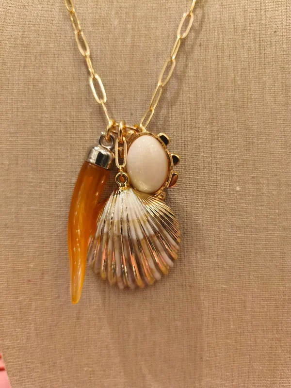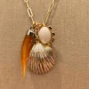 Palavras-chave: colar dourado, colar de elos, colar com pingente, colar com concha, colar sofisticado, colar penca, acessório feminino dourado.