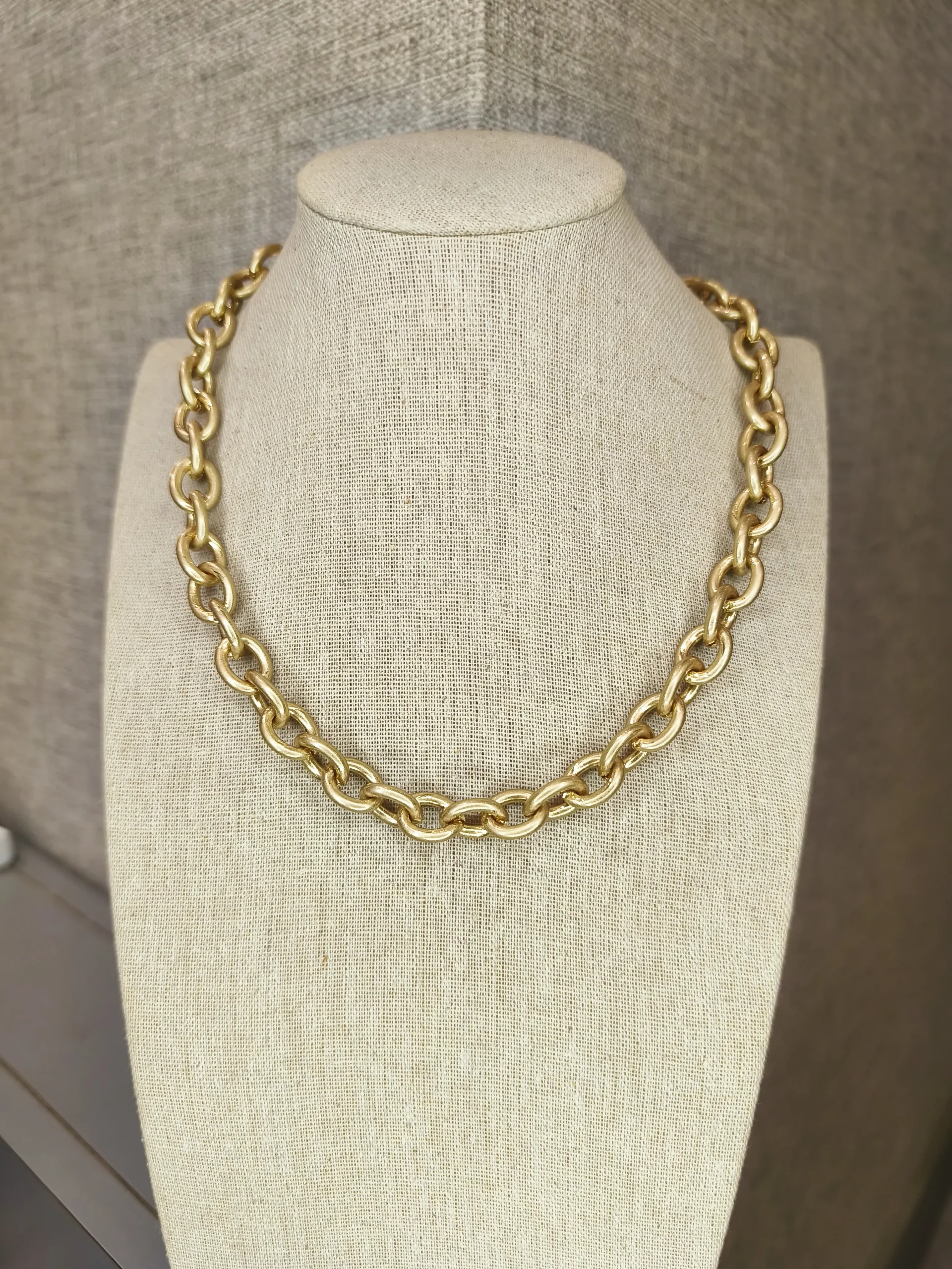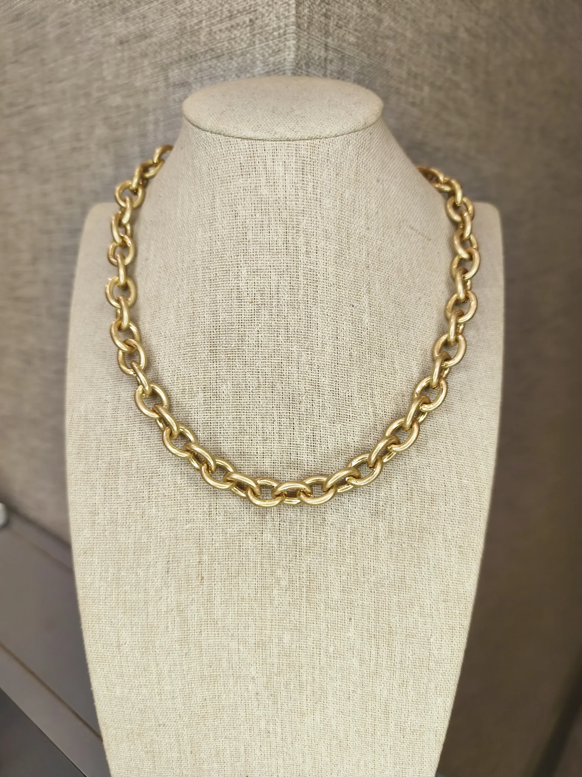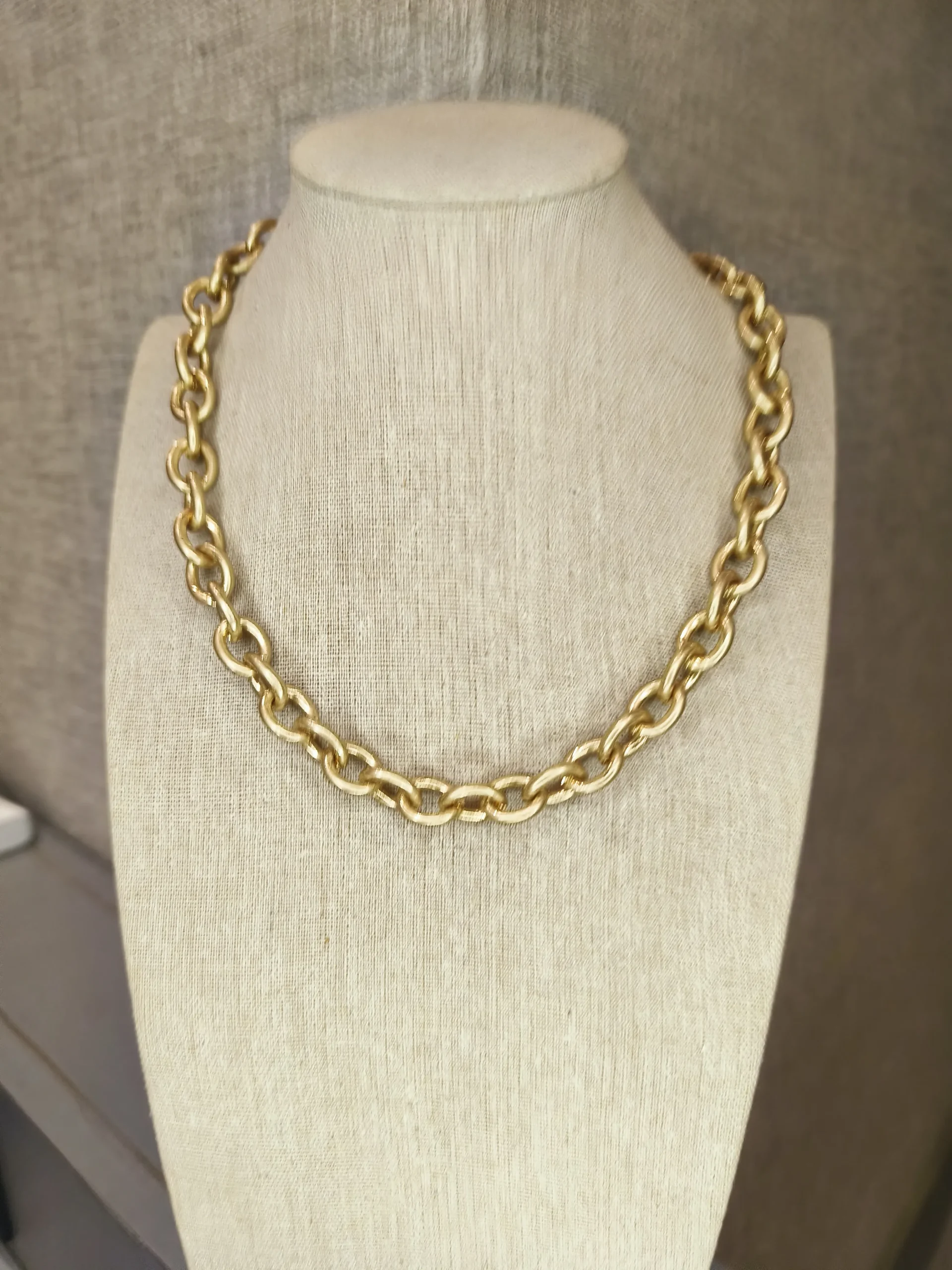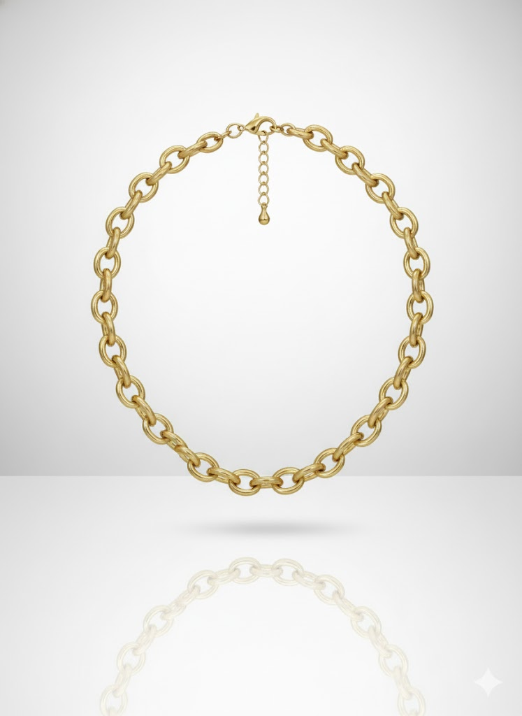 Este colar dourado fosco de elos é a peça ideal para mulheres que desejam transmitir força com elegância — um acessório que chama atenção sem esforço ✨. Seus elos arredondados, com acabamento fosco ultra sofisticado, criam um visual moderno e atemporal, perfeito para iluminar o colo de maneira equilibrada. A textura acetinada do dourado deixa o colar ainda mais especial, trazendo um toque contemporâneo que foge do brilho tradicional e oferece um charme discreto, refinado e muito chic. É uma daquelas peças versáteis que funcionam com tudo: desde camisas brancas estruturadas até vestidos minimalistas, passando por tricôs, blazers e produções monocromáticas. Ele eleva o visual instantaneamente, transmitindo presença e bom gosto 💛.