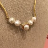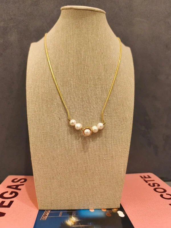 O colar dourado com madrepérola é a tradução da elegância minimalista, perfeito para quem valoriza acessórios delicados que fazem toda a diferença no visual. Sua corrente fina em banho dourado sustenta cinco pérolas dispostas em sequência, sendo a central emoldurada por aro dourado, criando um contraste sofisticado entre o brilho metálico e a suavidade perolada. É uma peça versátil e atemporal, que pode ser usada tanto em ocasiões formais quanto no dia a dia, sempre transmitindo feminilidade e refinamento.