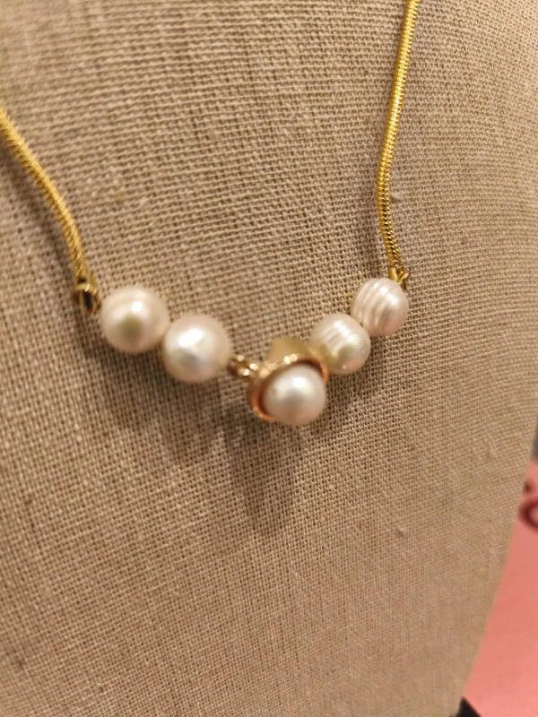 Ficha técnica: confeccionado em metal com banho dourado, corrente fina com aplicação de cinco pérolas artificiais estilo madrepérola, sendo a central em detalhe aro dourado. Cor dourada com pérola branca. Origem nacional. Para conservar, evite contato com água, perfumes ou produtos químicos e guarde em caixa ou saquinho de tecido.