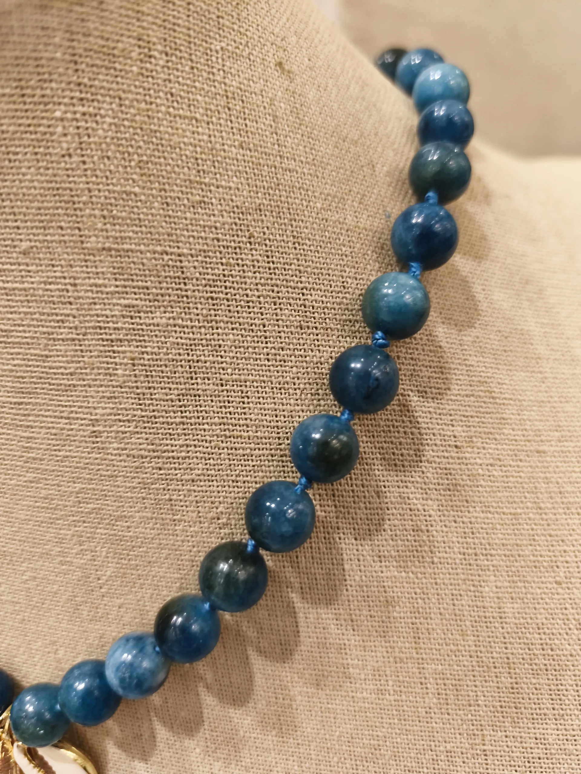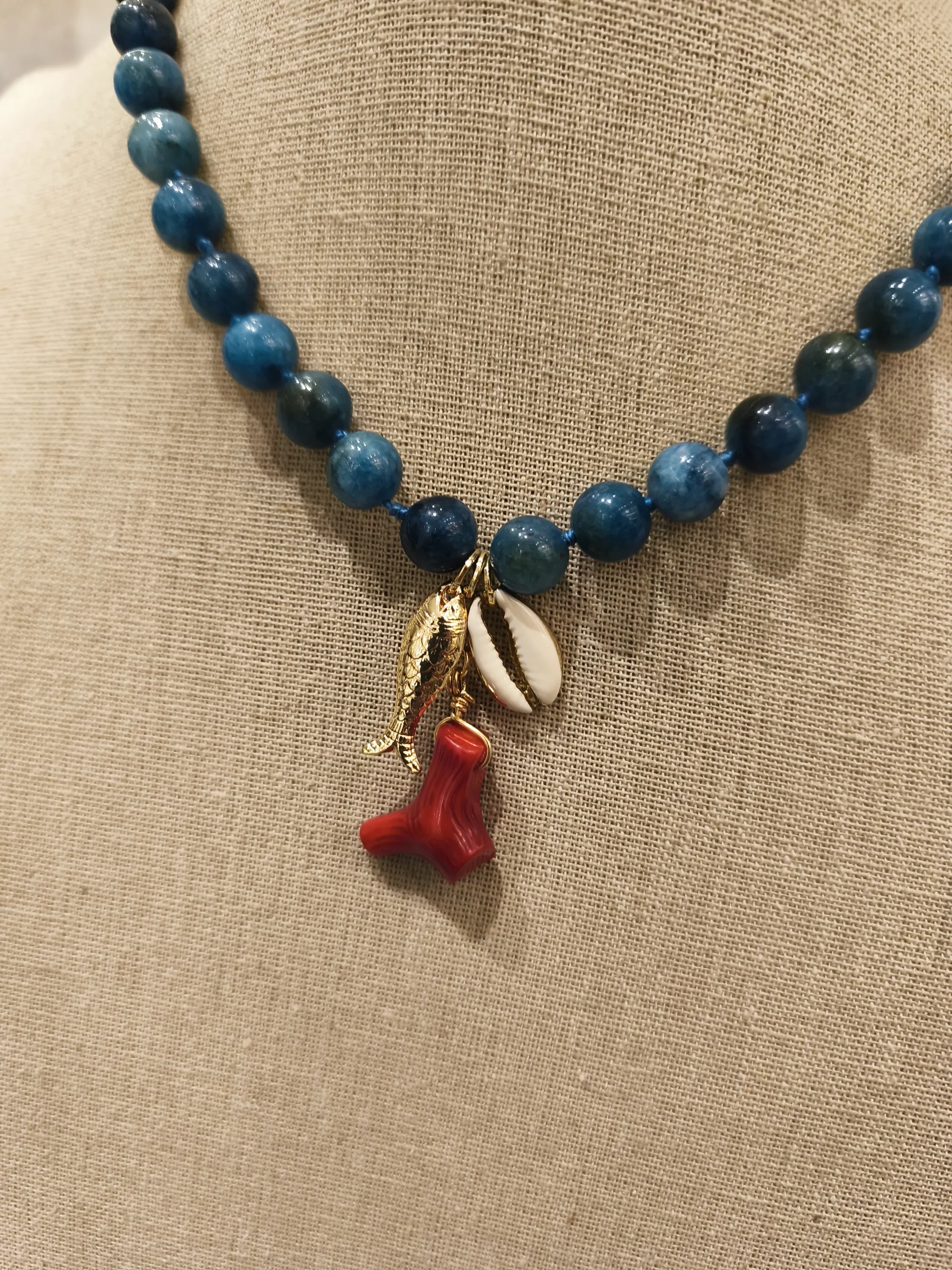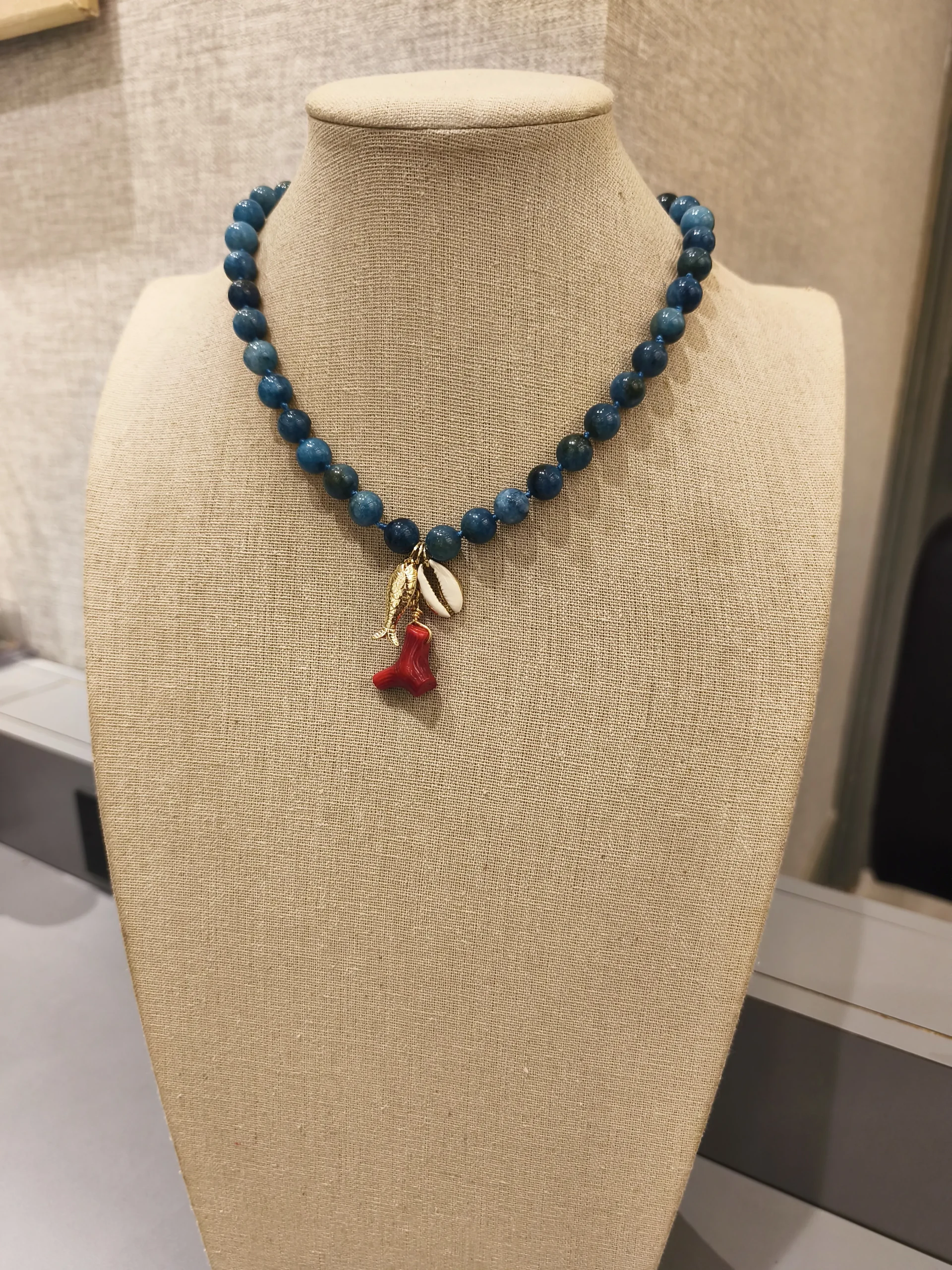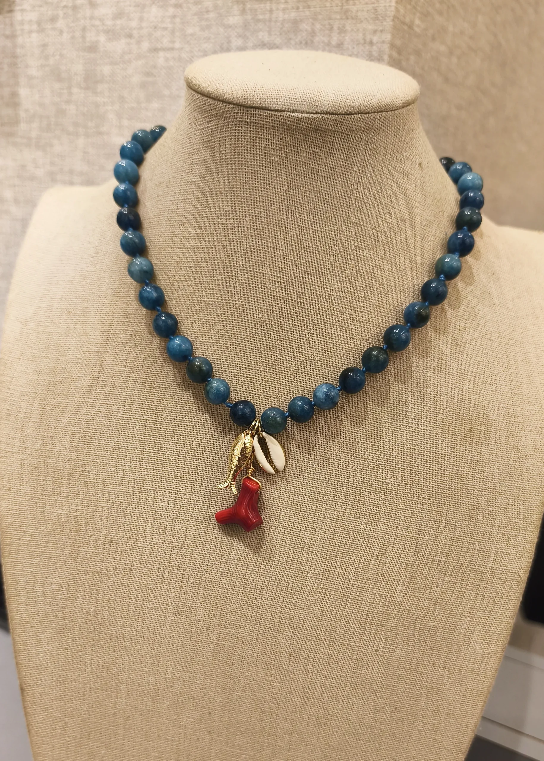 Este colar dourado com pedras azul marinho 🌊✨ é a combinação perfeita entre sofisticação e frescor. As esferas em tom profundo de azul evocam o mistério e a serenidade do mar, trazendo uma energia tranquila e elegante para o visual. O destaque fica por conta dos pingentes delicados — um coral vermelho 🍒, que adiciona um toque vibrante e cheio de vida, e uma conchinha dourada 🐚, símbolo de feminilidade e conexão com a natureza. O contraste entre o azul intenso e o dourado reluzente cria um equilíbrio lindo, transformando o colar em uma peça versátil que vai do dia à noite com naturalidade.