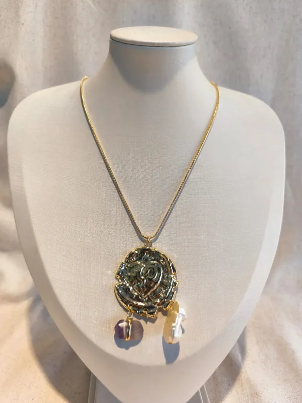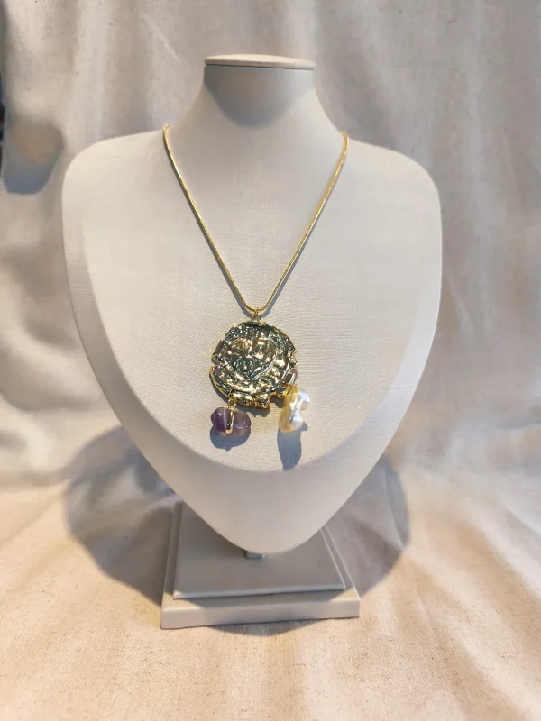 Com corrente fina e pingente maxi em formato de medalha texturizada, ele ganha ainda mais charme com os pequenos pendentes em pedra lilás e pérola, que trazem leveza e feminilidade ao design marcante.