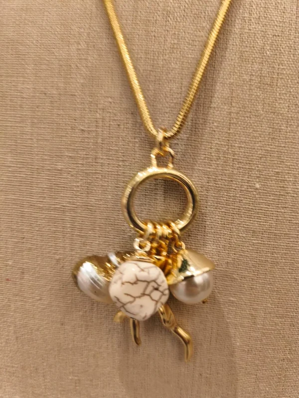 Ficha técnica: confeccionado em metal com banho dourado, corrente longa com aro central e penca de pingentes variados, incluindo pérolas artificiais e pedra natural clara rajada. Cor dourada com detalhes perolados e naturais. Origem nacional. Para conservar, evite contato com água, perfumes ou produtos químicos e guarde em caixa ou saquinho de tecido.