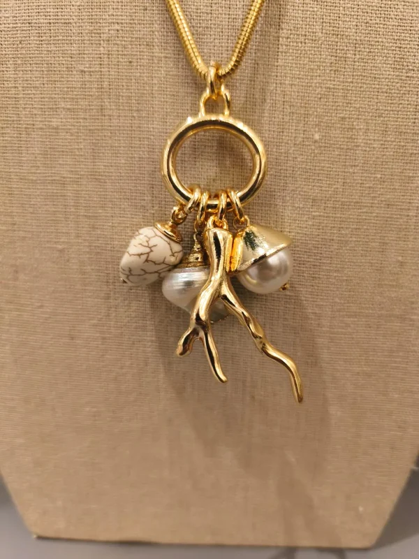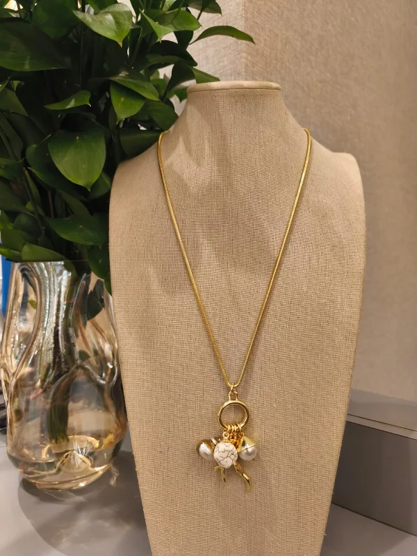 O colar dourado com penca de pingentes é uma peça charmosa e cheia de estilo, perfeita para mulheres que gostam de acessórios com personalidade. A corrente longa e fina em banho dourado sustenta um aro central do qual partem diversos pingentes, entre eles pedras naturais em tons claros, pérolas e detalhes metalizados, que criam um jogo de texturas sofisticado. É um colar que traz movimento e versatilidade, ideal para iluminar produções básicas ou complementar looks mais elaborados com um toque moderno e elegante.