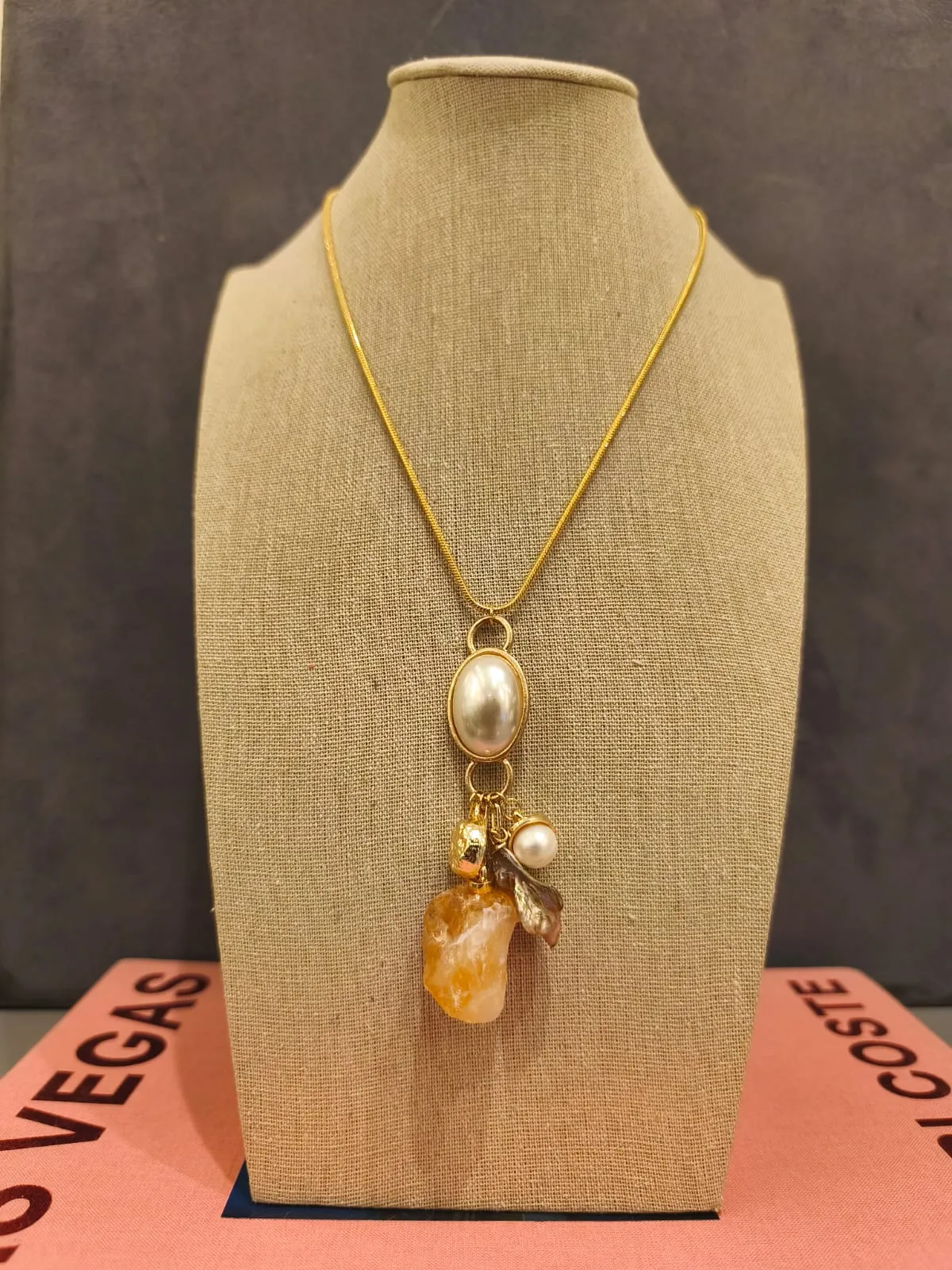 O colar dourado com penca é uma peça que equilibra modernidade e sofisticação, trazendo a força das pedras e a delicadeza das pérolas em um único design. A corrente fina em banho dourado sustenta um pingente com base oval perolada, que confere um ar clássico, e uma penca de elementos naturais, como pedra bruta em tom âmbar, pérola e pequenos detalhes metalizados. O resultado é um colar versátil e cheio de personalidade, ideal para destacar produções do dia a dia ou complementar looks elegantes em ocasiões especiais.
