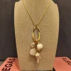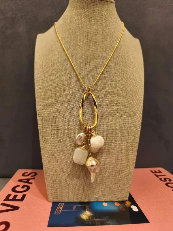 Palavras-chave: colar dourado, colar longo, colar com pérolas, colar madrepérola, colar sofisticado, colar elegante, acessório feminino dourado.