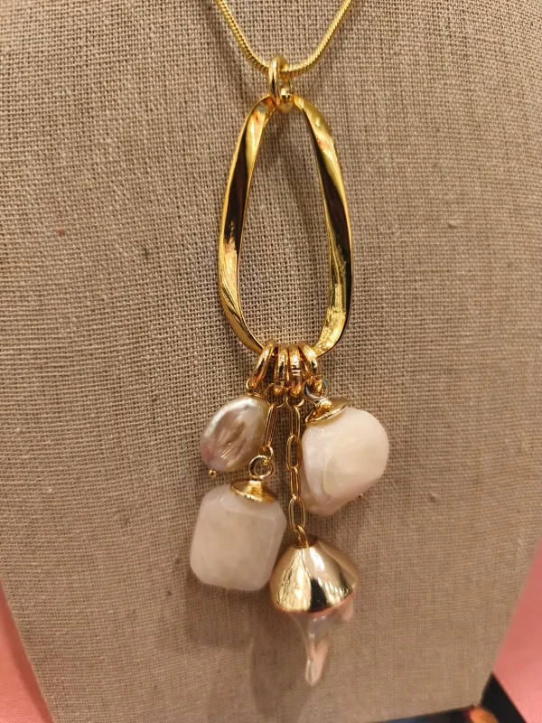 O colar dourado com penca de madrepérola é uma peça sofisticada e cheia de charme, perfeita para mulheres que gostam de acessórios que unem delicadeza e presença. Sua corrente longa e fina em banho dourado valoriza o pingente central em aro martelado, de onde descem pérolas e pedras em diferentes formas, criando um visual orgânico e elegante. O contraste entre o dourado intenso e a suavidade perolada garante modernidade com um toque clássico, tornando-o um acessório versátil que se adapta tanto a looks casuais quanto a produções mais refinadas.