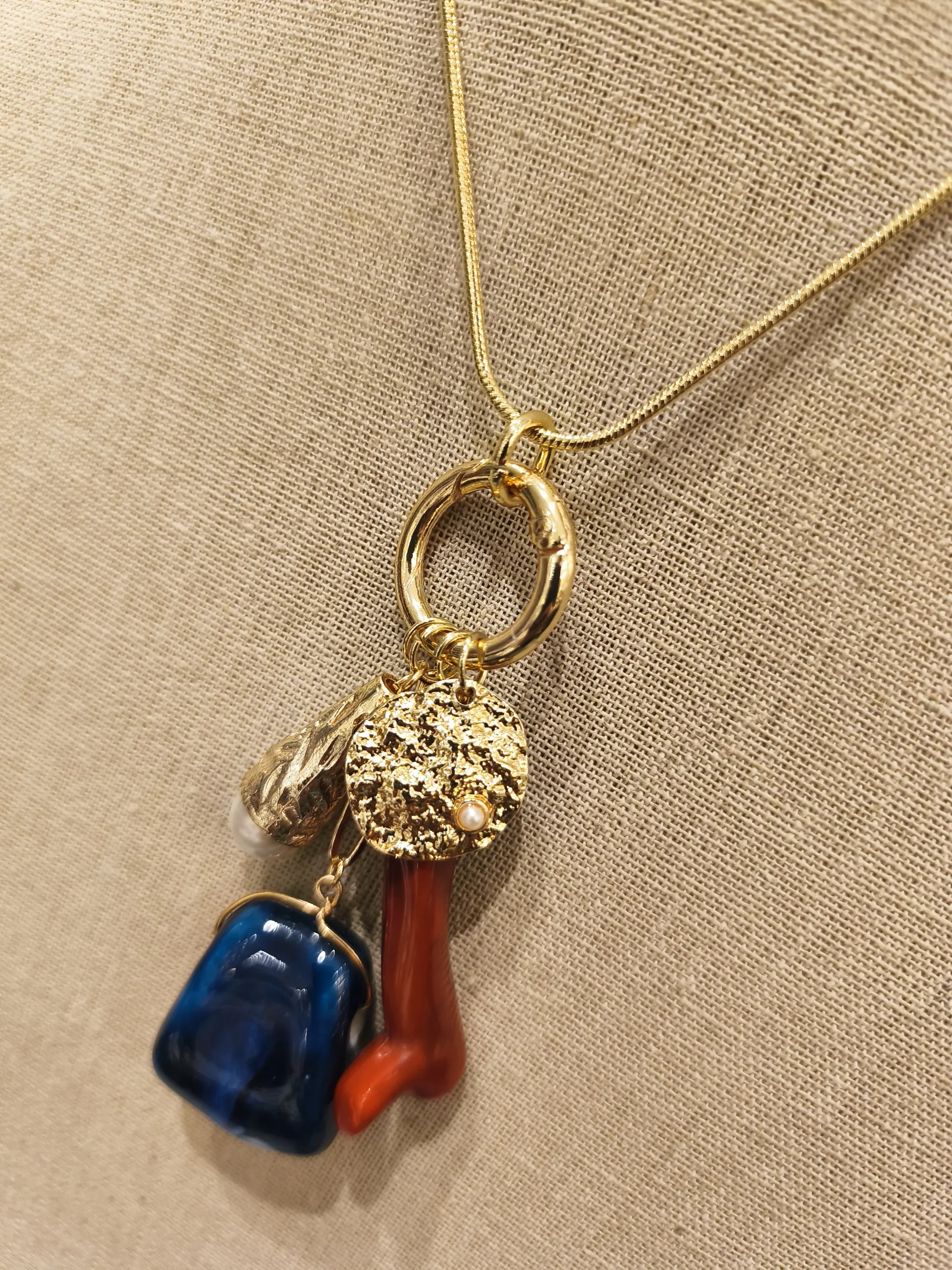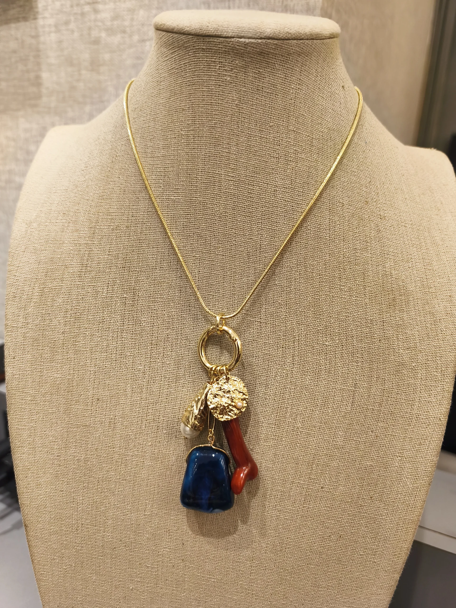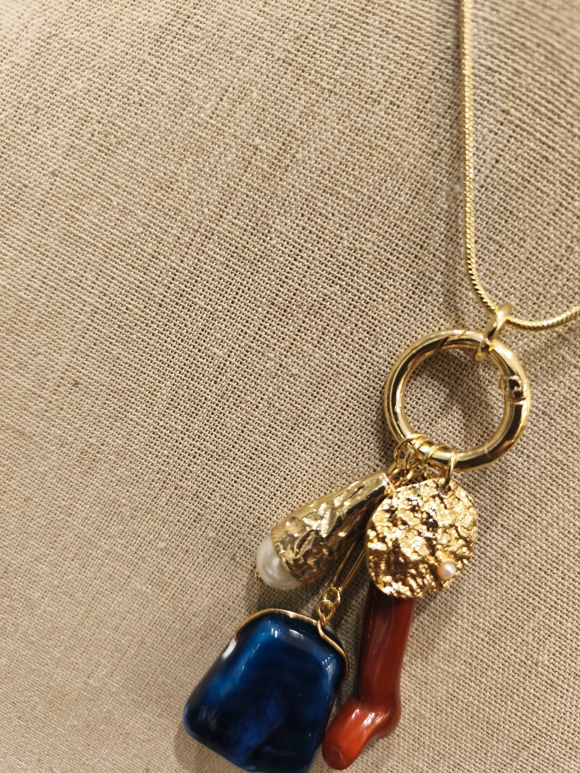Este colar dourado com pingentes de resina 💫✨ é um verdadeiro amuleto de estilo e elegância. A corrente fina e delicada traz leveza e equilíbrio, enquanto o conjunto de pingentes — com pedras em resina azul profundo 💙, coral vermelho 🍂 e detalhes dourados reluzentes 🌟 — cria uma composição cheia de personalidade. O contraste entre as cores vibrantes e o brilho do metal adiciona movimento e charme à peça, perfeita para mulheres que gostam de acessórios versáteis, que unem sofisticação e um toque artesanal.