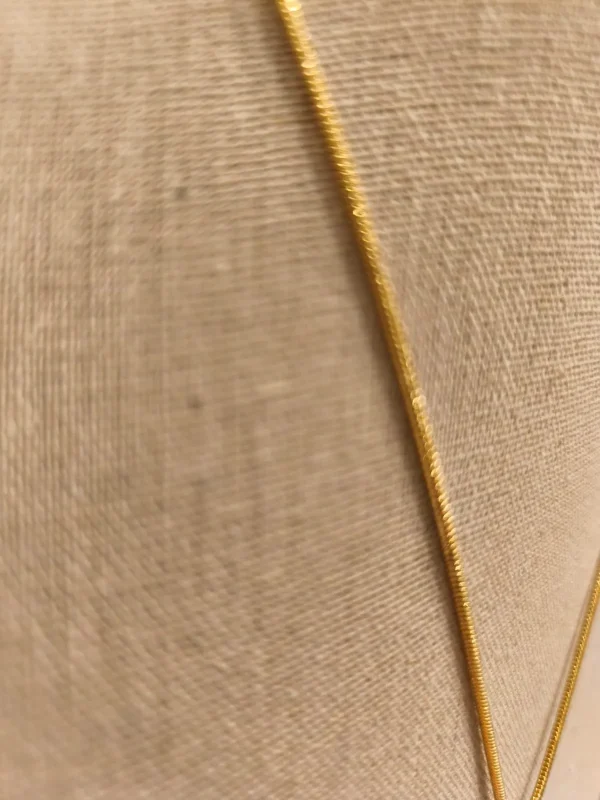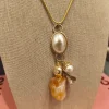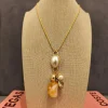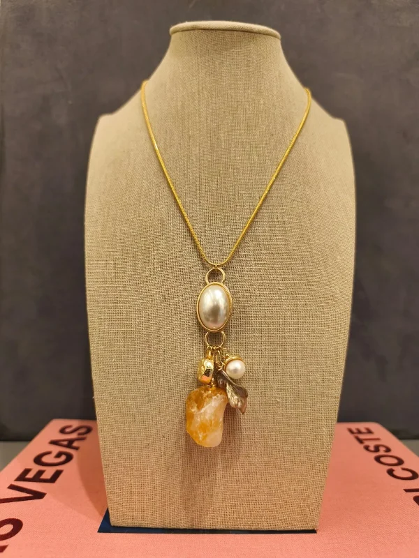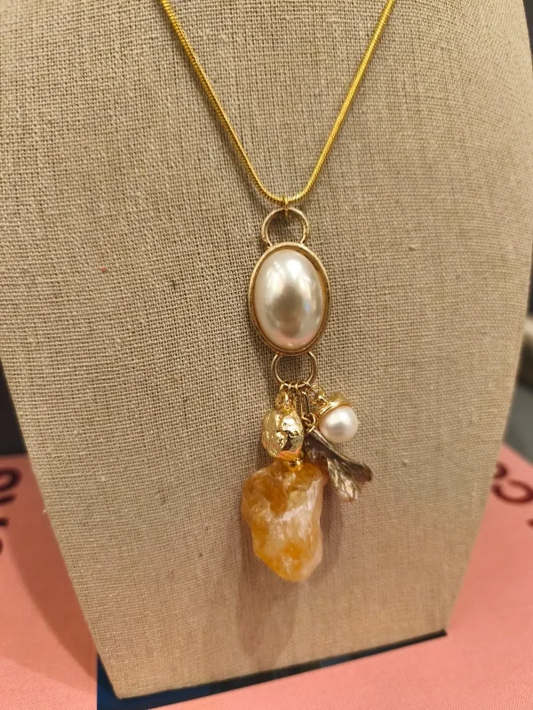 O colar dourado com penca é uma peça que equilibra modernidade e sofisticação, trazendo a força das pedras e a delicadeza das pérolas em um único design. A corrente fina em banho dourado sustenta um pingente com base oval perolada, que confere um ar clássico, e uma penca de elementos naturais, como pedra bruta em tom âmbar, pérola e pequenos detalhes metalizados. O resultado é um colar versátil e cheio de personalidade, ideal para destacar produções do dia a dia ou complementar looks elegantes em ocasiões especiais.