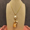 Ficha técnica: confeccionado em metal com banho dourado, corrente fina com pingente em base oval perolada e penca de pedra bruta âmbar, pérola artificial e detalhes metalizados. Cor dourada com detalhes perolados e naturais. Origem nacional. Para conservar, evite contato com água, perfumes ou produtos químicos e guarde em caixa ou saquinho de tecido.