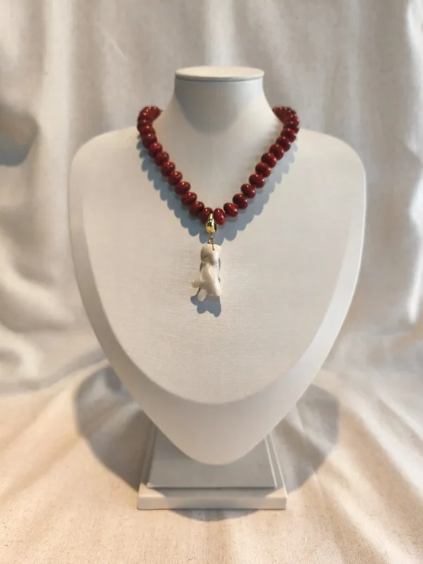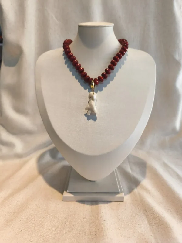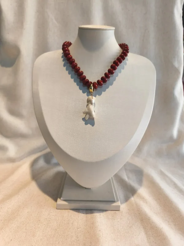 As esferas em tom vermelho profundo trazem intensidade e sofisticação, enquanto o pingente claro com acabamento dourado adiciona um toque artesanal e cheio de personalidade.