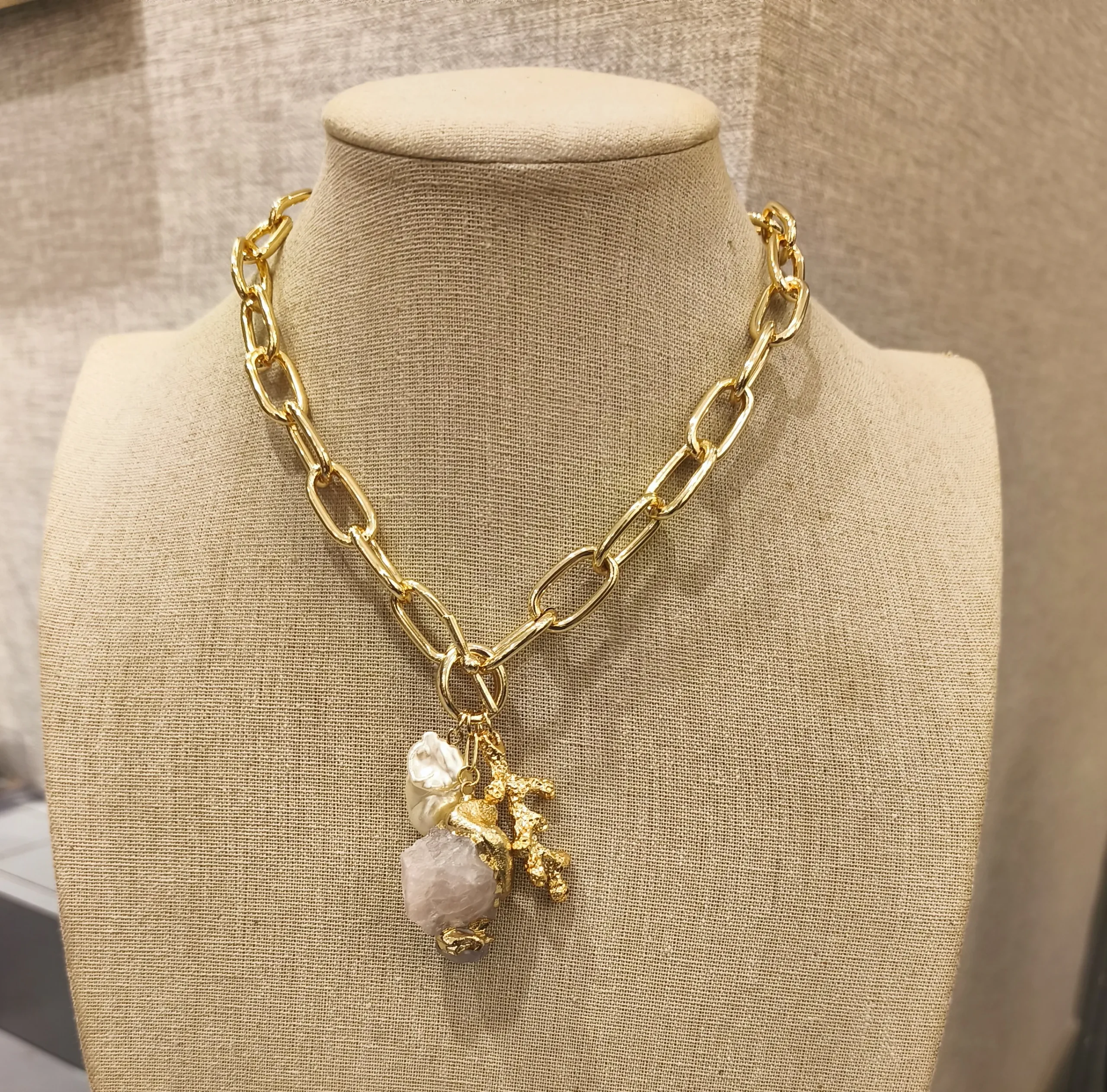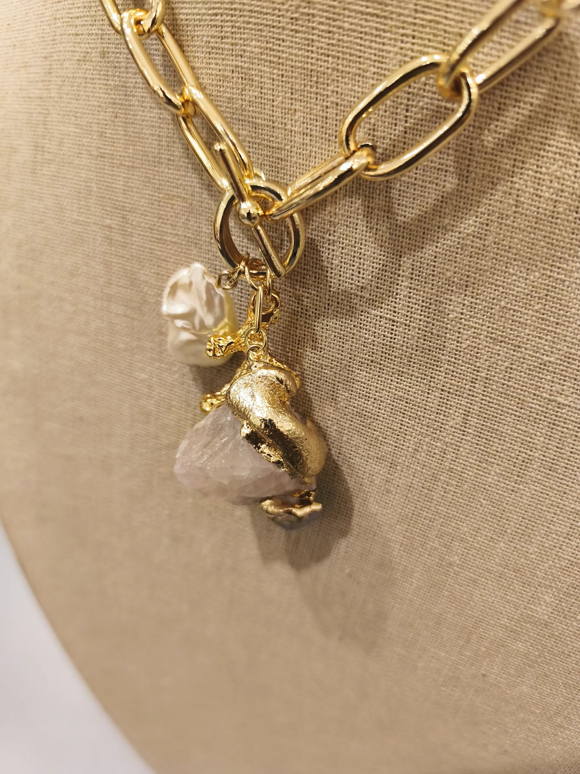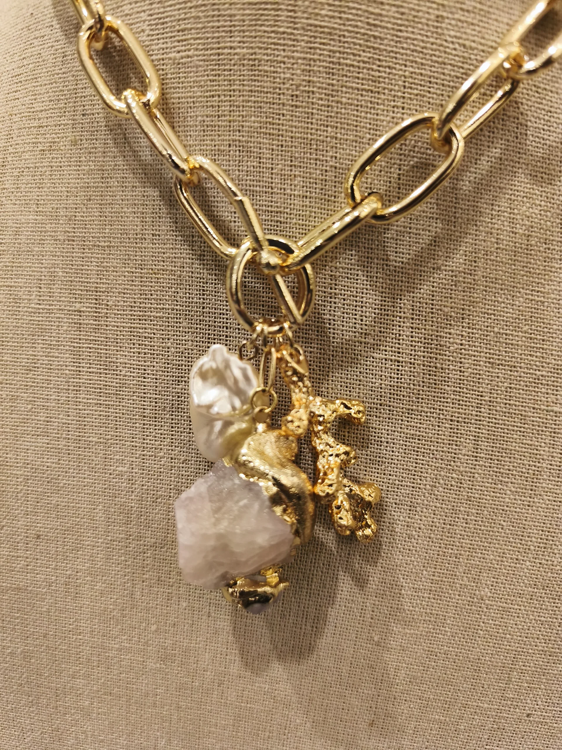Este colar dourado com pérola ✨ é a definição de elegância moderna. Com elos largos e acabamento polido, ele traz a força do design contemporâneo combinada à delicadeza atemporal da pérola — um contraste irresistível entre o poder e a suavidade. O pingente central, formado por uma bela pérola natural 🤍 e um detalhe orgânico em dourado 🌿, cria um ponto de luz sofisticado e versátil, perfeito para destacar o colo com naturalidade. É uma peça que transita com facilidade entre o clássico e o atual, ideal para mulheres que amam elegância sem esforço e presença em cada detalhe.