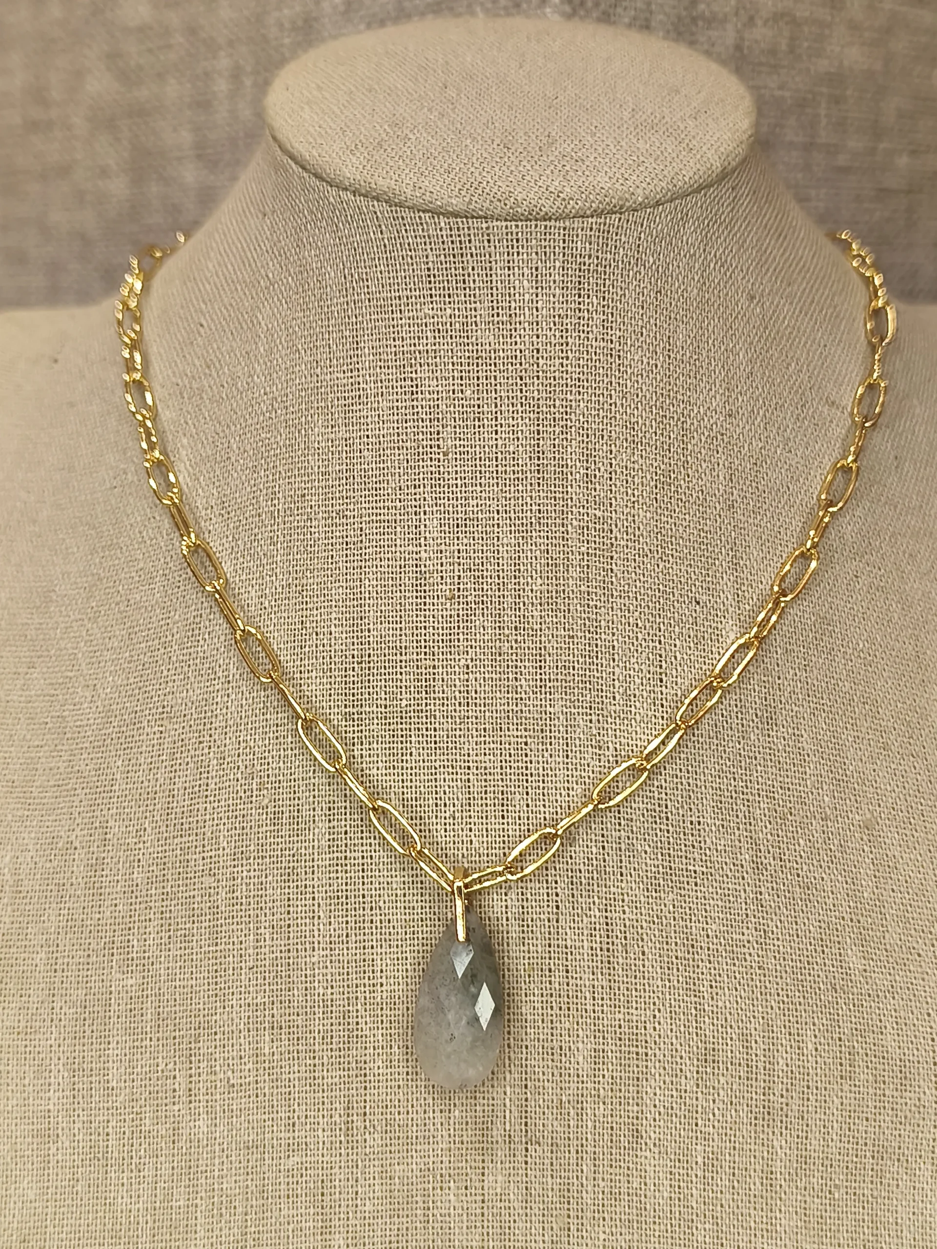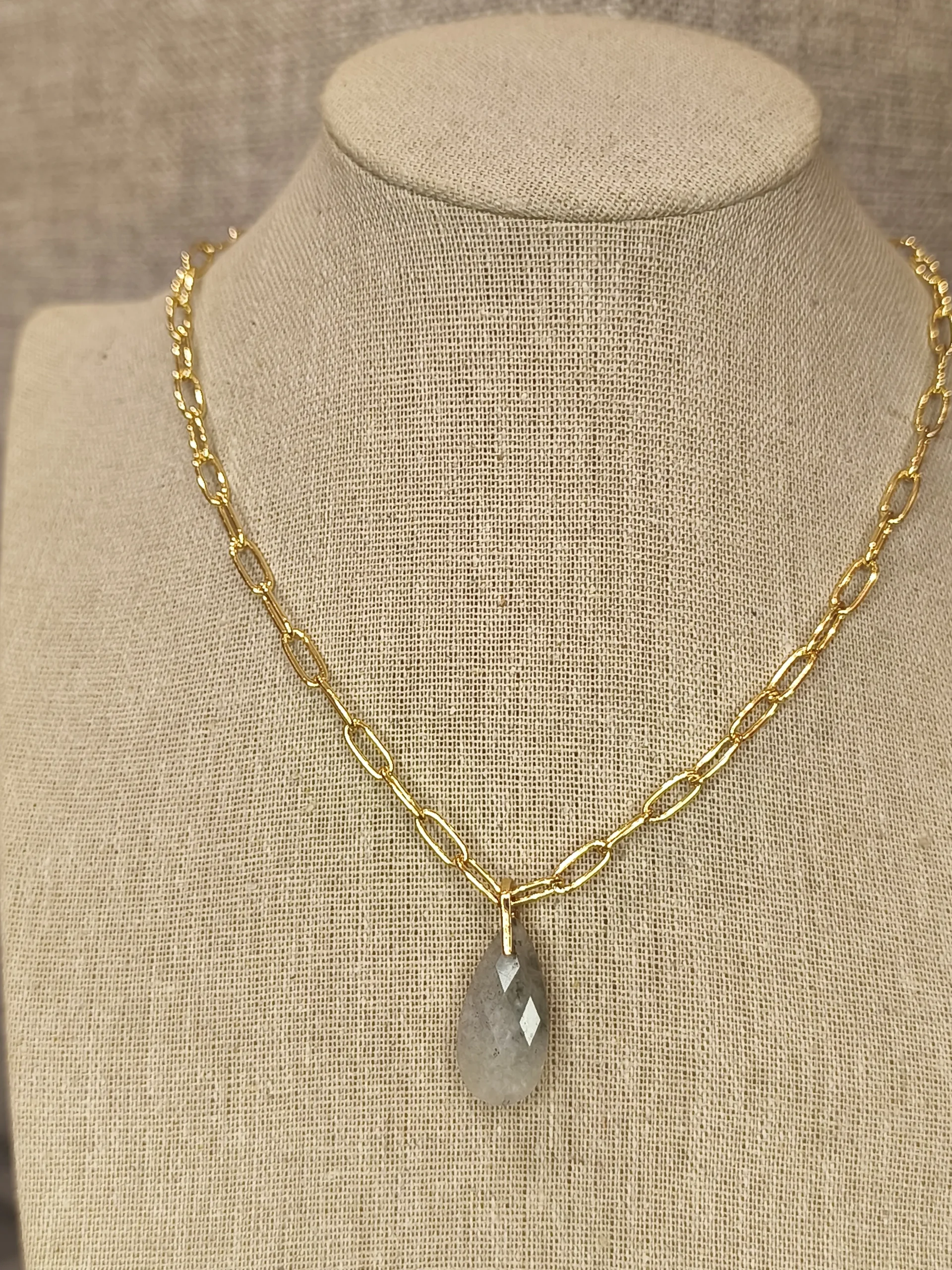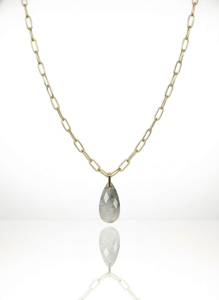 Ficha técnica: composição em metal dourado resistente com pingente em forma de gota em acabamento polido, modelagem com elos alongados e ponto focal central, cores dourado e cinza translúcido, origem nacional e cuidados que incluem evitar contato com água, perfumes e cremes, além de guardar em local seco e protegido da luz.