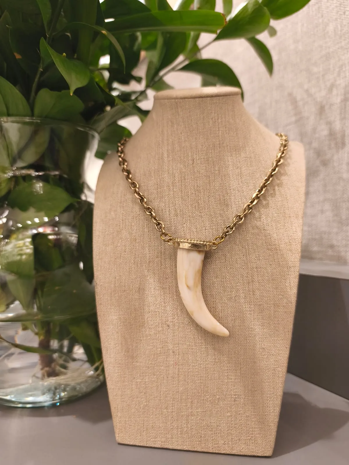 O colar dourado PG marfim off é uma peça de destaque que une força e elegância em um design moderno e atemporal. A corrente dourada robusta realça o pingente em formato de dente alongado, feito em resina marfim com delicados veios naturais, resultando em um visual sofisticado e com toque artesanal. É o acessório perfeito para quem busca estilo marcante sem abrir mão da sofisticação.