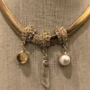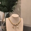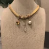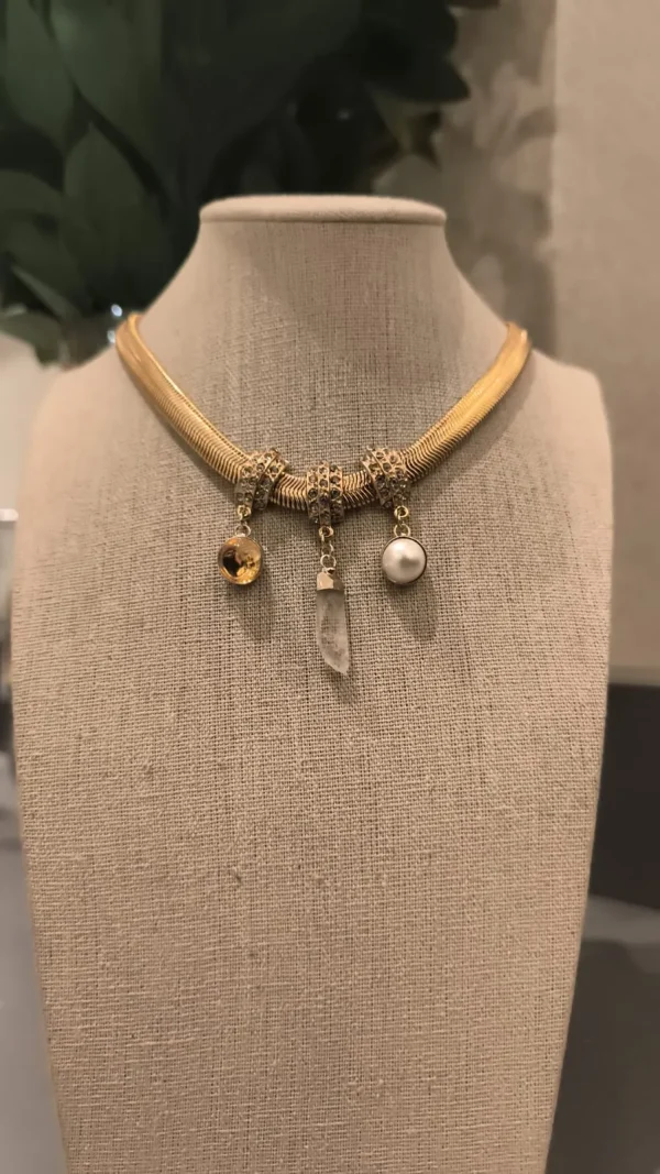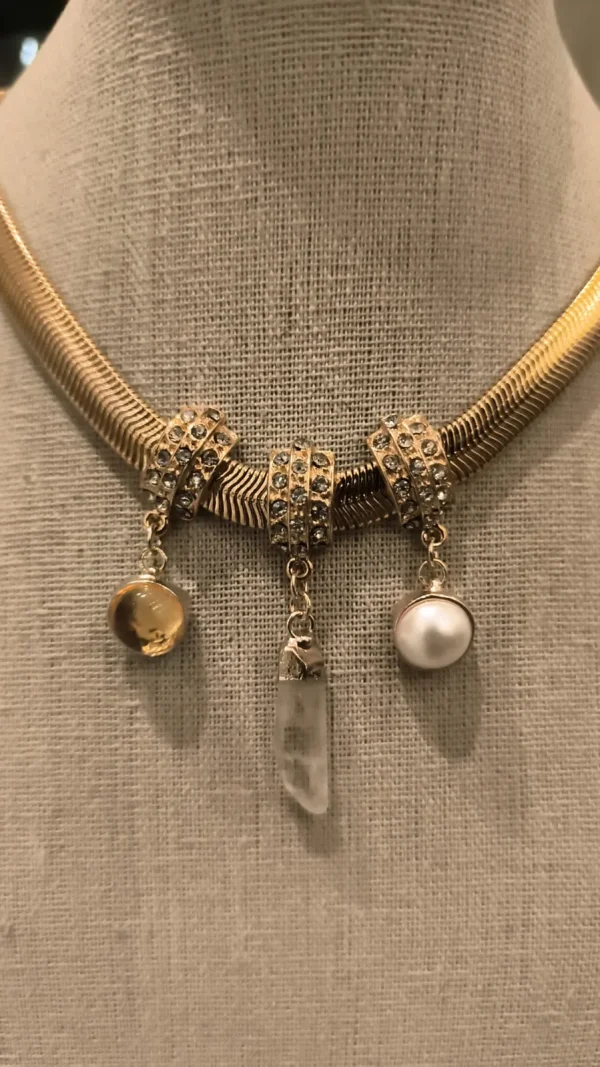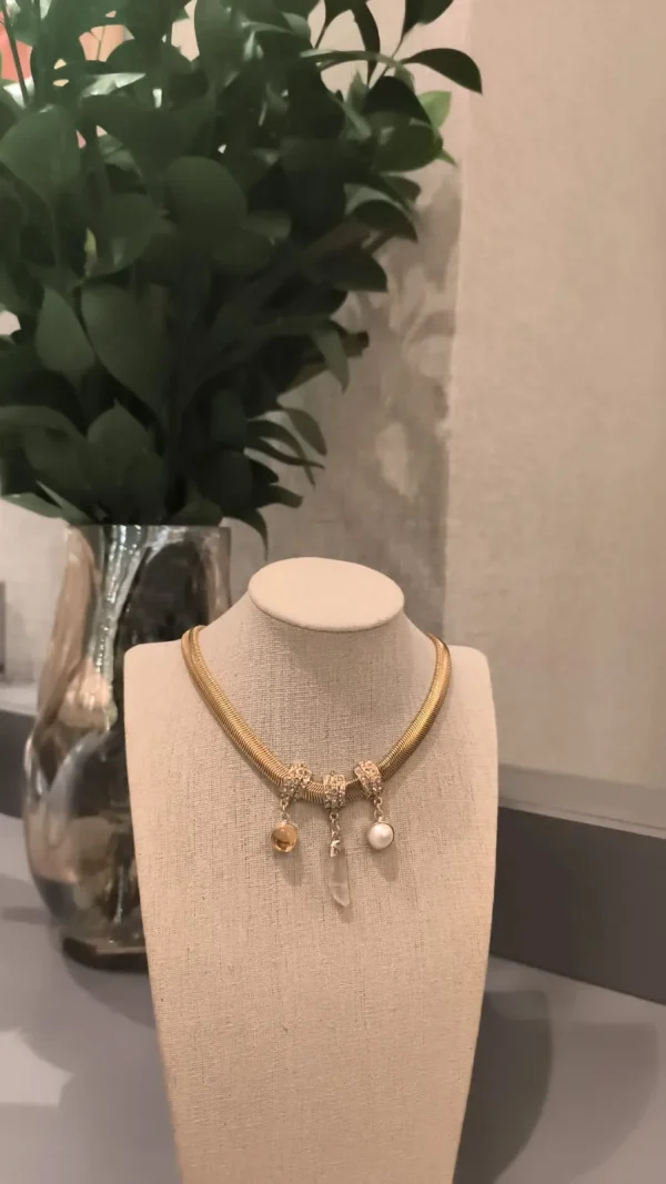 Corrente dourada robusta com design estruturado e três pingentes charmosos: esfera dourada, cristal translúcido e pérola 🌟🔮🤍. Um acessório sofisticado que combina brilho, textura e movimento, ideal para destacar o colo com estilo e autenticidade 💫💛
